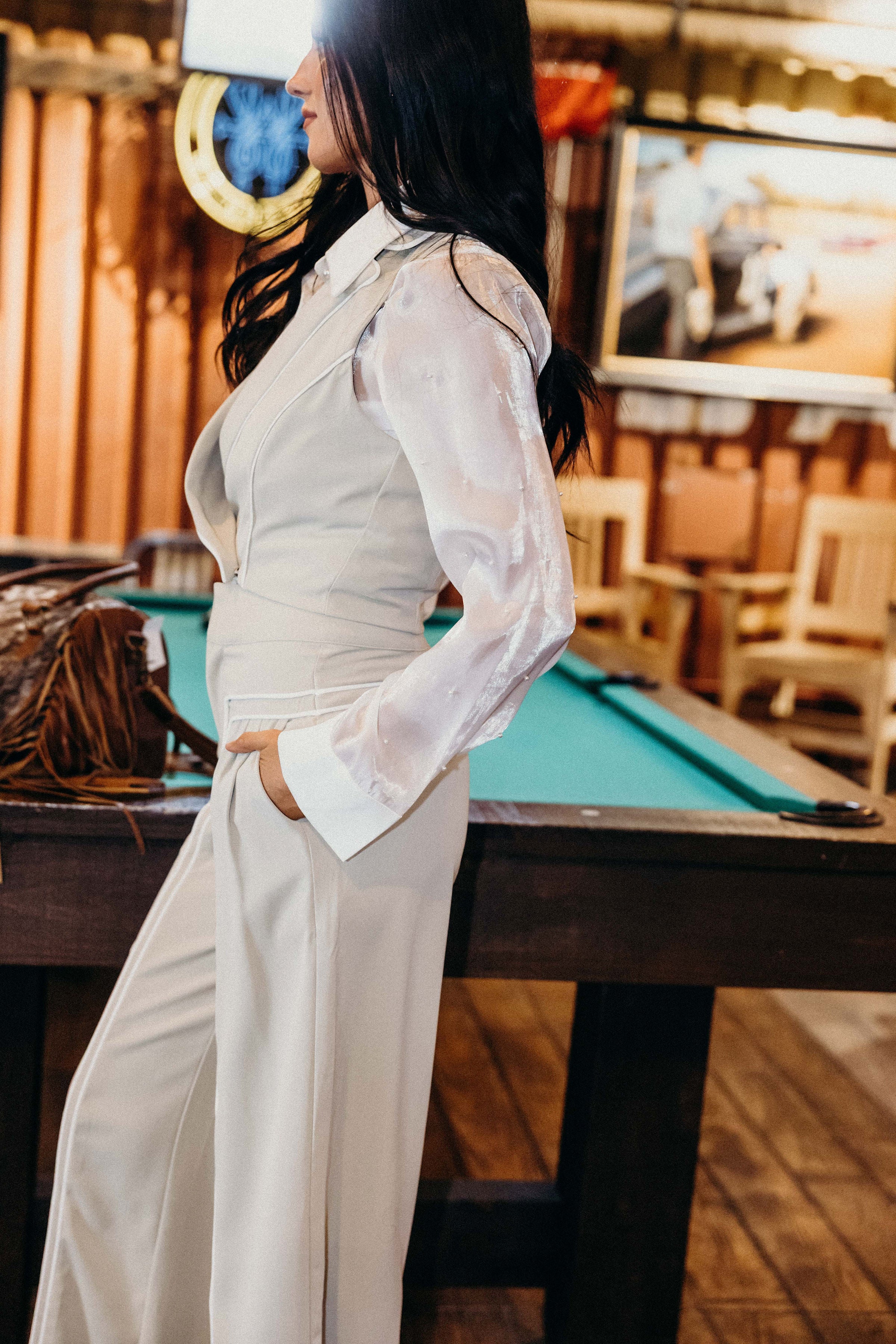 The Carden Shirt is a white, sheer long-sleeve blouse designed for effortless winter layering. Featuring elegant pearl detailing, a classic collar, and button-down front, it brings a refined touch to any outfit. Lightweight yet stylish, this versatile piece enhances your wardrobe with sophisticated charm and warmth when layered.