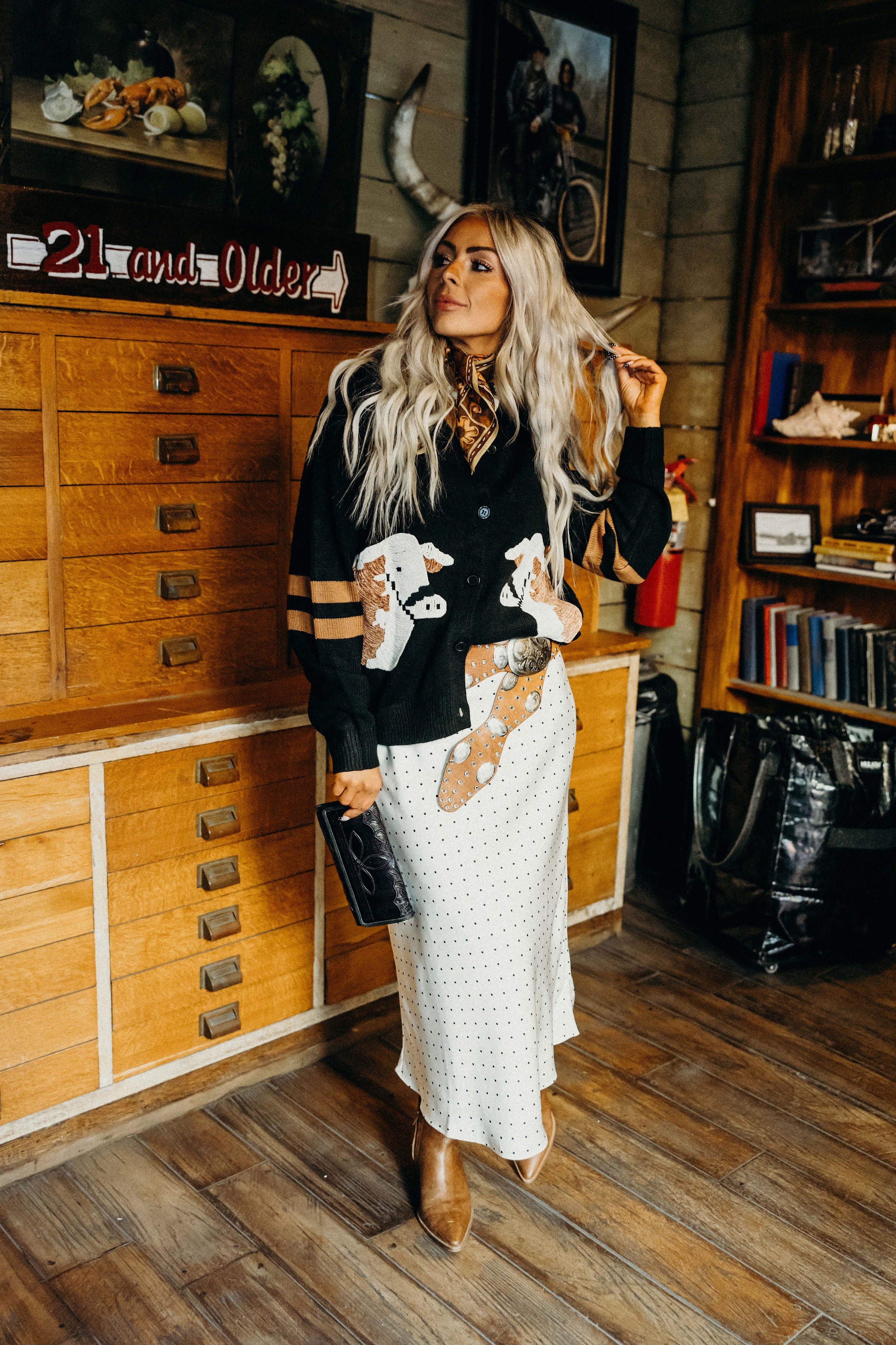 Embrace cozy western vibes with The Cattle Cardi, featuring a bold black cow graphic and playful striped elbows. This button-down cardigan blends rustic charm with winter warmth, perfect for showing off your NFR spirit while staying snug and stylish all season long.