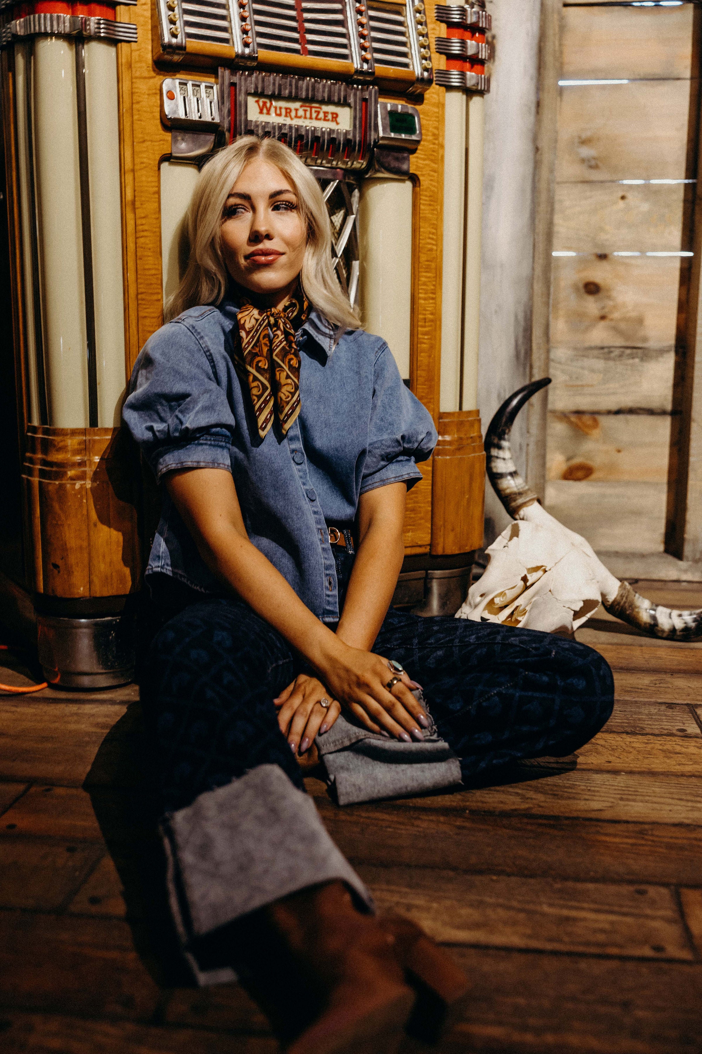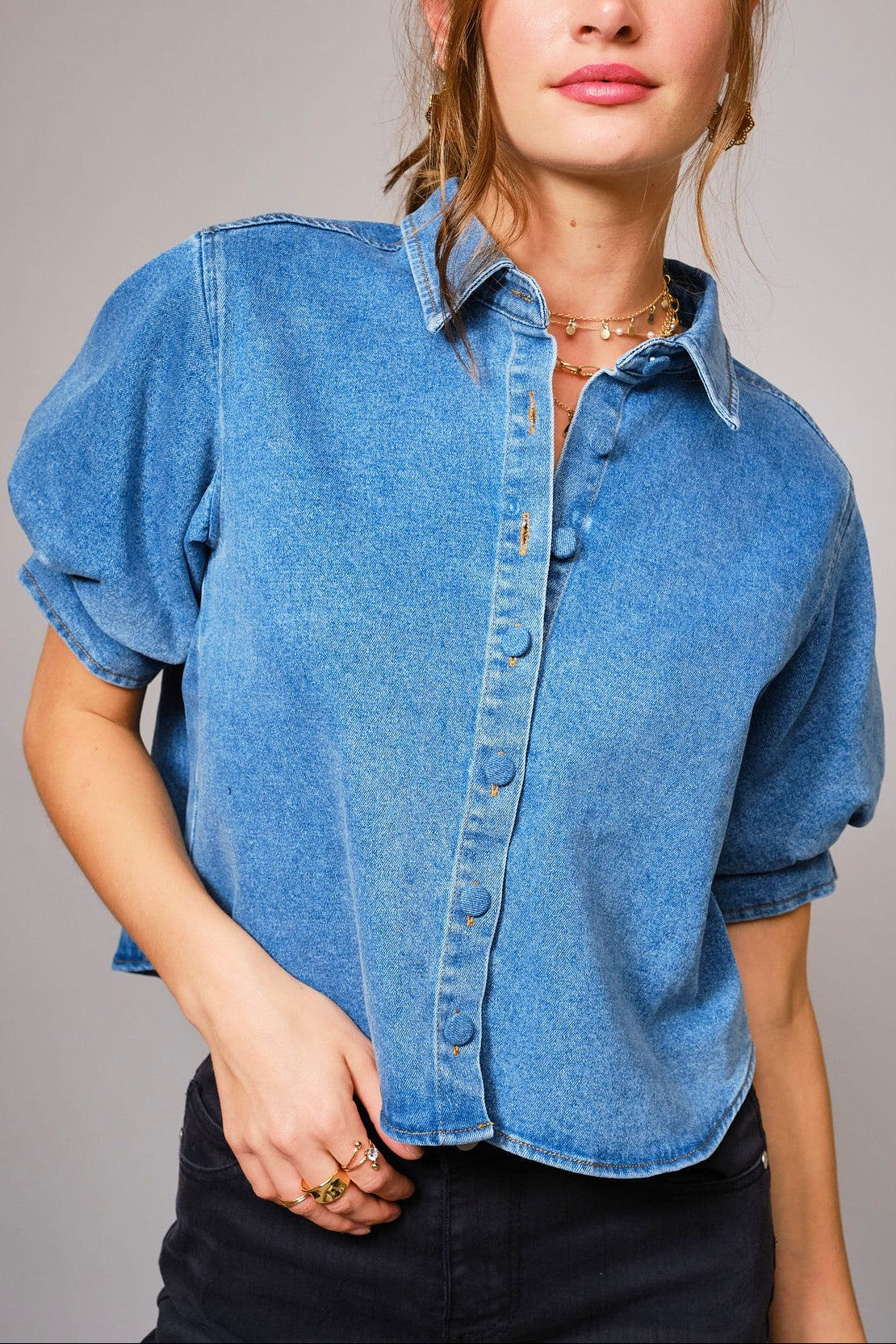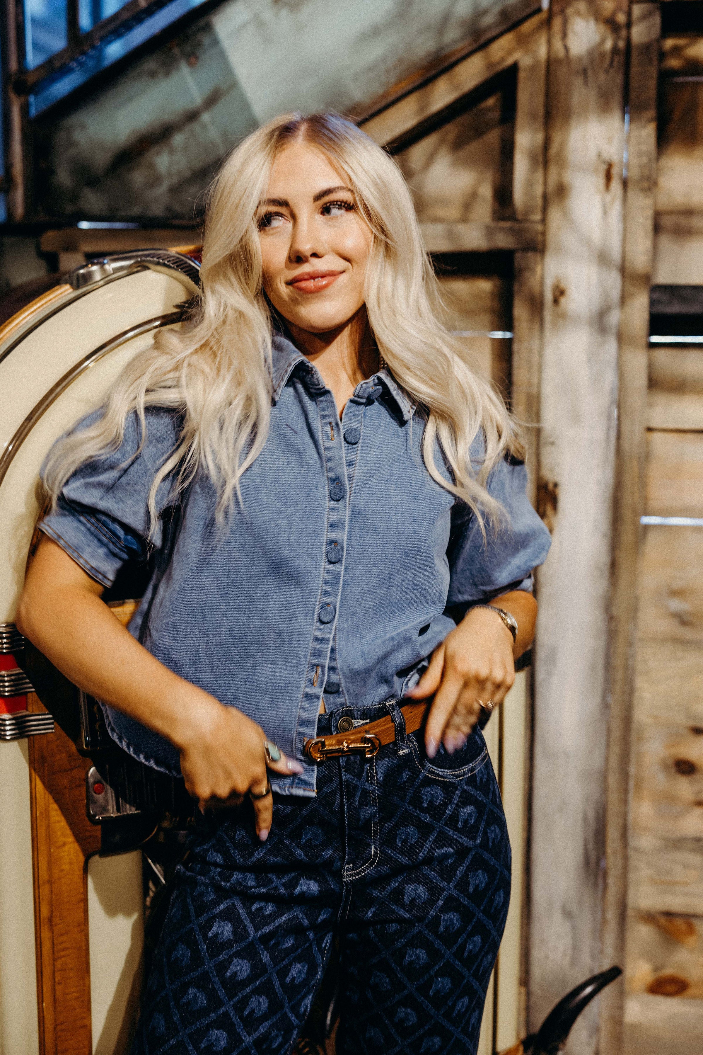 The Chesney Blouse brings a fun twist to classic western style with its medium wash denim and boxy silhouette. Featuring short puff sleeves and a timeless button-down front, this playful top combines a classic collar with a flattering shape that’s perfect for effortless everyday cool. Dress it up or down for a look that’s equal parts charming and casual.