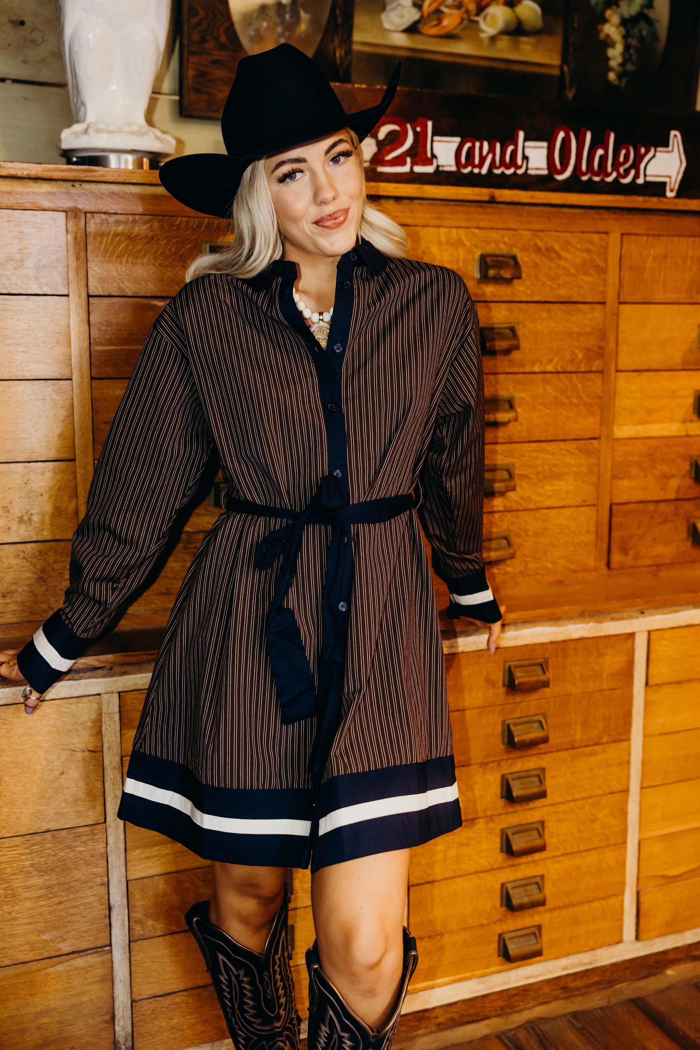 Step into winter with The Headliner Dress, a playful twist on western style. Featuring a brown multi striped print and mini length, this button-down dress is accented by a navy contrast neckline and button placket. Long puff sleeves and a navy tie sash add flair, while the lined fabric keeps you cozy during chilly days. Perfect for the NFR or everyday adventures with a bold, fun edge.