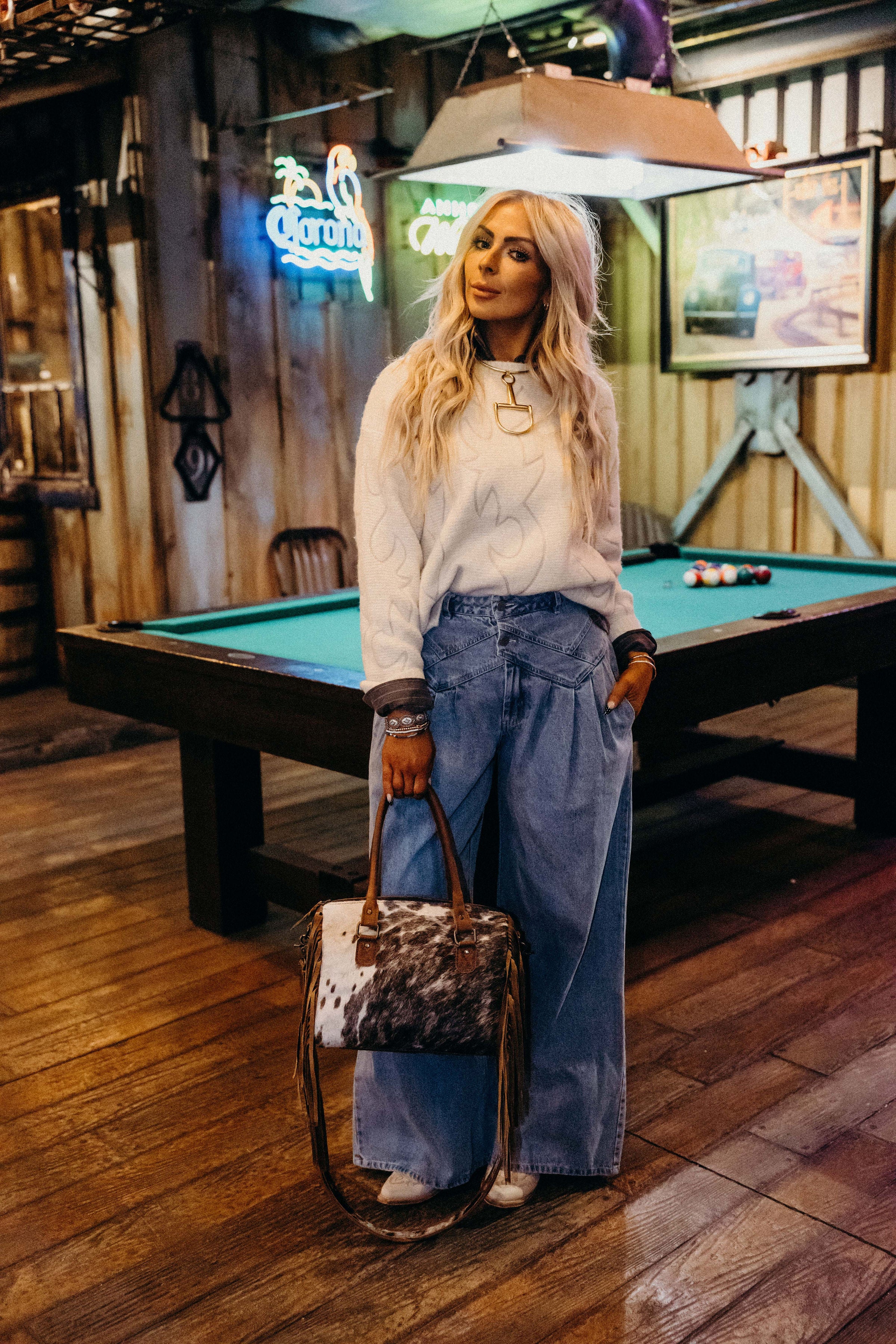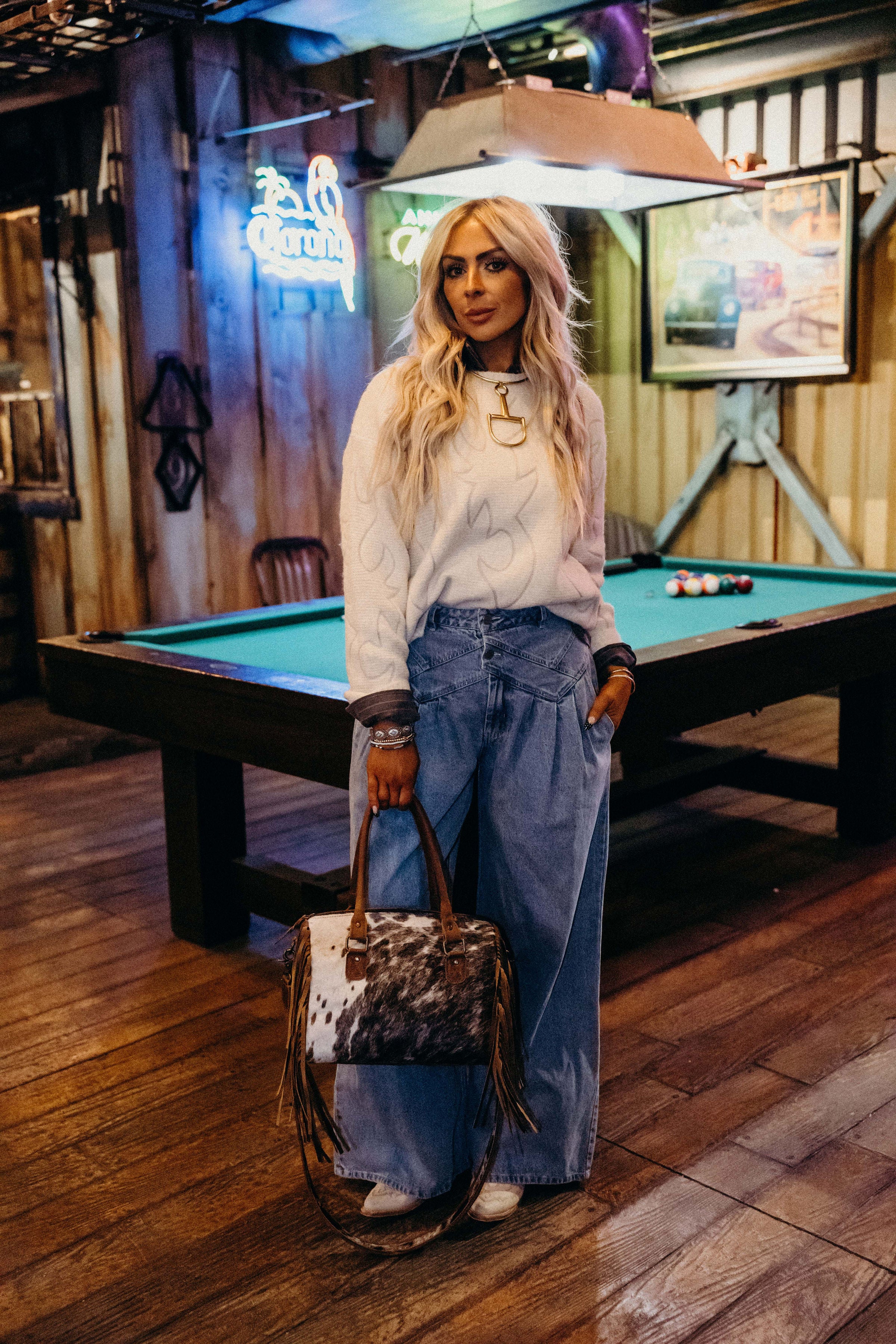 The Kanab sweater combines comfort with standout style. Its cozy crew neck and soft, warm fabric blend make it ideal for cooler days, while the distinctive western boots stitch pattern adds a unique flair to your look. Elevate your wardrobe effortlessly with this perfect blend of warmth and western-inspired design.