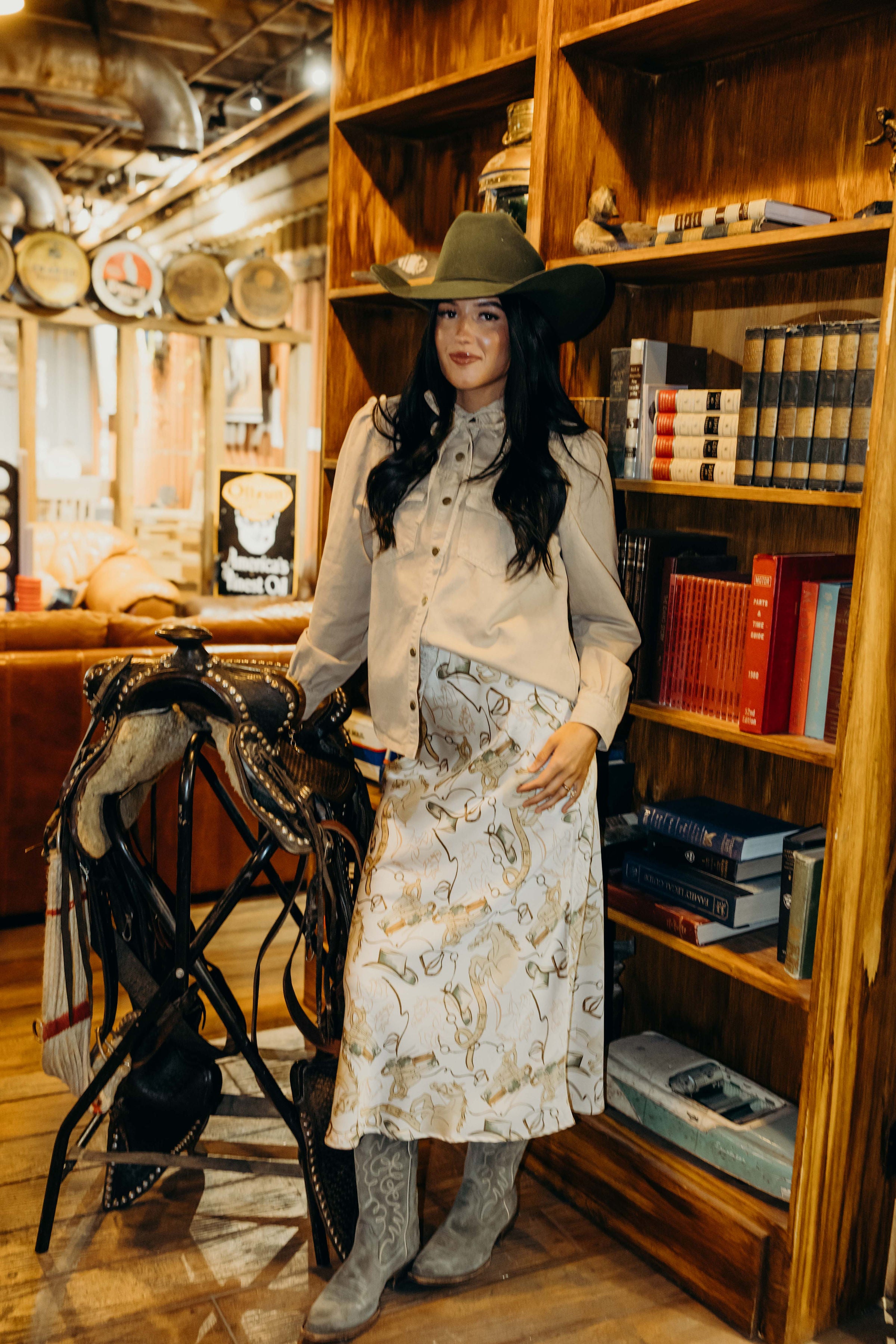 The Salem Top brings a playful twist to classic western style with its beige denim fabric and charming button down front. Featuring a collared tie neck and puff sleeves, this top adds a flirty, fun vibe perfect for fall layering. Whether you’re mixing it with your favorite jeans or dressing it up, it promises cozy comfort with a stylish punch.