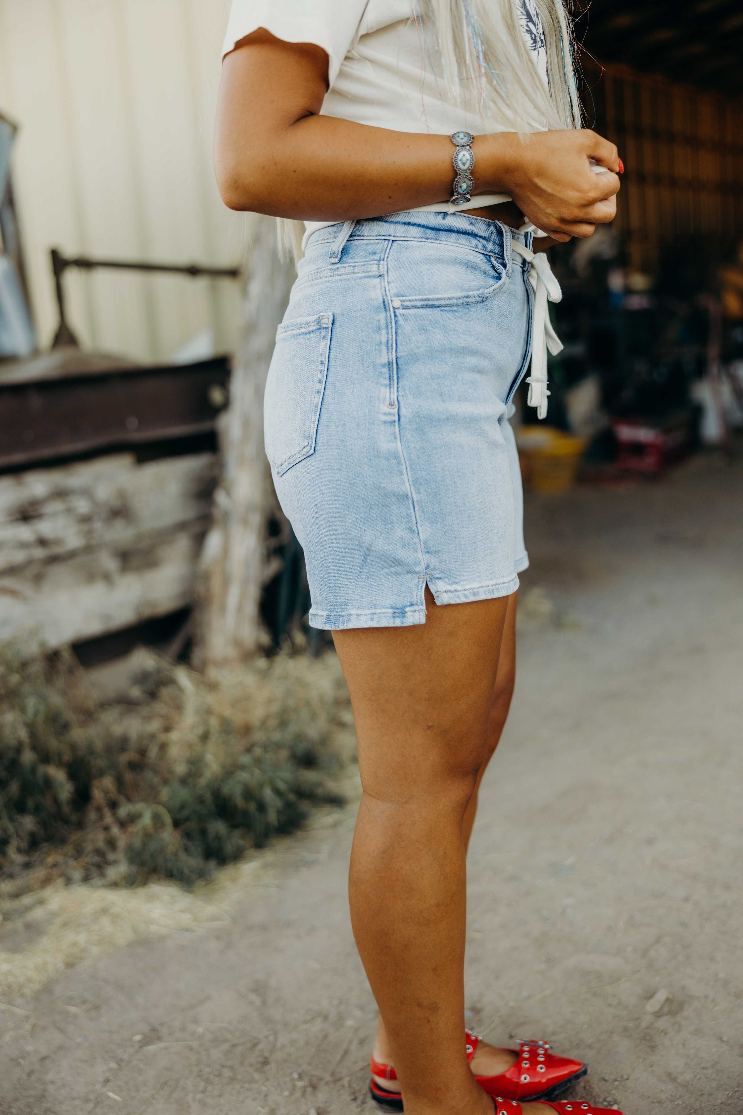 The Dodger Shorts bring summer vibes with their medium wash denim and playful waist strap detail. Designed with comfort stretch and a high-rise fit, these western-inspired Bermuda shorts offer a relaxed, straight-leg silhouette perfect for sunny days. Embrace effortless style and all-day comfort in these must-have shorts.