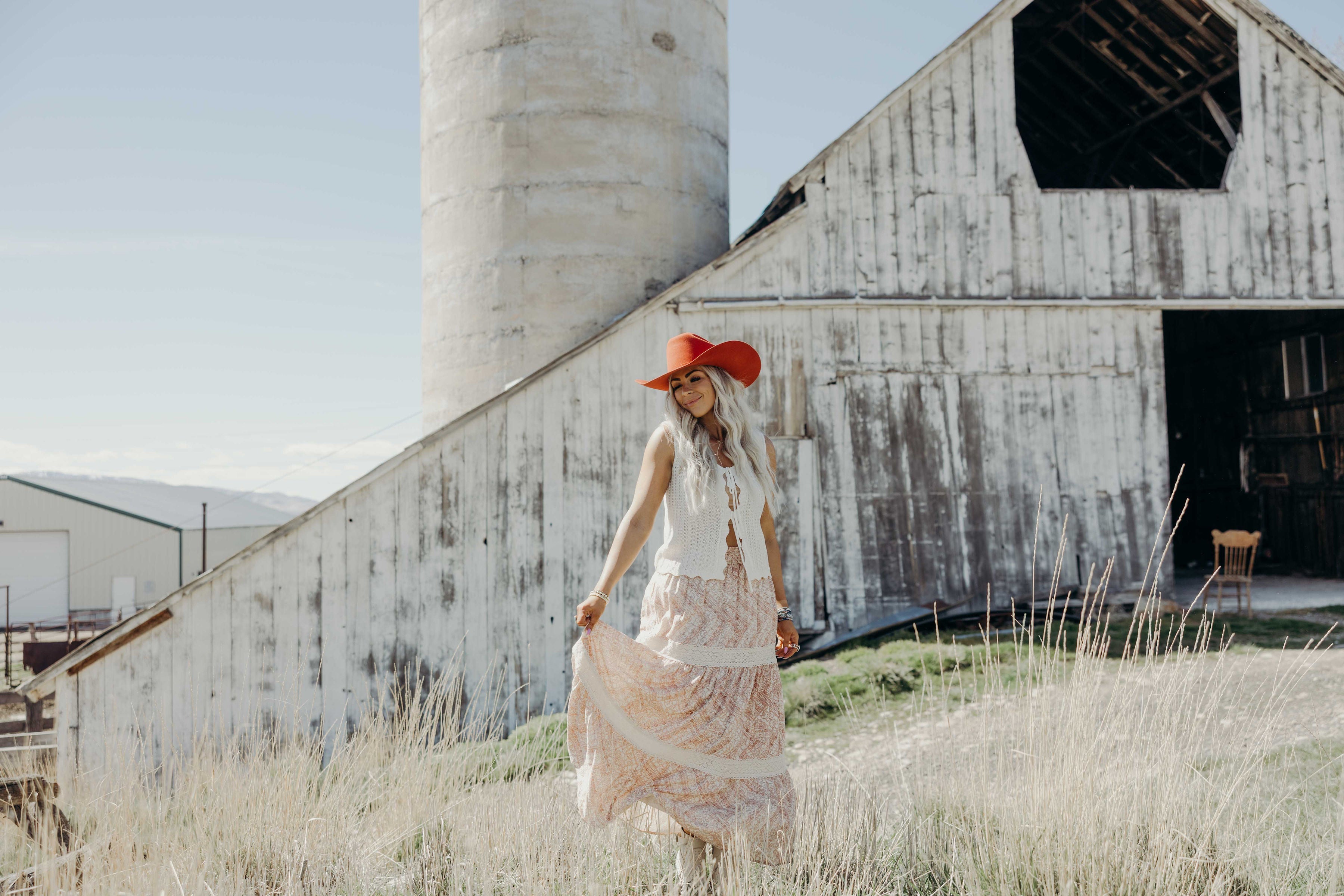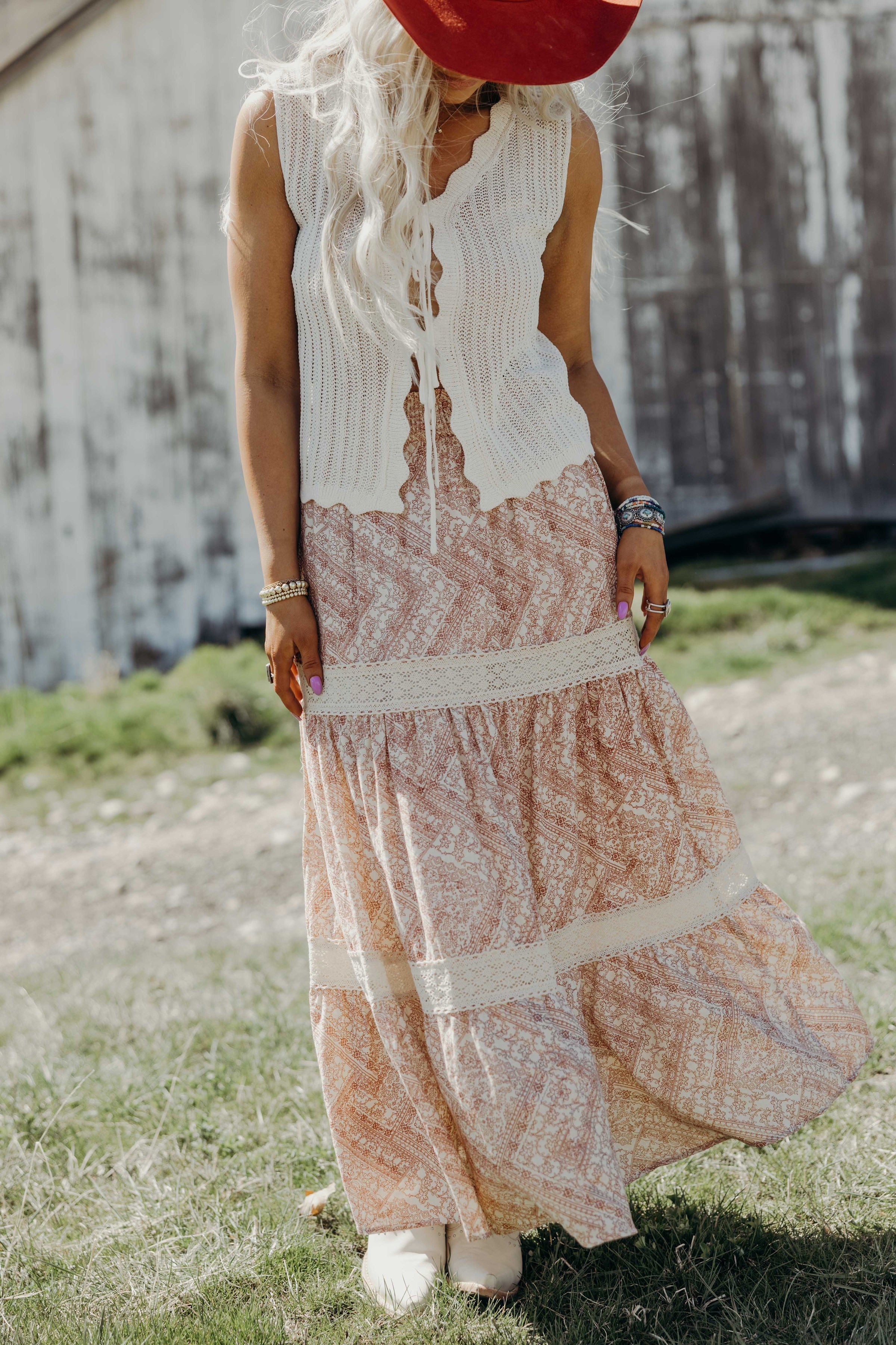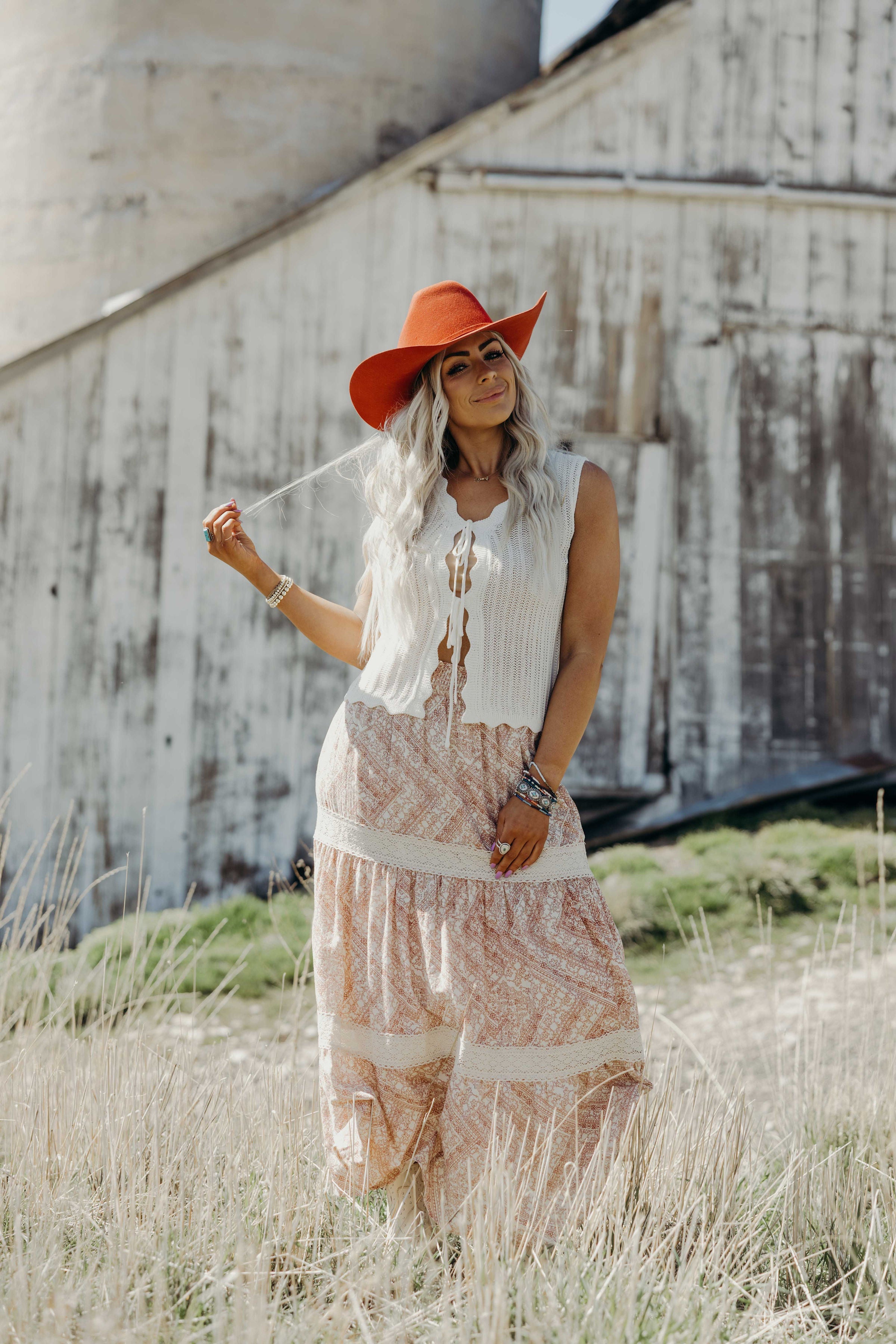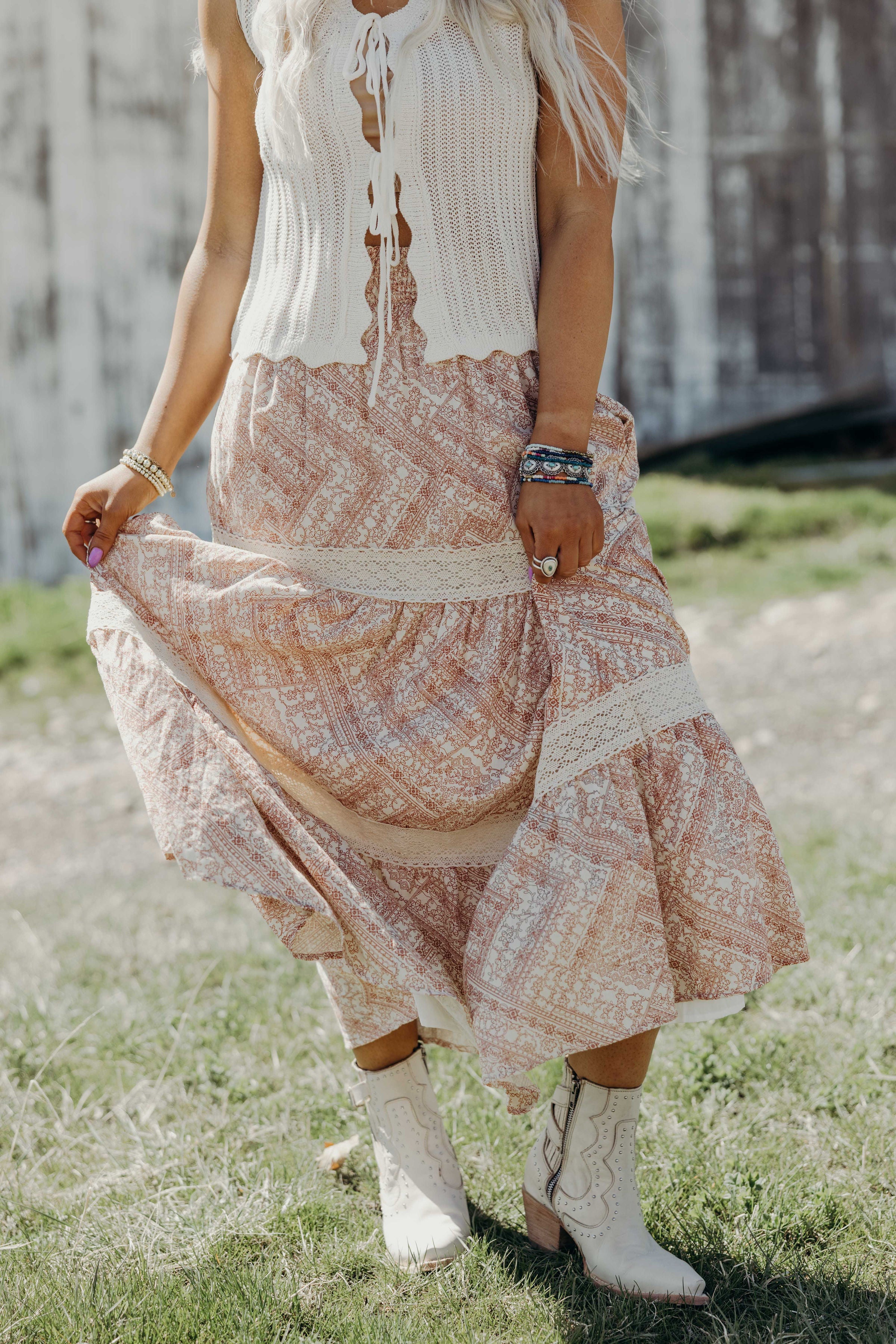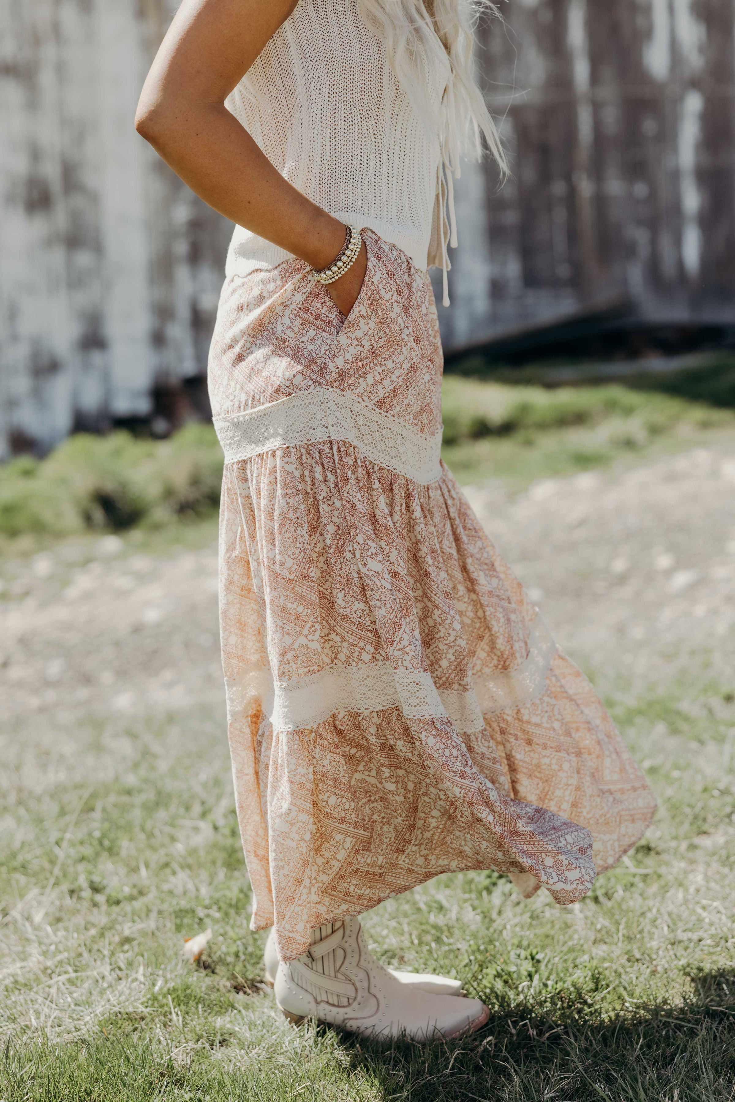 The Poplin Skirt features a beautiful pink prism color and floral print, accented by delicate lace detailing. With a flattering ruched waist and a flowing maxi length, this skirt is perfect for spring. Its western-inspired design adds a touch of boho to any outfit.