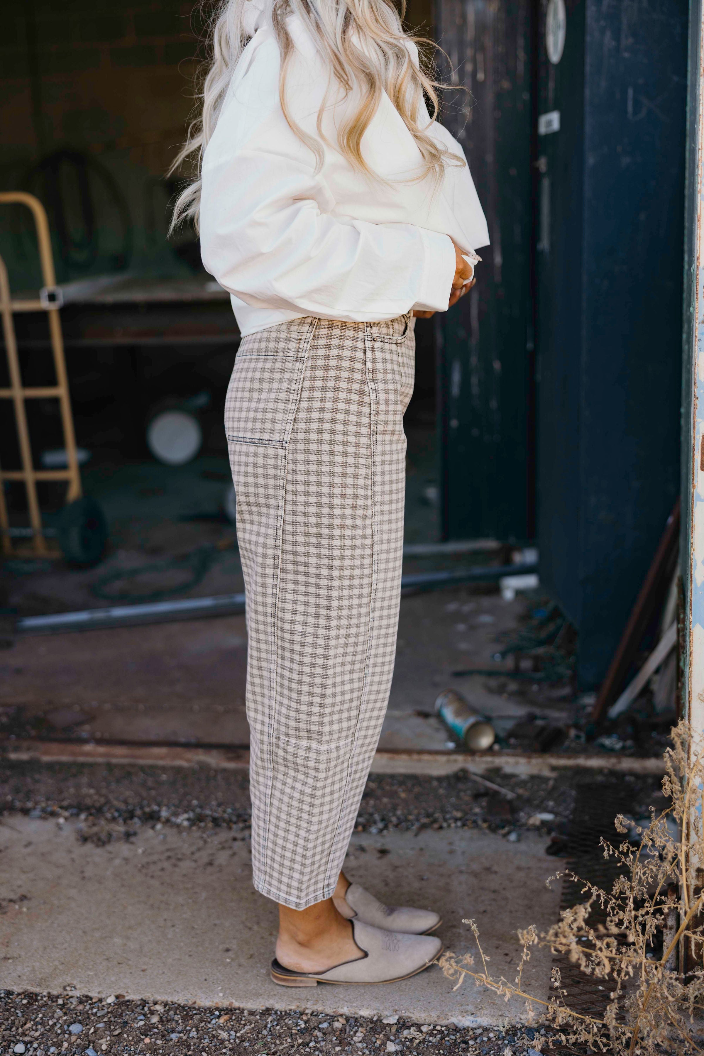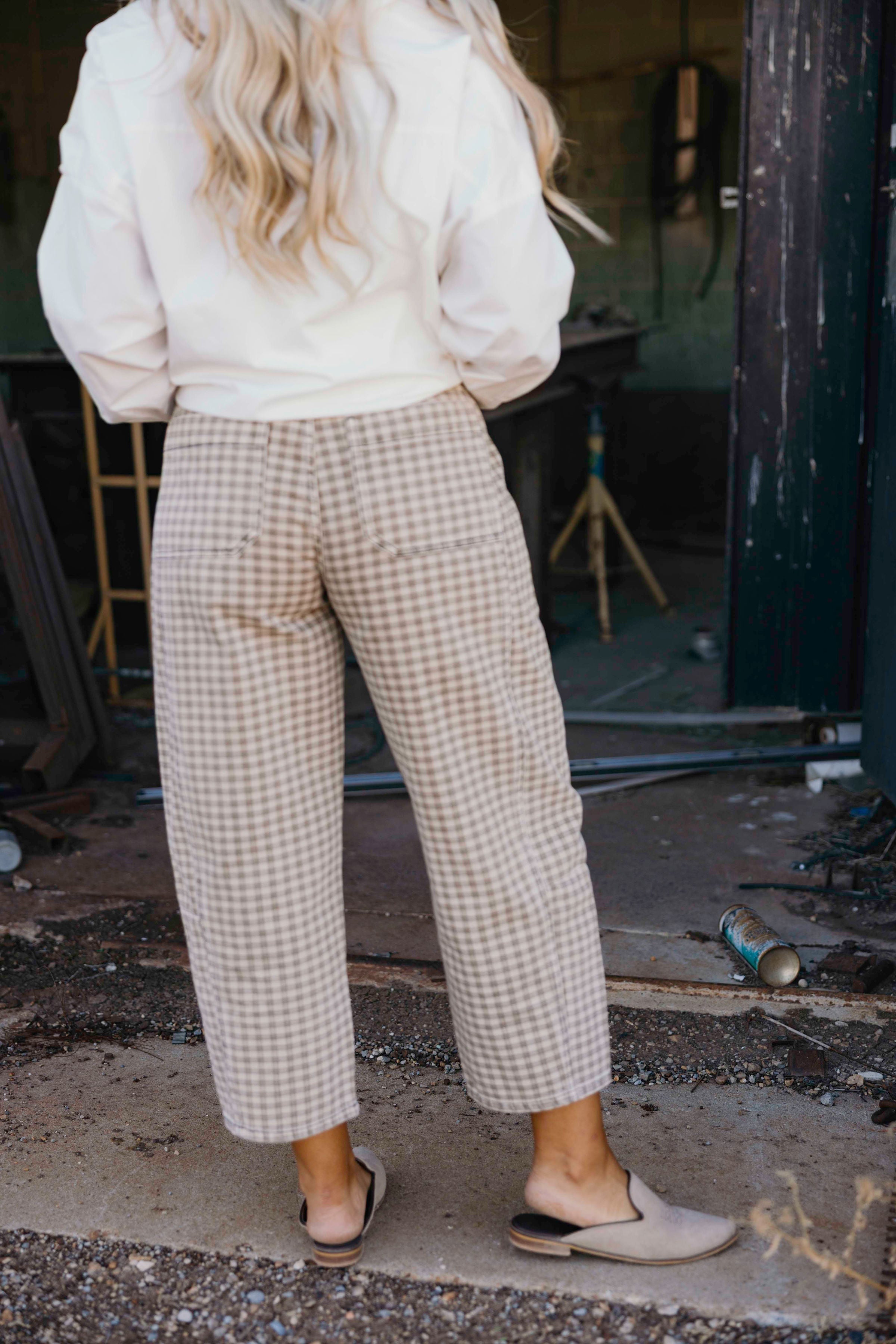 Step into cozy fall vibes with The Shepherd Pants. Featuring a playful tan and brown checkered plaid print, these western-inspired pants offer a slight barrel silhouette and a fun cropped length. Mid-rise and perfectly tailored for the season, they add a trendy twist to your autumn wardrobe while keeping comfort front and center.
