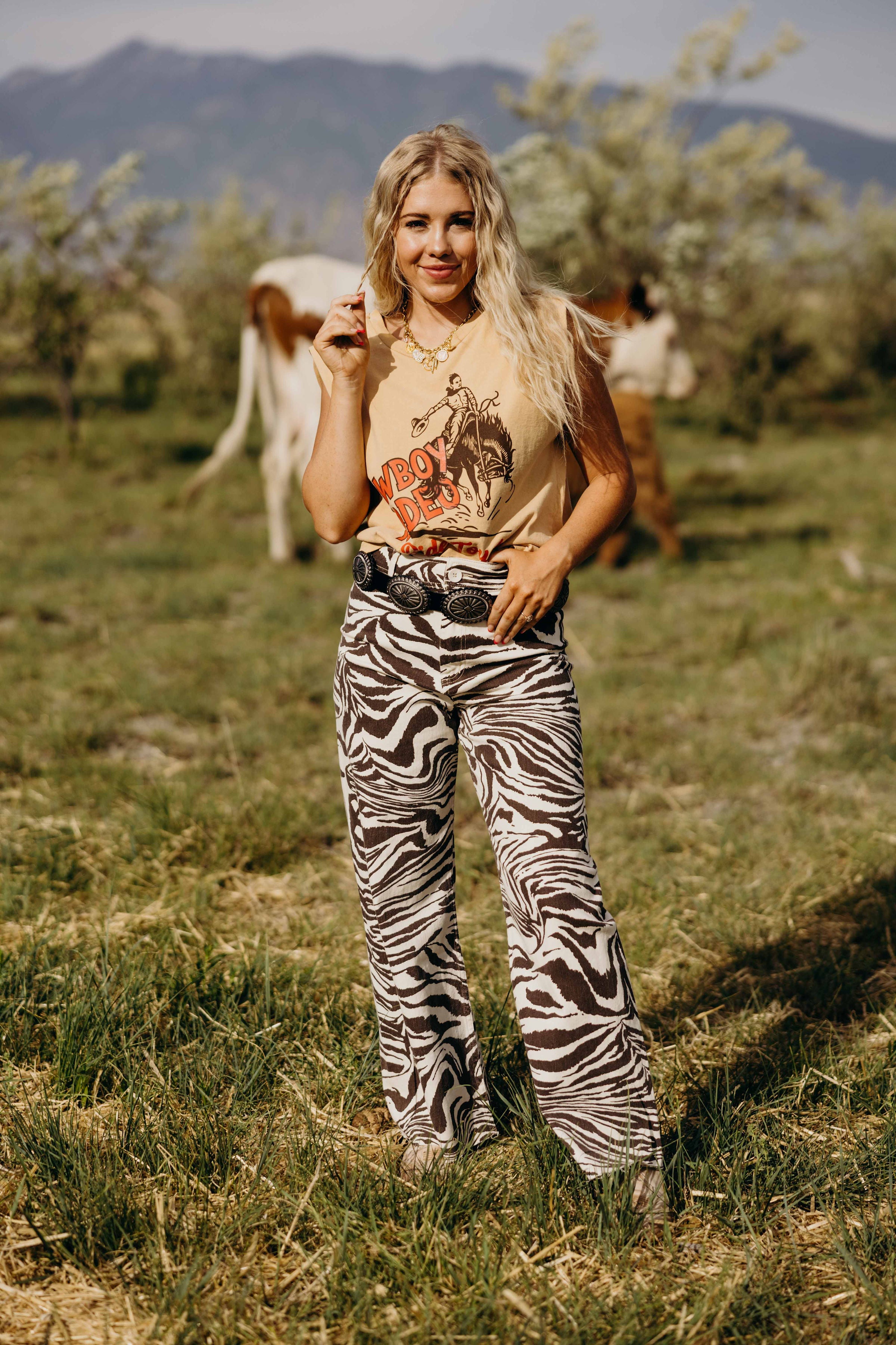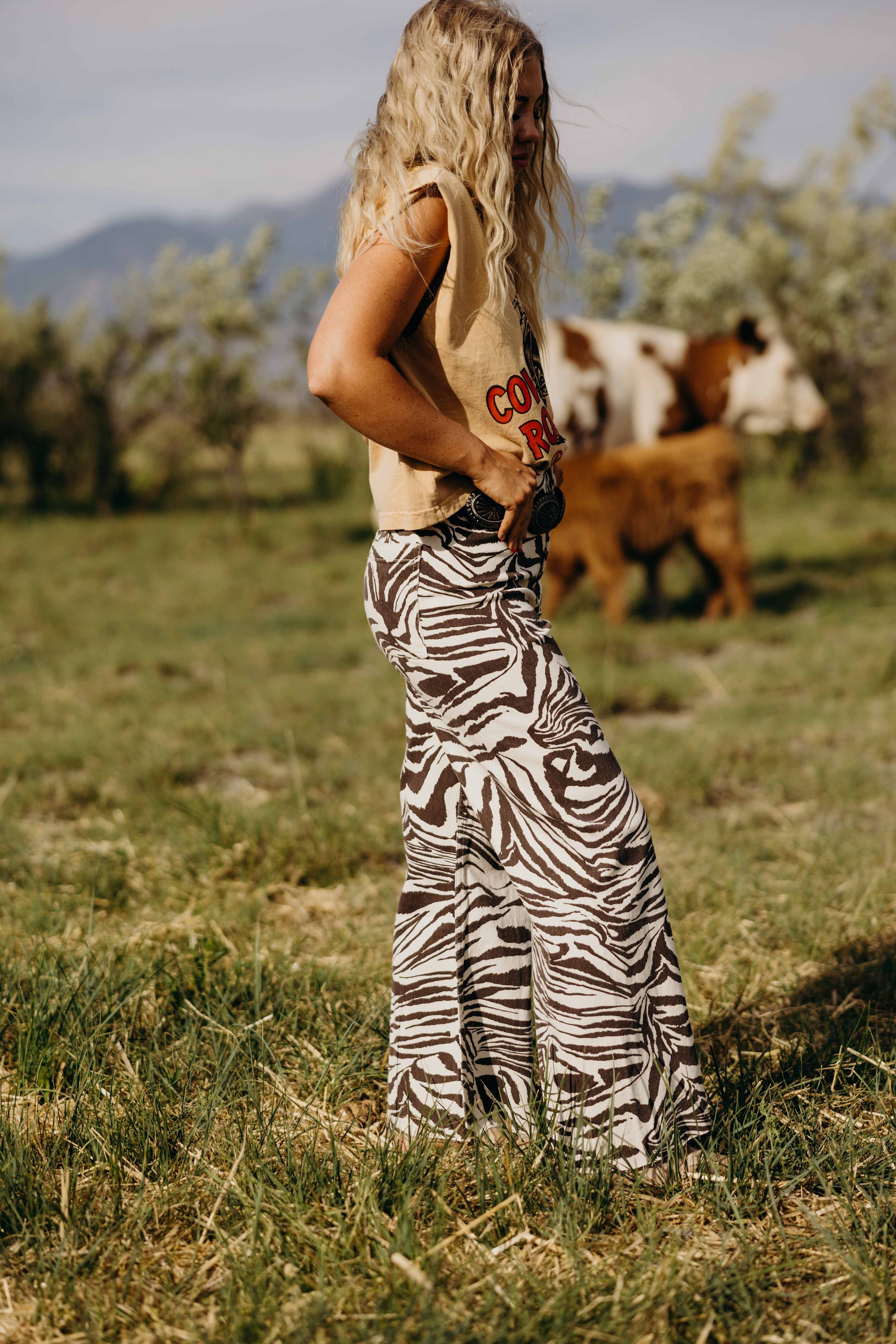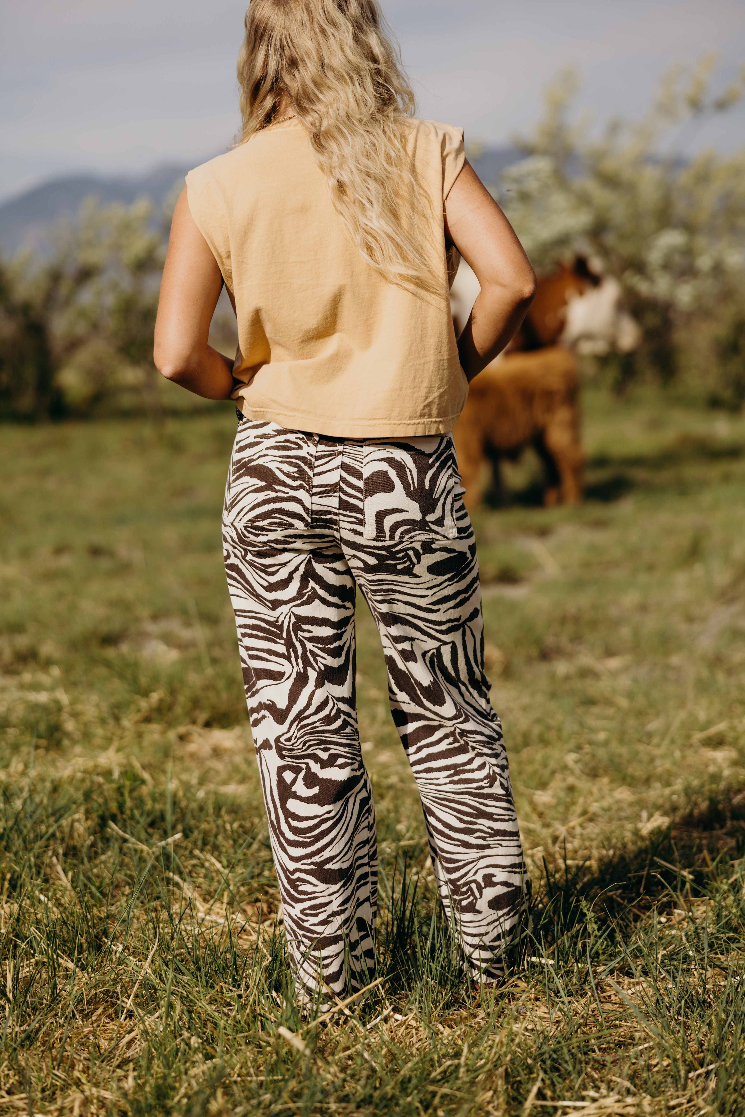 The Ziah Pants are expertly designed with a high rise and straight leg for a sleek silhouette. Made with a trendy brown and white zebra print, these western-style pants are elevated by a raw hem detail. Make a statement while staying stylish and comfortable.