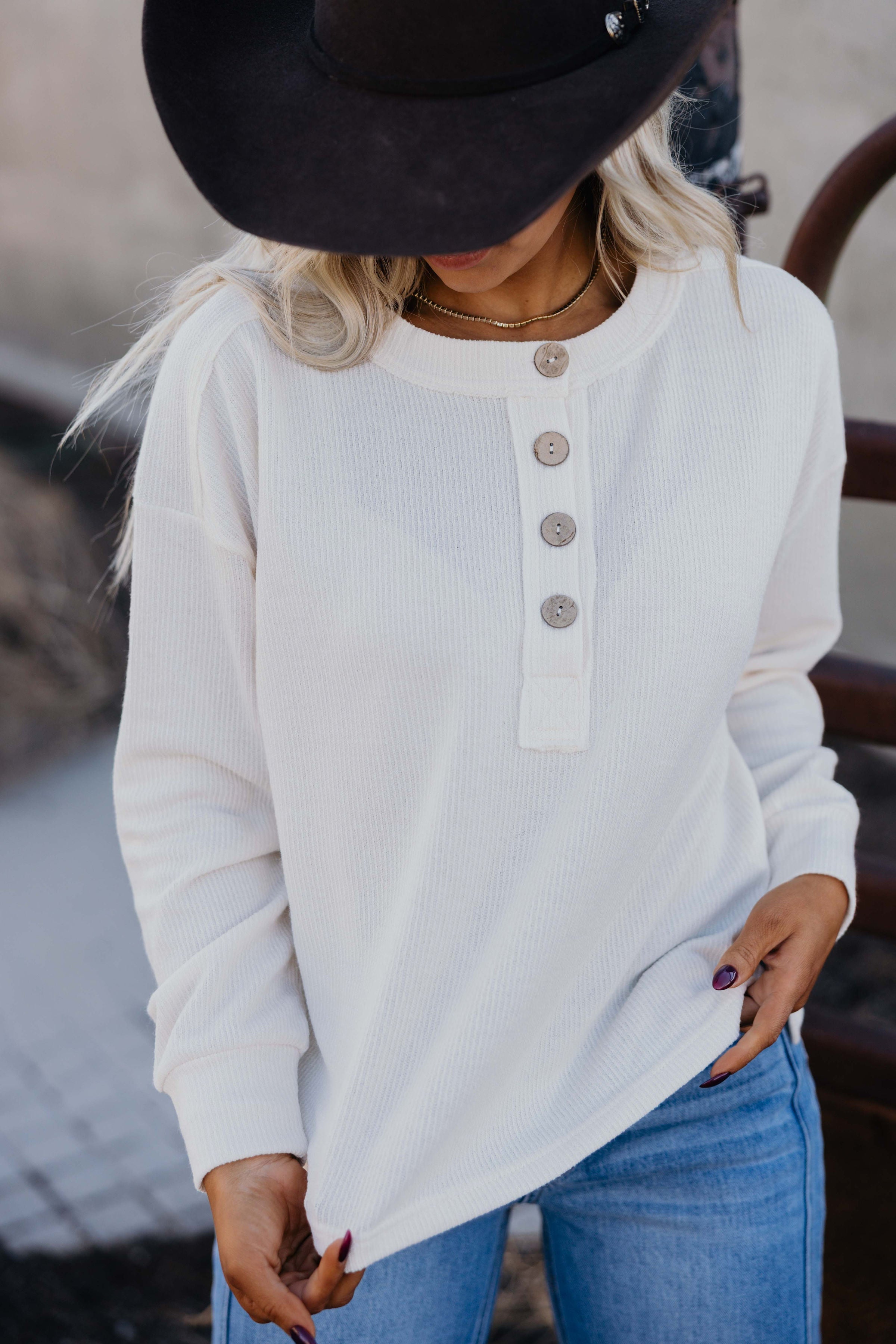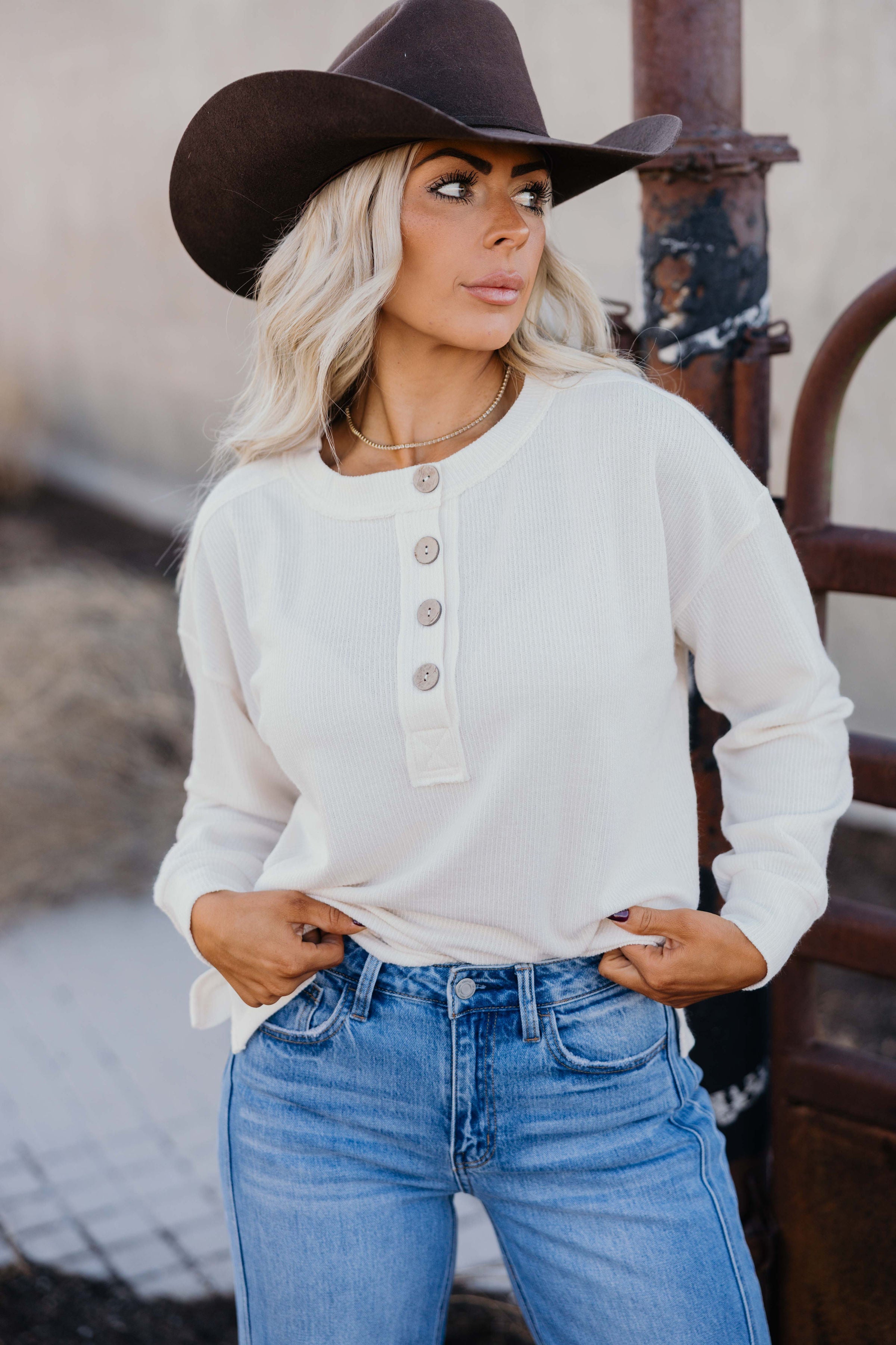 The Lucine Top is your go-to piece for effortless Western style. This cream-colored henley features a half button-down front and long sleeves with charming patchwork details that add character to your everyday look. Crafted from soft ribbed knit fabric, it offers a relaxed fit that moves with you while maintaining its shape. Perfect for layering or wearing solo, this versatile top brings warmth and personality to any outfit. Whether you're dressing up or keeping it casual, The Lucine Top supports your style journey with comfort and timeless appeal.