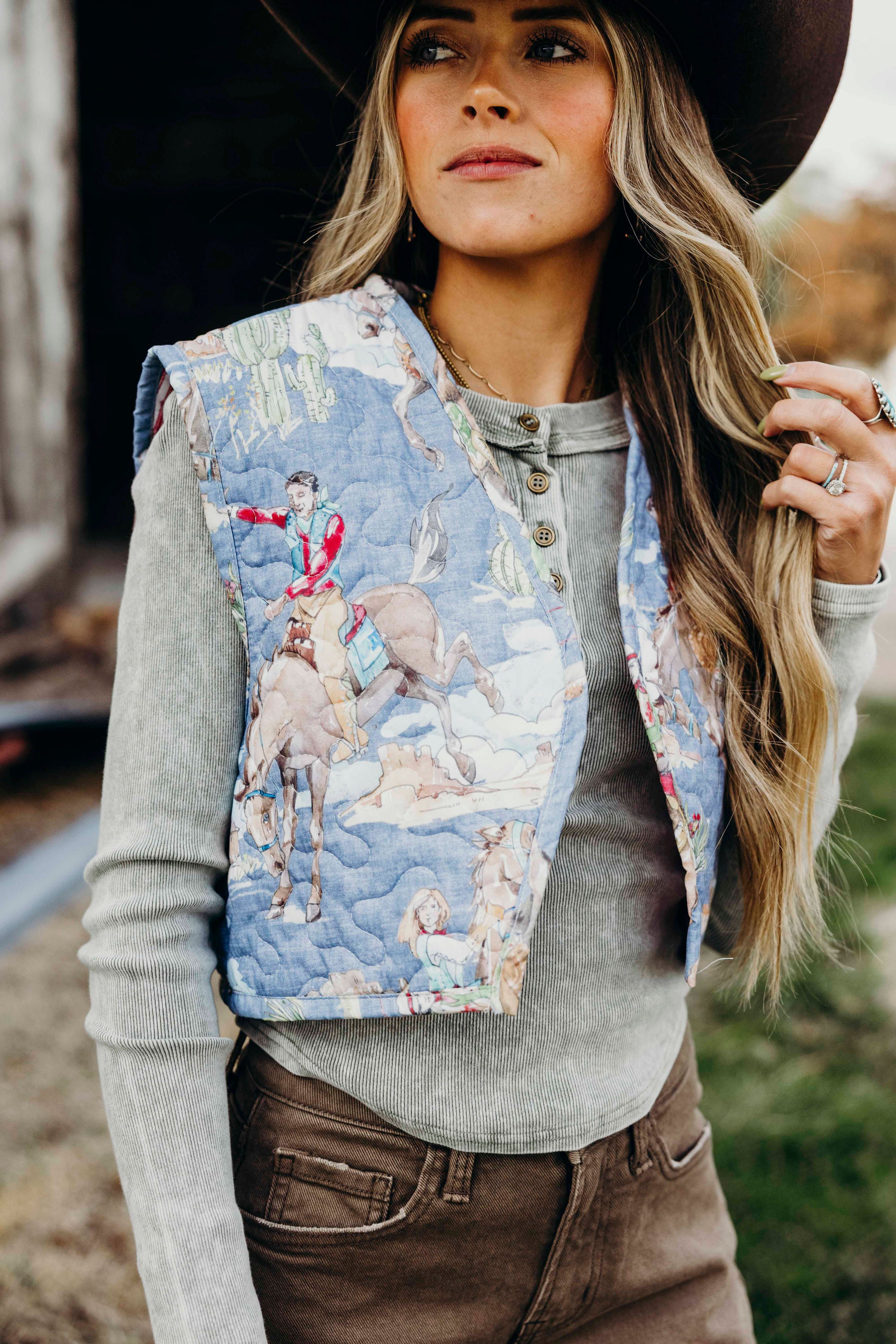 The Birdie Vest is a timeless, hand-crafted piece featuring a blue, cowgirl and horse western print. Its cropped length and sleeveless design make it a versatile addition to any wardrobe, while the striped red print interior adds a touch of personality. Made and sewn in Texas, this western quilted vest is perfect for those who appreciate quality and craftsmanship.