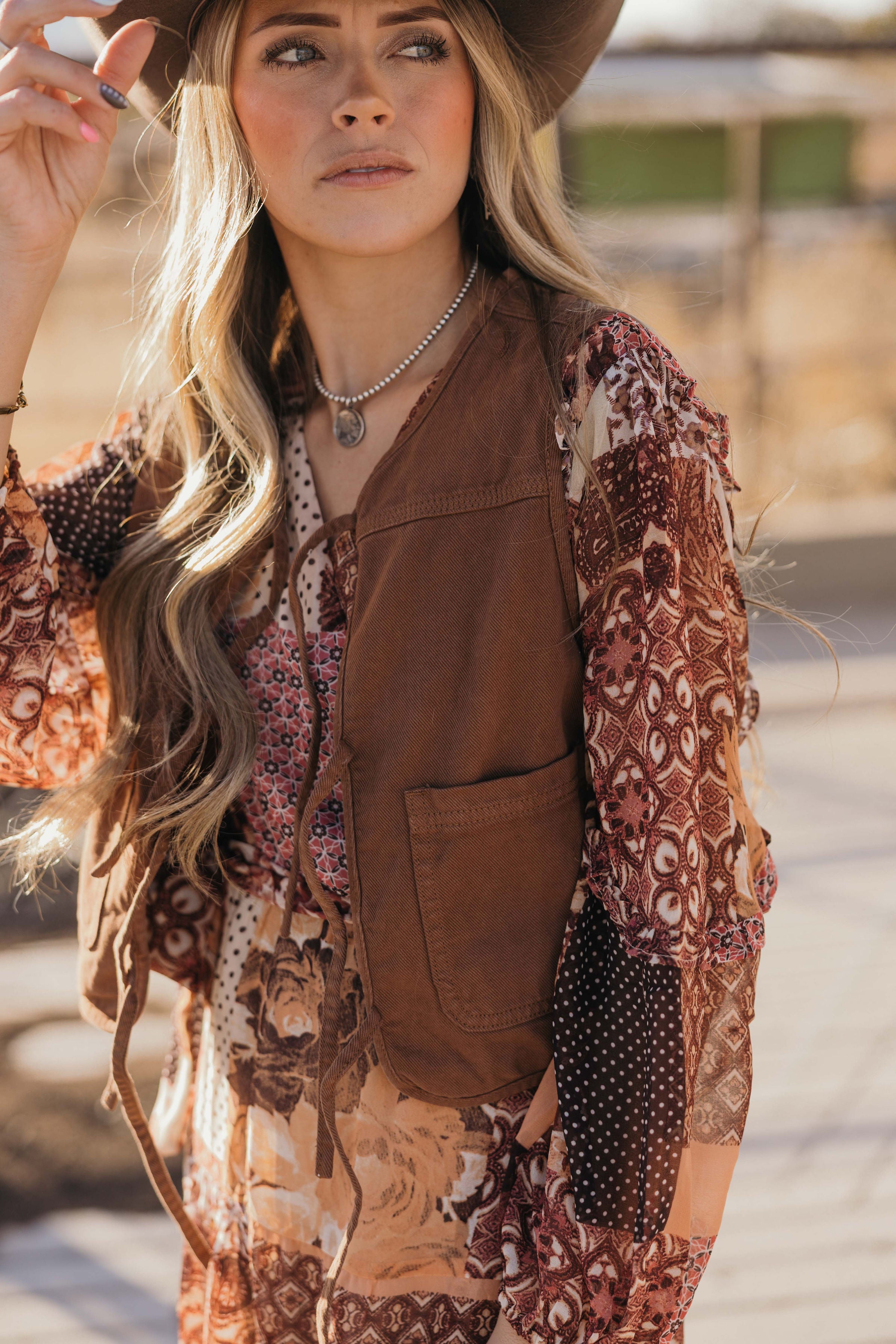 The Maren Vest brings vintage charm with its soft structured cotton denim and classic wash finish. This playful western-inspired piece features a cropped silhouette and adjustable tie front for the perfect fit. Sleeveless and equipped with patch front pockets, it’s ideal for layering into your winter wardrobe with a cool, laid-back vibe.