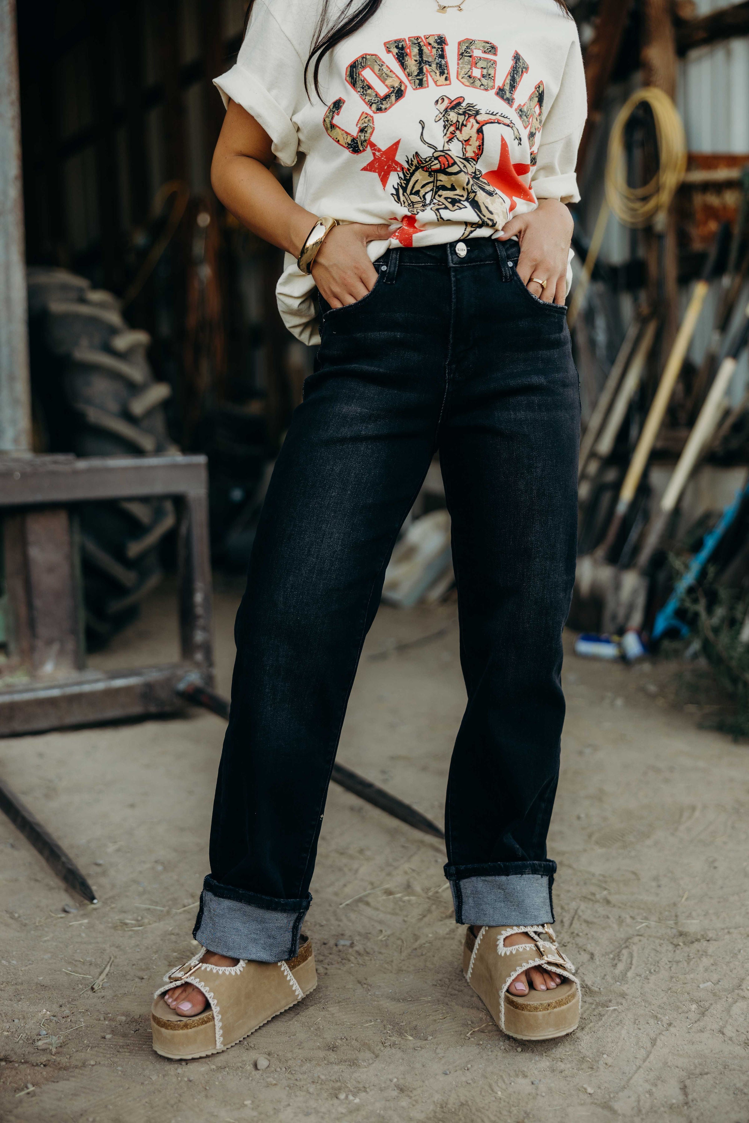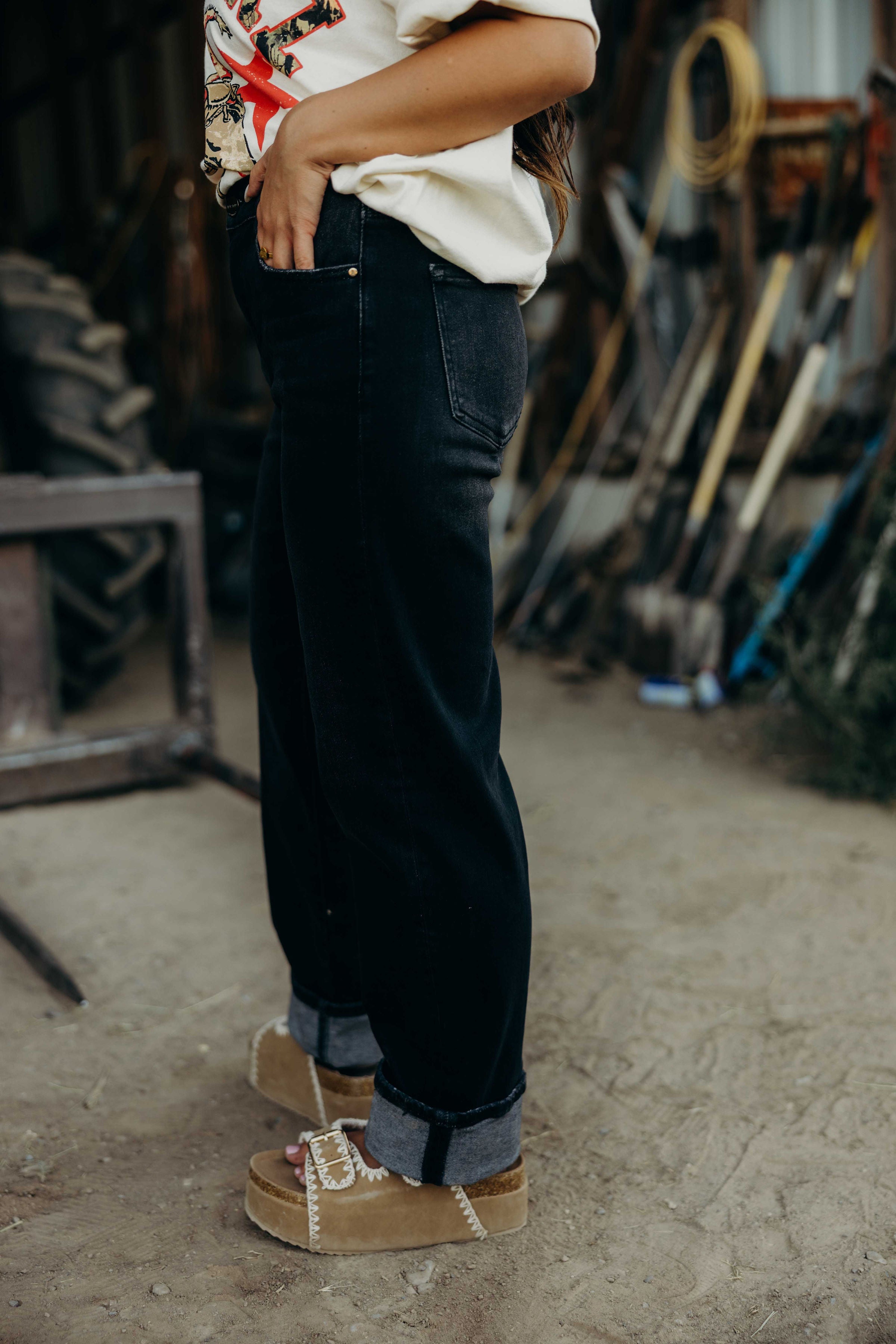 The Wayne Jeans combine classic western style with modern comfort. Featuring a high-rise fit and straight leg silhouette, these black denim jeans offer a flattering shape that suits any occasion. The cuffed hem adds a stylish touch, making them perfect for both casual and dressier looks. Durable and versatile, The Wayne Jeans are a must-have for your wardrobe.