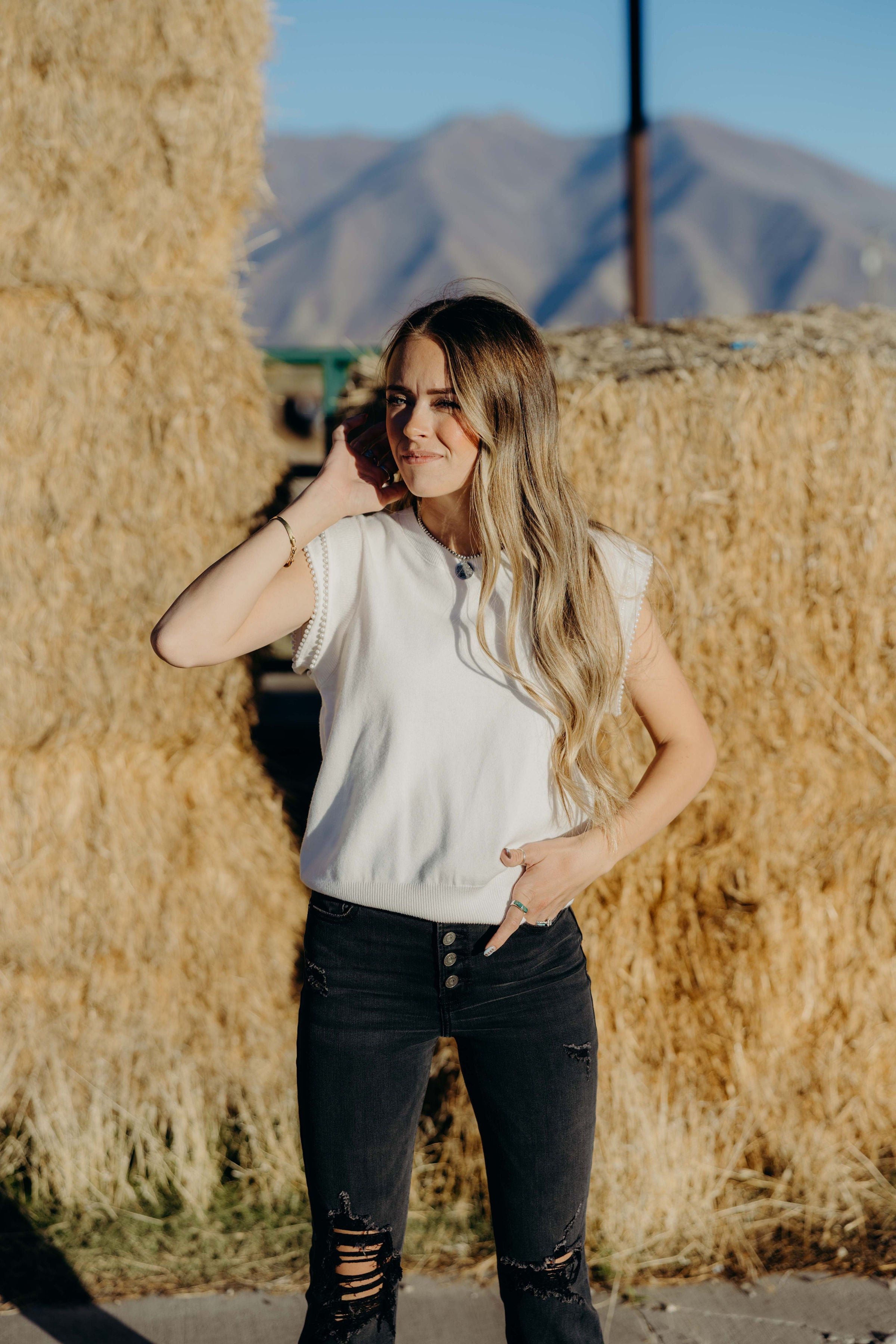 Elevate your wardrobe with the Brunswick sleeveless knit sweater top in elegant ivory. Featuring a delicate pearl trim, this refined piece adds a subtle touch of luxury while maintaining a minimalist silhouette. Its soft, breathable fabric ensures comfort and versatility, making it perfect for sophisticated layering or wearing alone for a polished, timeless look.