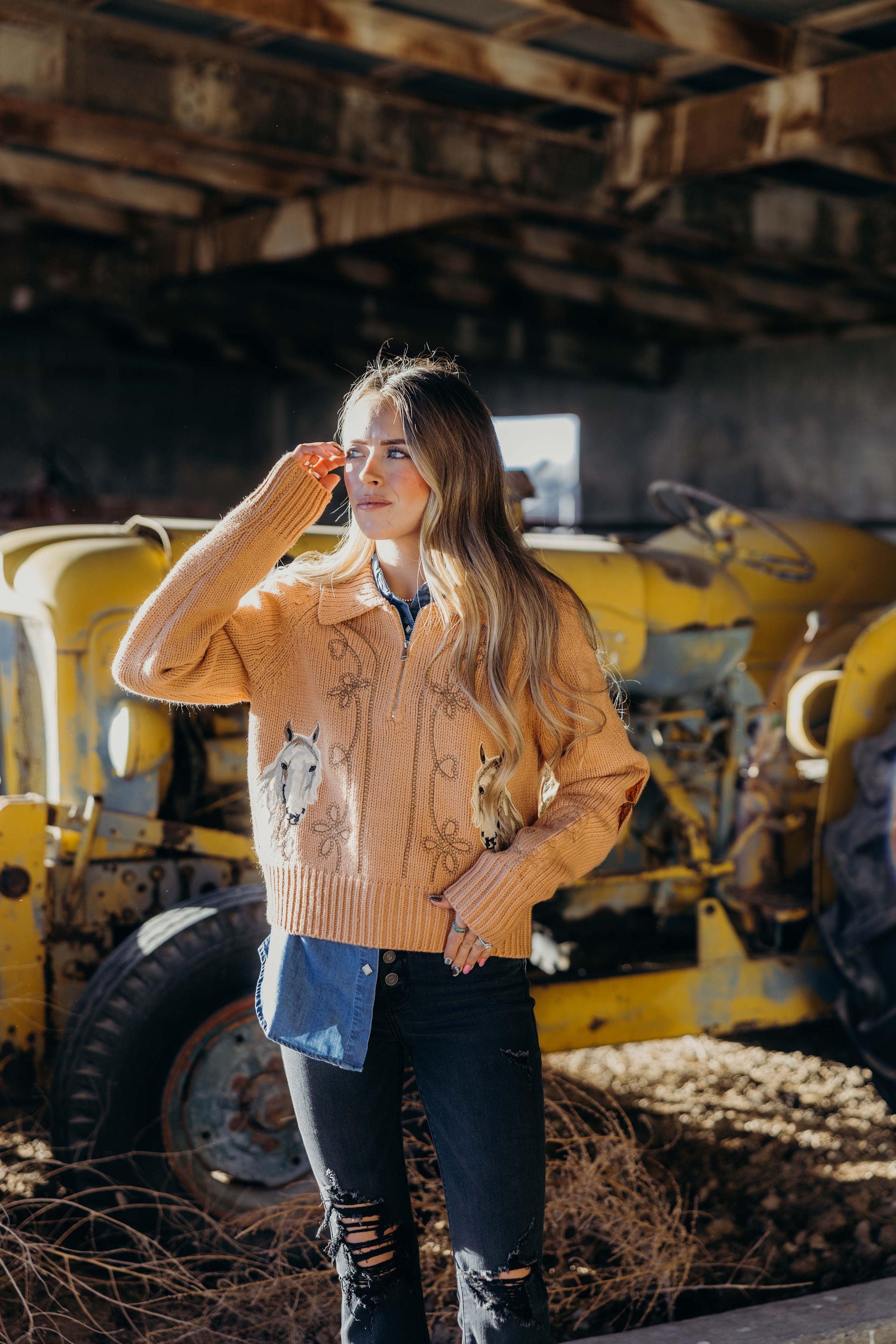 The Alira Sweater combines rustic charm with refined design in a taupe cropped silhouette. This zip up winter essential features a mock neck and collared detail for warmth and elegance. Delicate floral embroidery and a subtle horse motif accent add a distinctive western flair, while the ribbed hem ensures a polished fit. Perfect for layering or wearing solo, it brings a sophisticated edge to your cold season wardrobe.