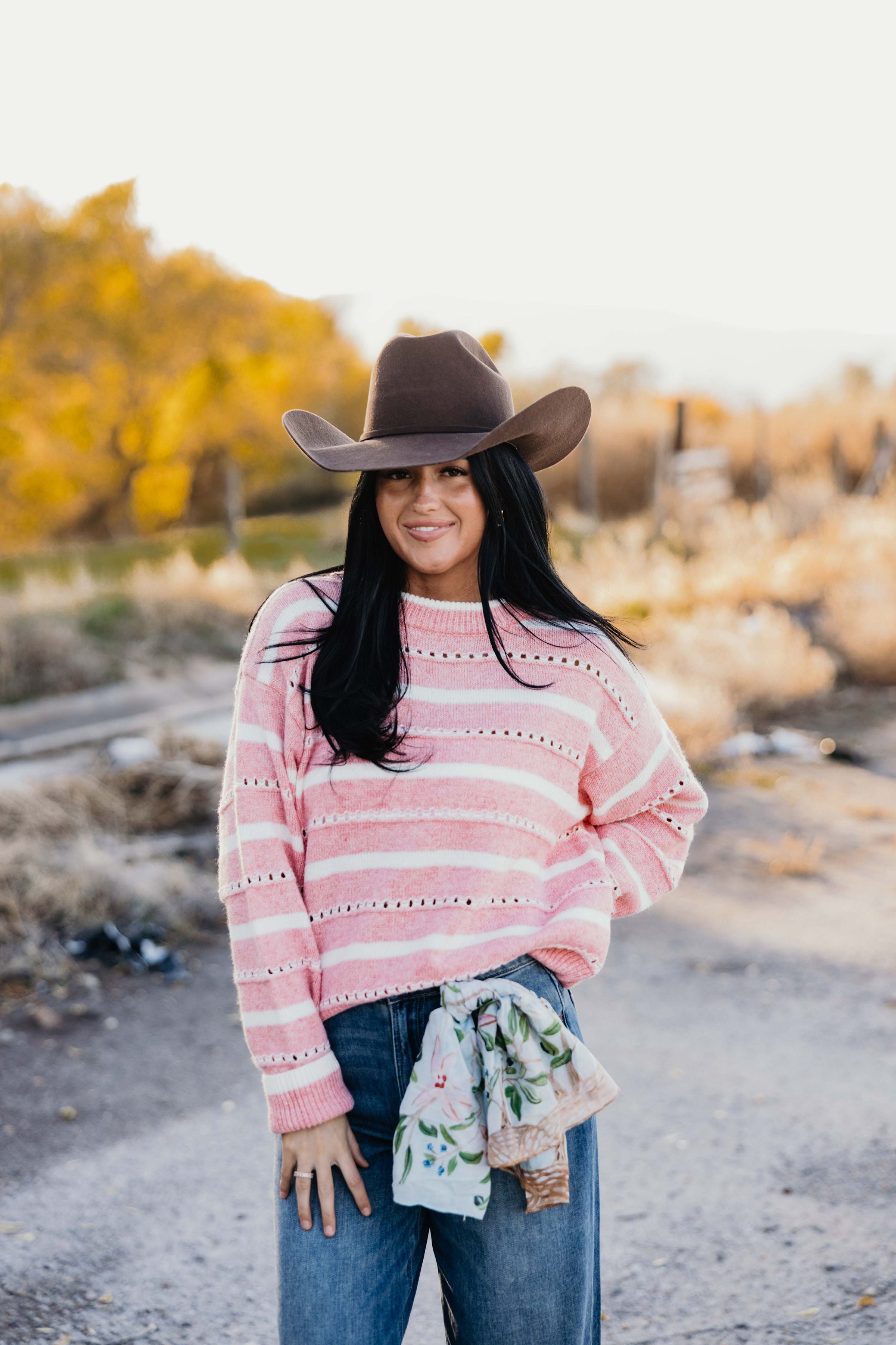 Get cozy in The Embra Sweater, a playful bubble gum pink western inspired knit with a soft brushed feel. Featuring a charming horizontal stripe pattern and eye catching open stitch eyelet texture, its oversized silhouette offers roomy comfort. Wide ribbing at the cuffs, hems, and crew neckline adds to the cozy vibe, making it perfect for layering through chilly winter days. Embrace warmth and fun style all season long!