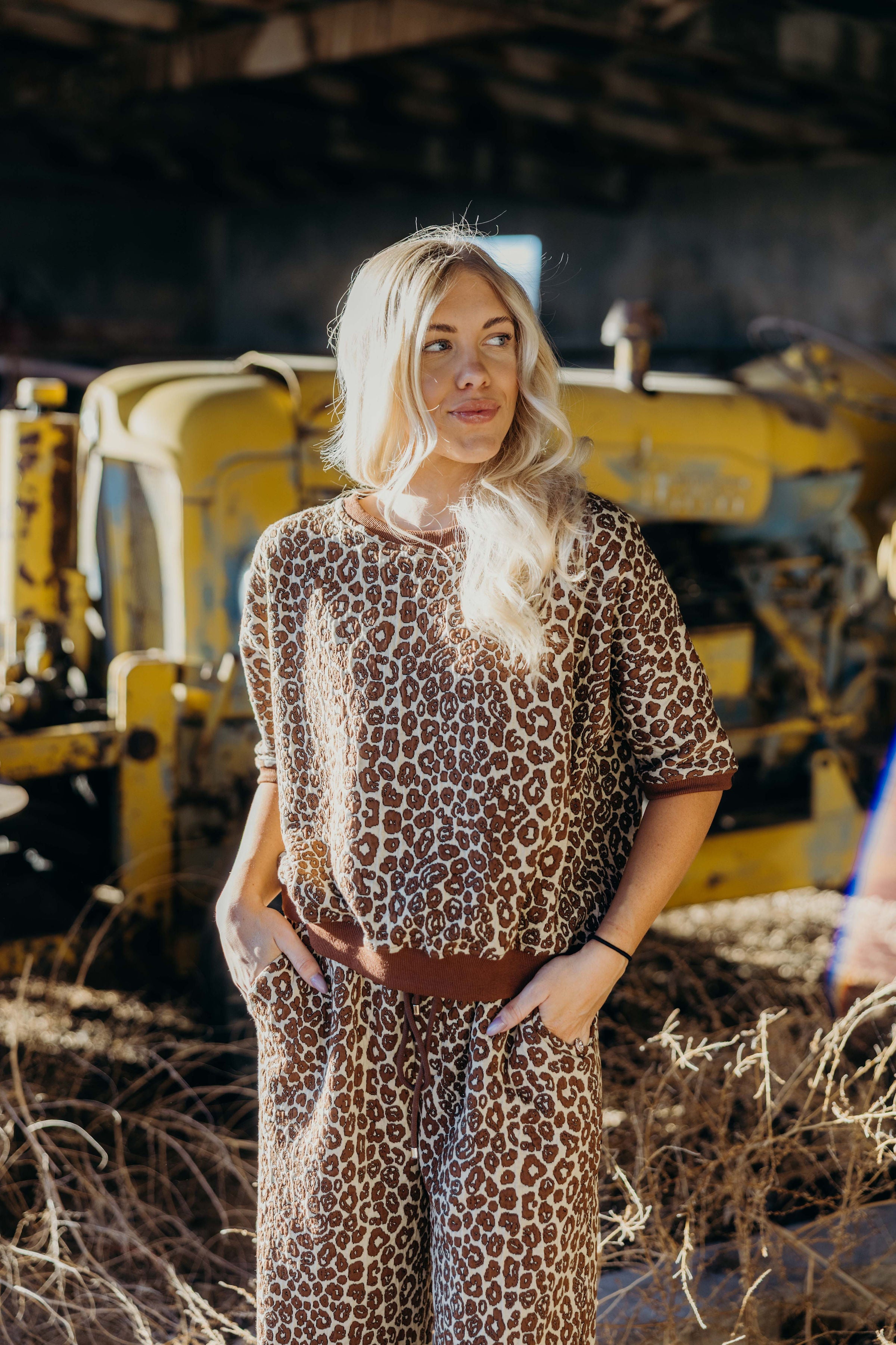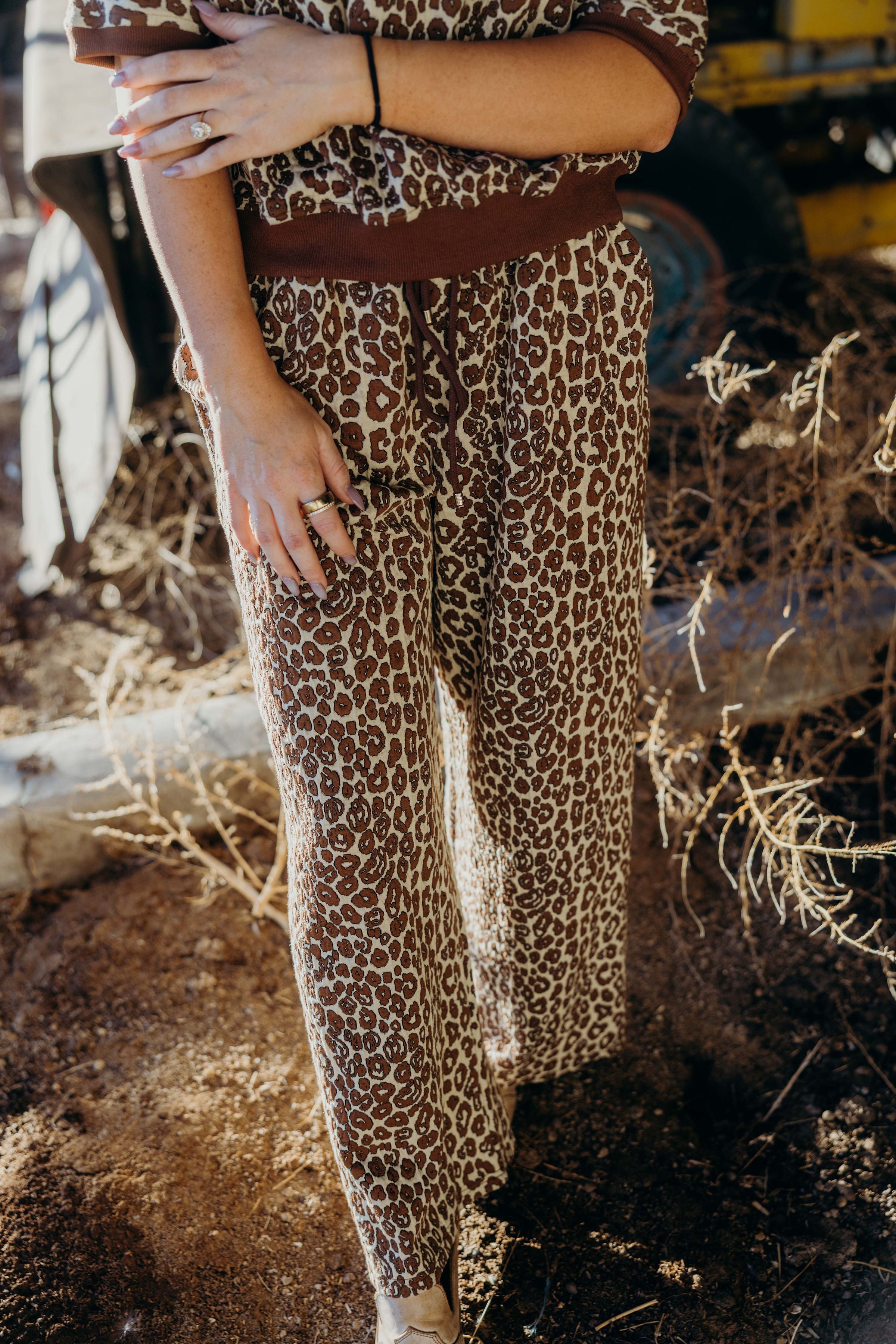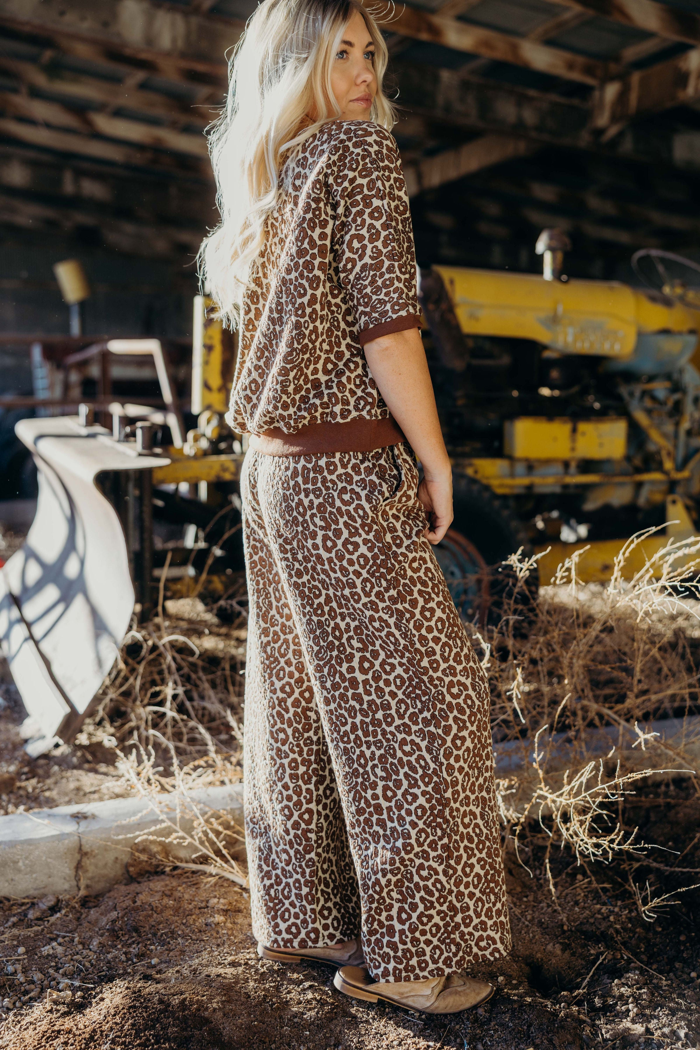 The Etta Set is a refined winter ensemble featuring a rich brown leopard jacquard print with textured fabric and a contrasting band for a sleek finish. The top showcases 1/2 dolman sleeves and a loose fit, while the wide leg pants are cropped at the ankle and equipped with an elastic waistband and drawstring for personalized comfort. Designed for both warmth and style, this cozy set elevates casual dressing with a sophisticated western edge.