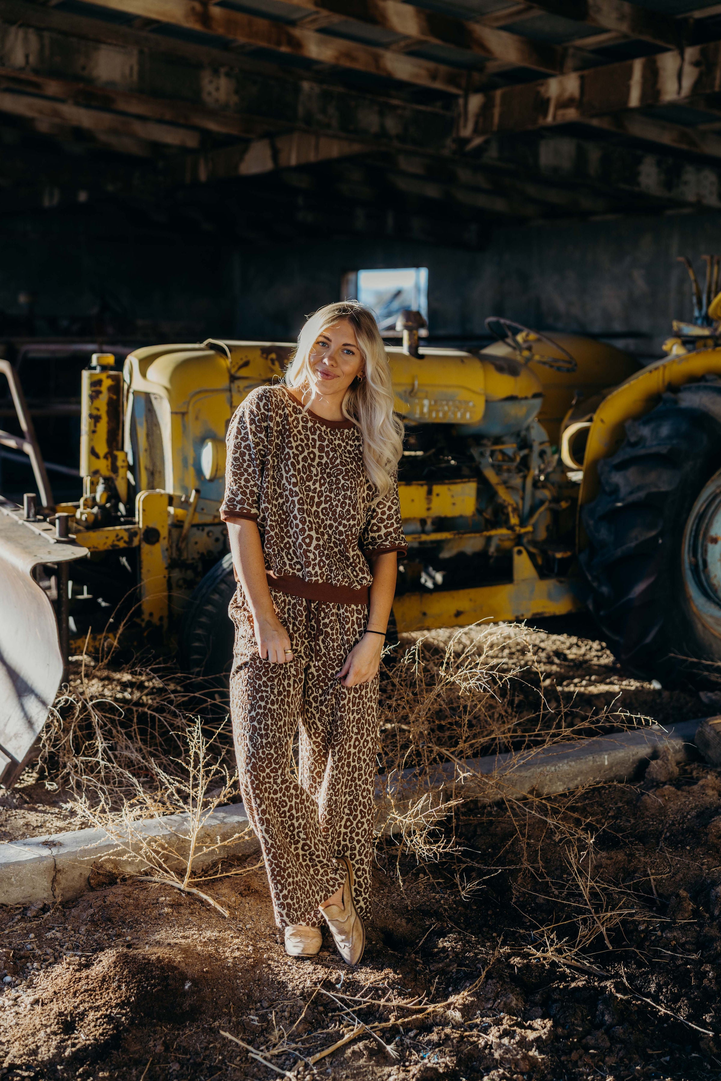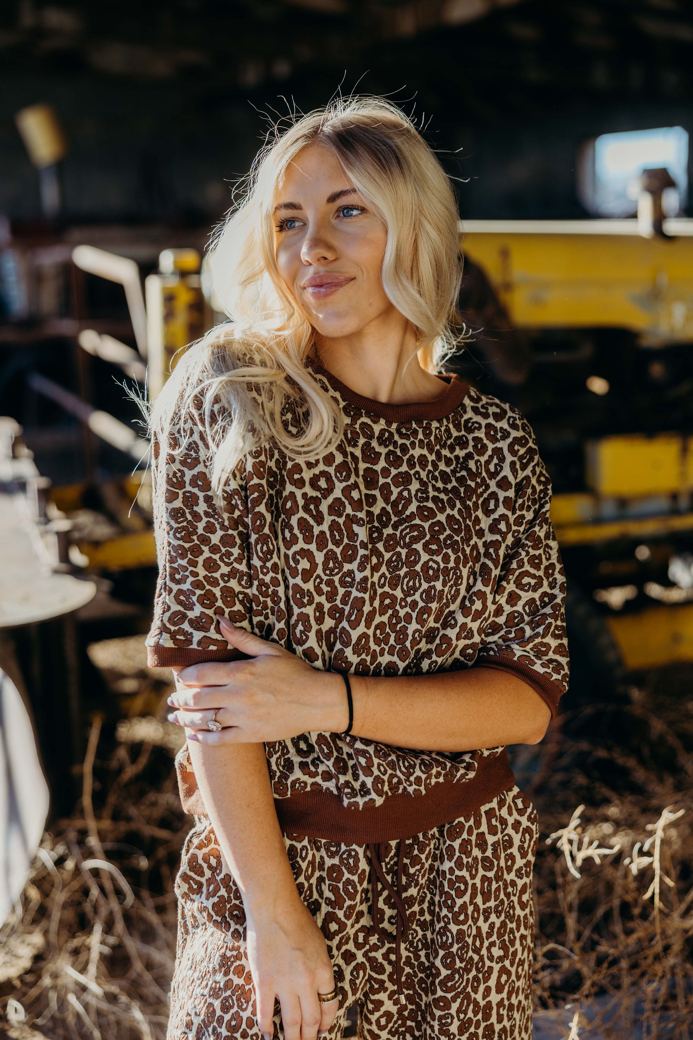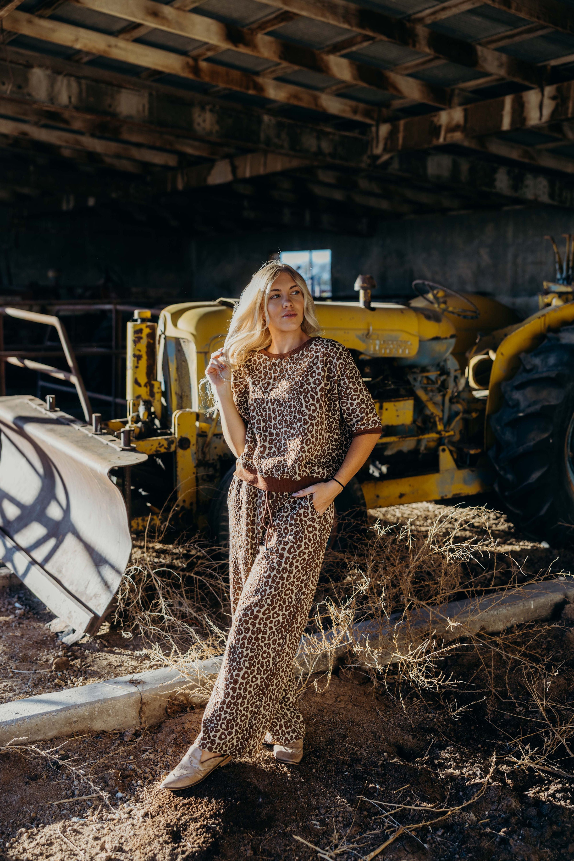 The Etta Set is a refined winter ensemble featuring a rich brown leopard jacquard print with textured fabric and a contrasting band for a sleek finish. The top showcases 1/2 dolman sleeves and a loose fit, while the wide leg pants are cropped at the ankle and equipped with an elastic waistband and drawstring for personalized comfort. Designed for both warmth and style, this cozy set elevates casual dressing with a sophisticated western edge.