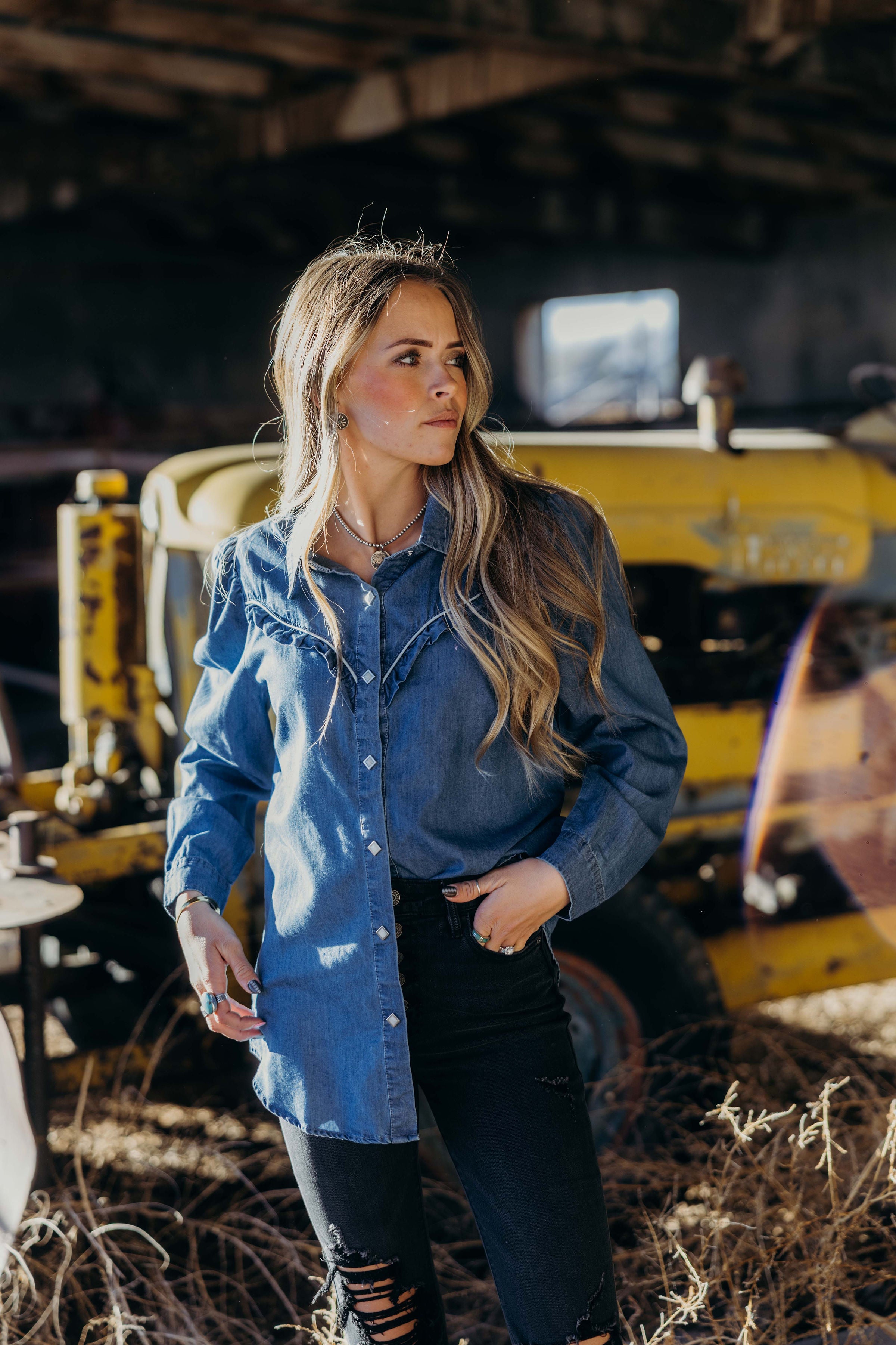 Bring bold western charm to chilly days with The Rowdy Shirt. This playful denim button-down features a ruffle yoke and classic collar, blending rugged style with a flirty twist. Its long sleeves keep you cozy while you channel that NFR spirit all winter long. Perfect for those who love a little sass with their warmth.