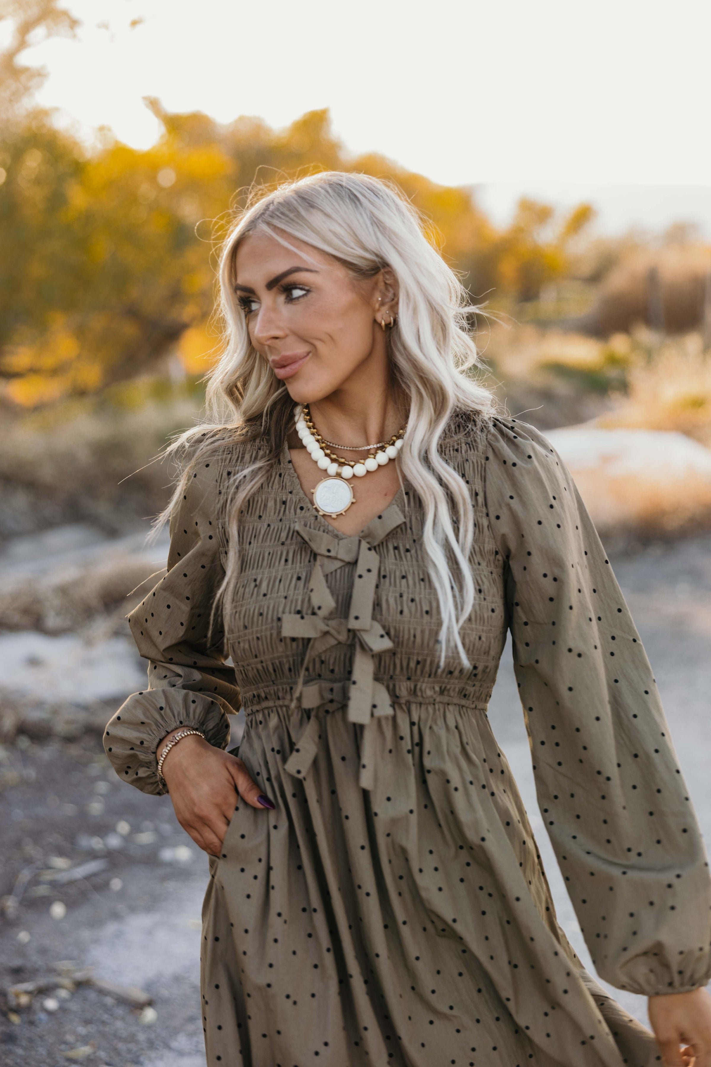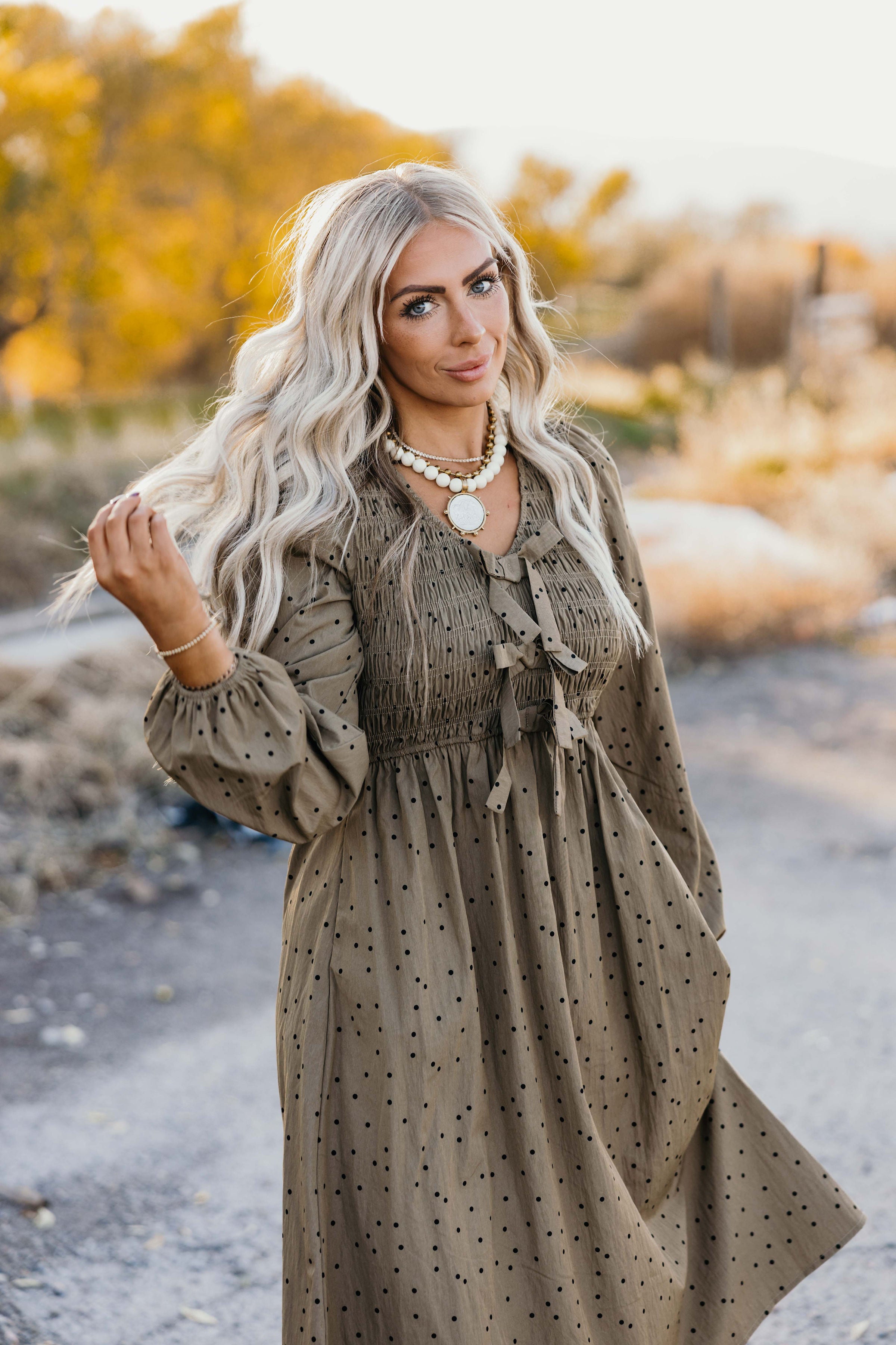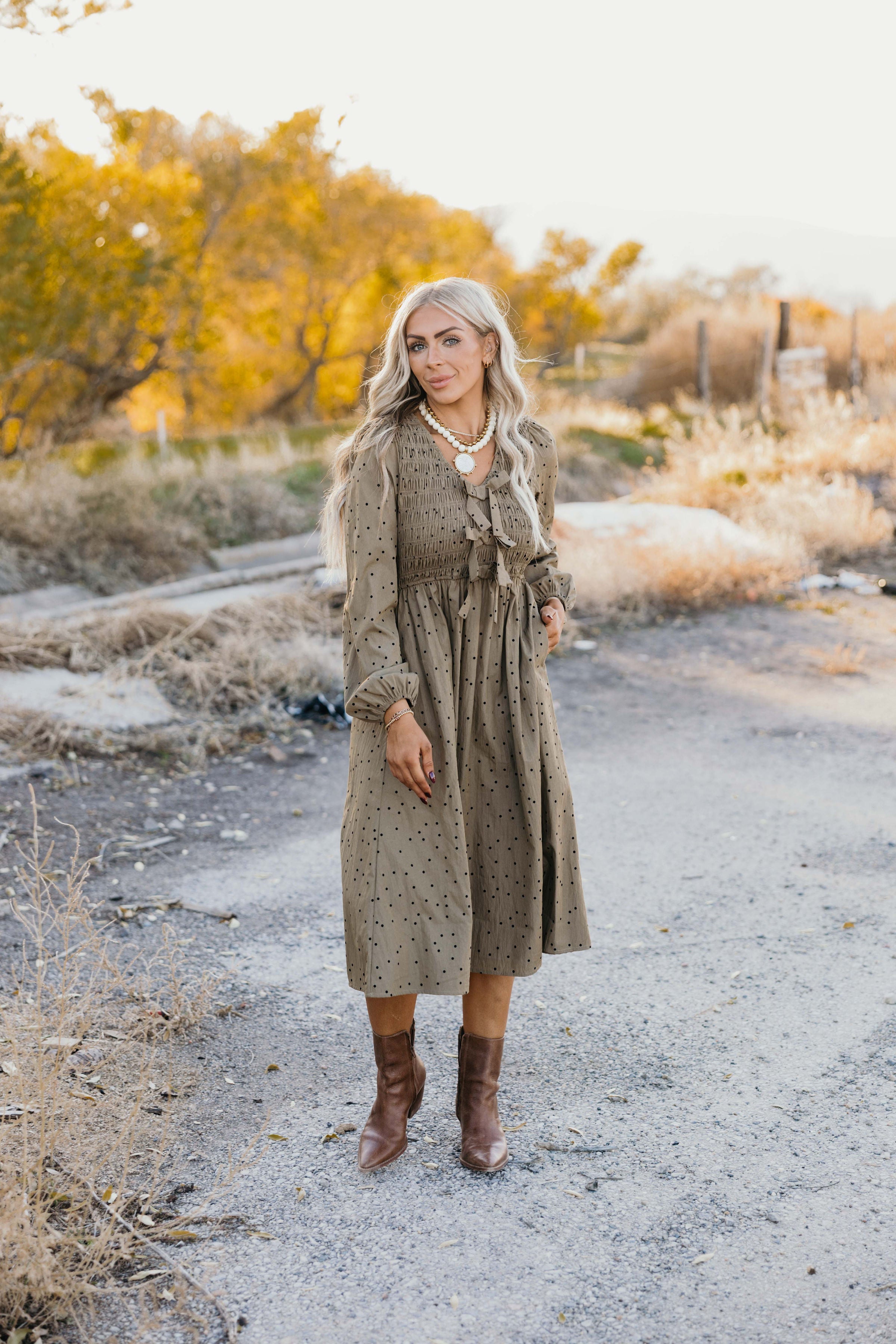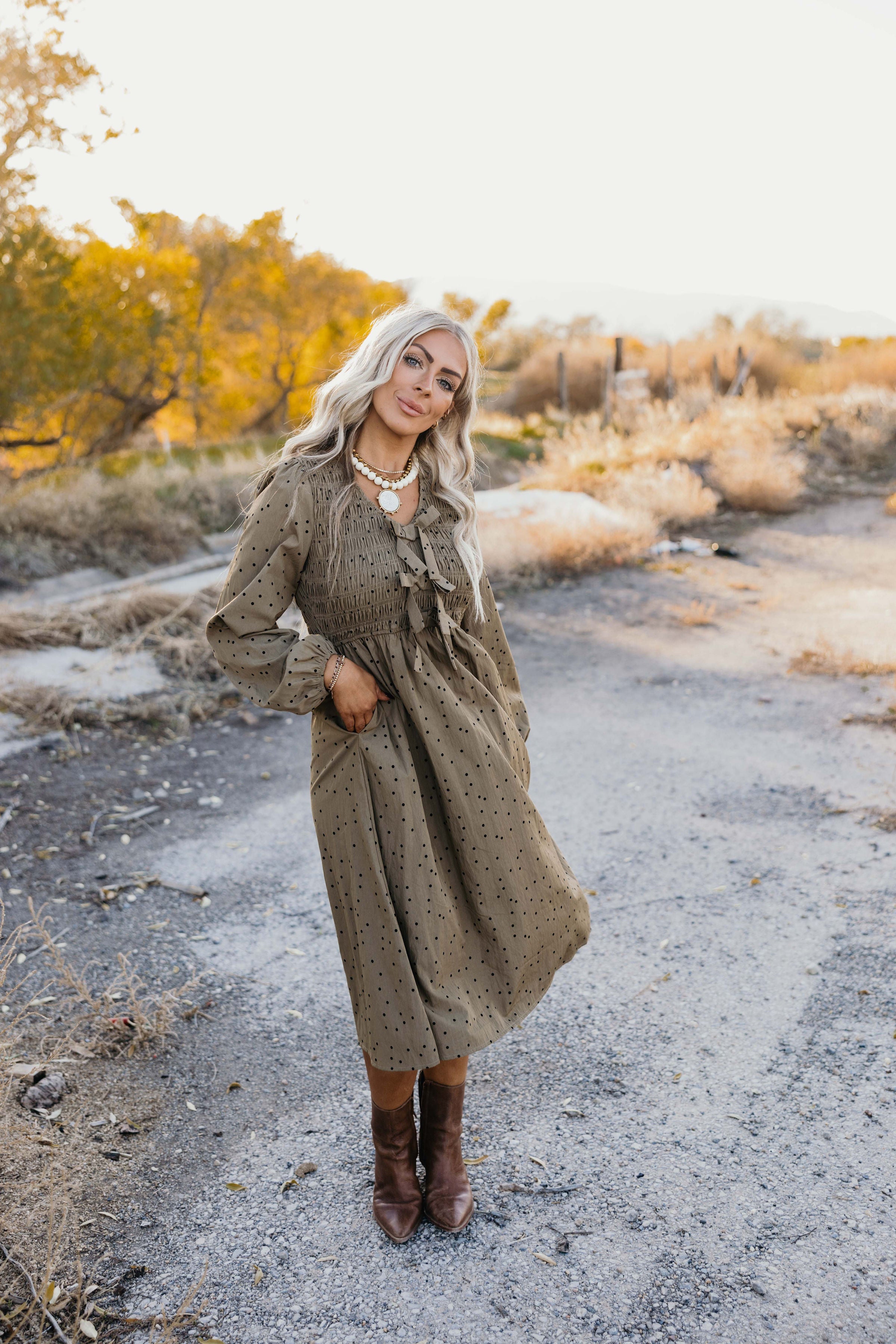The Sable Dress combines timeless western charm with modern sophistication. Crafted in an elegant olive shade, it features a delicate polka dot print that adds subtle texture. The smocked bodice and V neckline create a flattering silhouette, while the long puff sleeves and bow detailing enhance its refined appeal. Falling to a graceful midi length, this relaxed fit dress offers effortless comfort and style for any occasion.