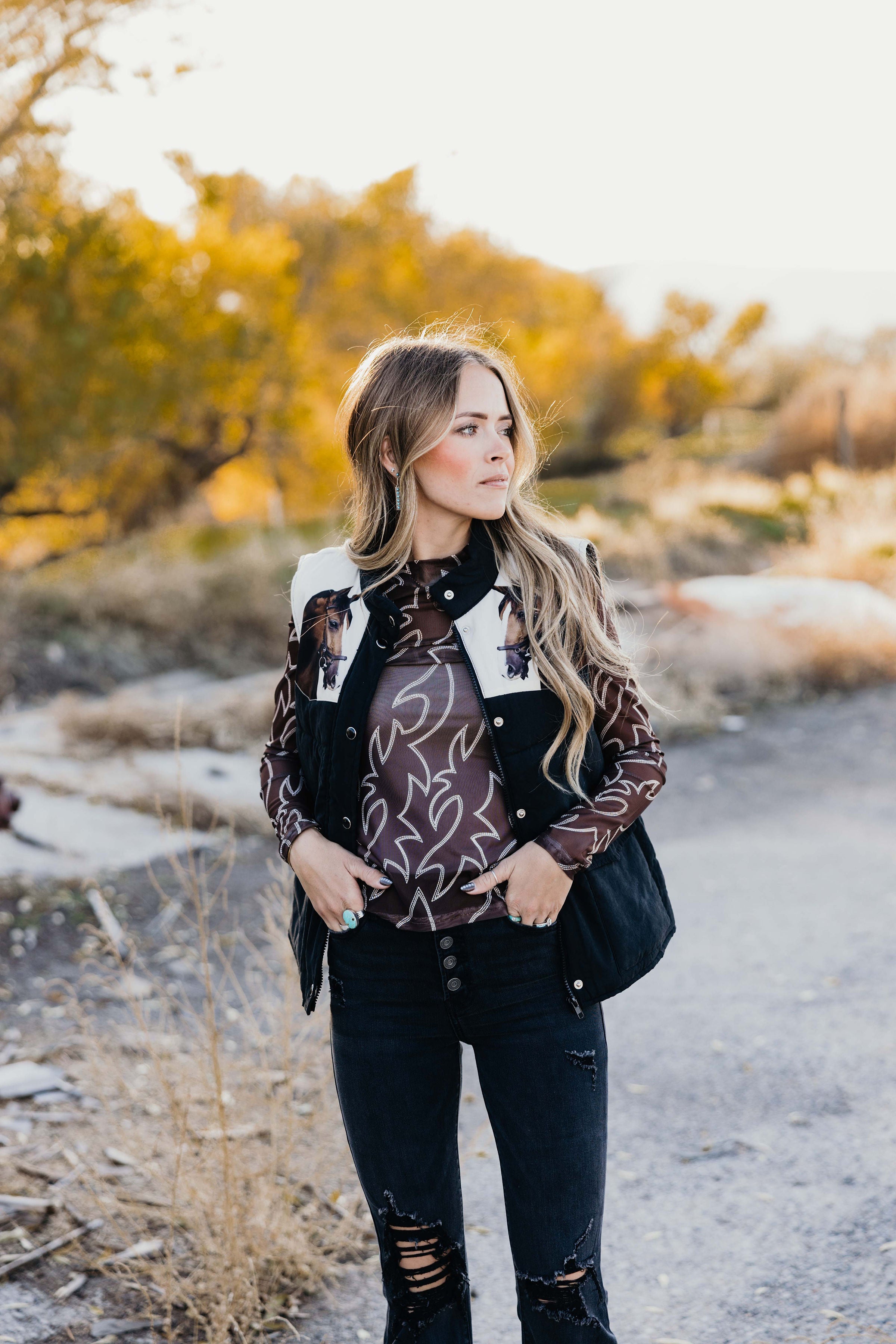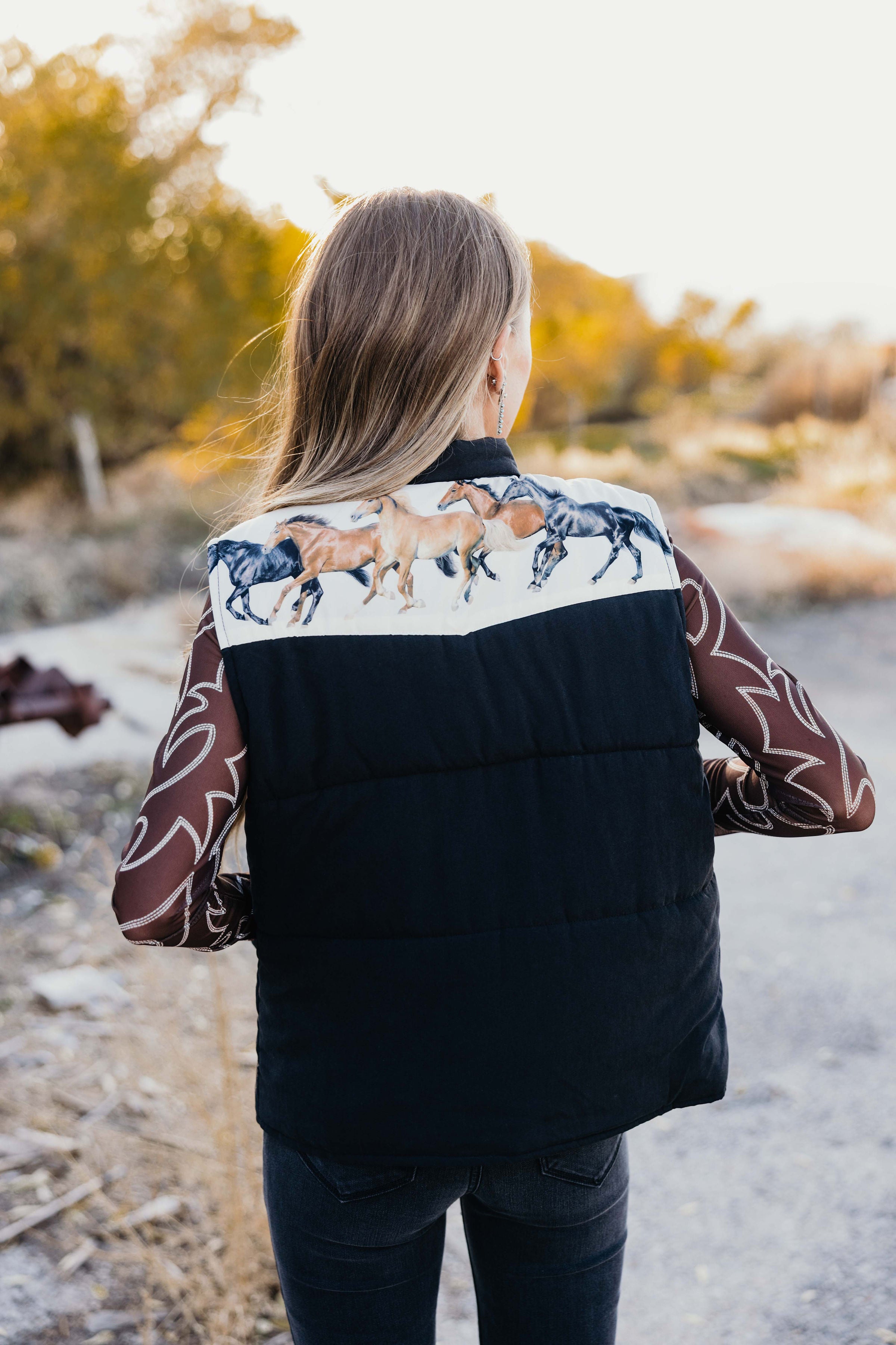 Stay warm and stylish this winter with The Tavin Vest. Featuring a sleek black design, it showcases a striking horse print on the front and dynamic running horses on the back. The front zipper and button-down closure provide versatile wear, while the high neck offers extra protection against chilly winds. Combining western flair with cozy puffed insulation, this vest is perfect for embracing the season with confidence and comfort.