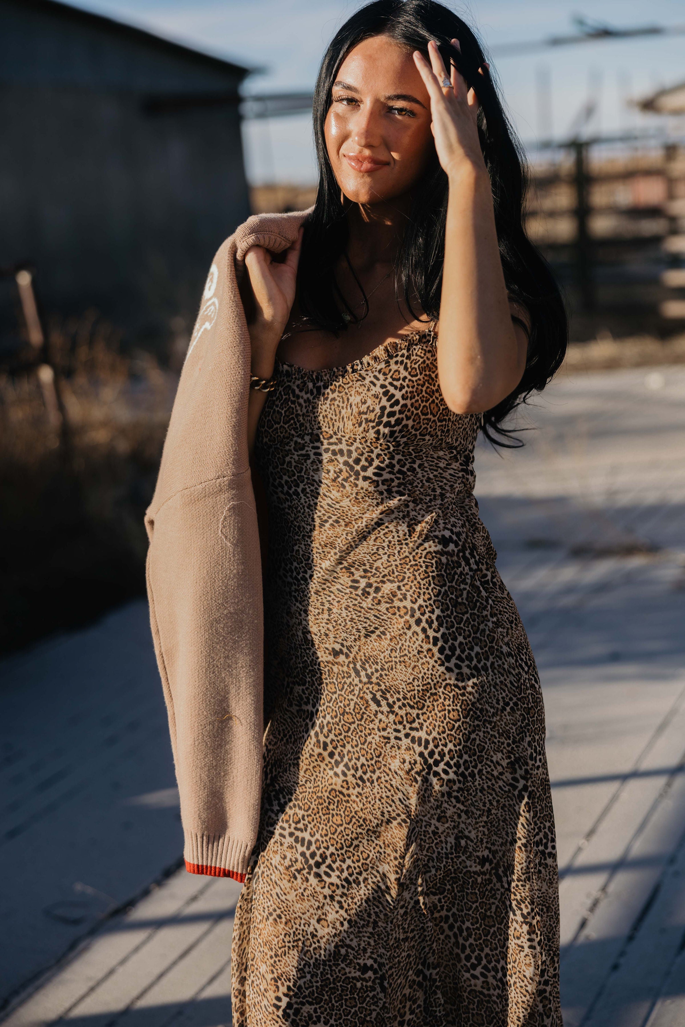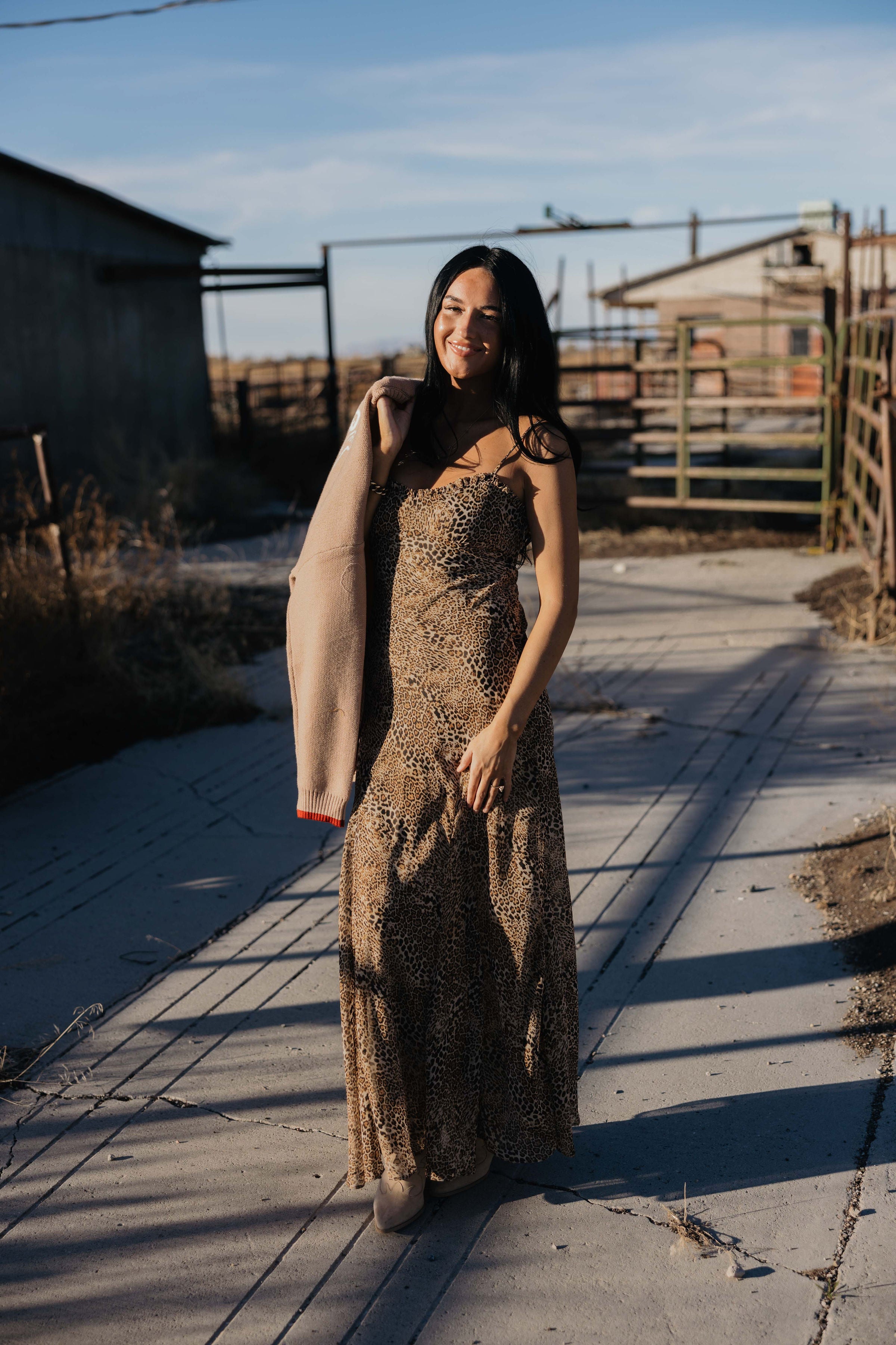 The Solara Dress captures effortless Western elegance in rich sandstone brown with a striking leopard print. This maxi silhouette features delicate spaghetti straps with adjustable sizing for a personalized fit, complemented by a charming ruffle detail at the bust. A convenient side zipper ensures easy dressing, while the smocked back provides subtle shaping and comfort. The flared hem creates graceful movement, and the lined construction offers confidence and durability. Perfect for those seeking a statement piece that blends bohemian flair with refined style.