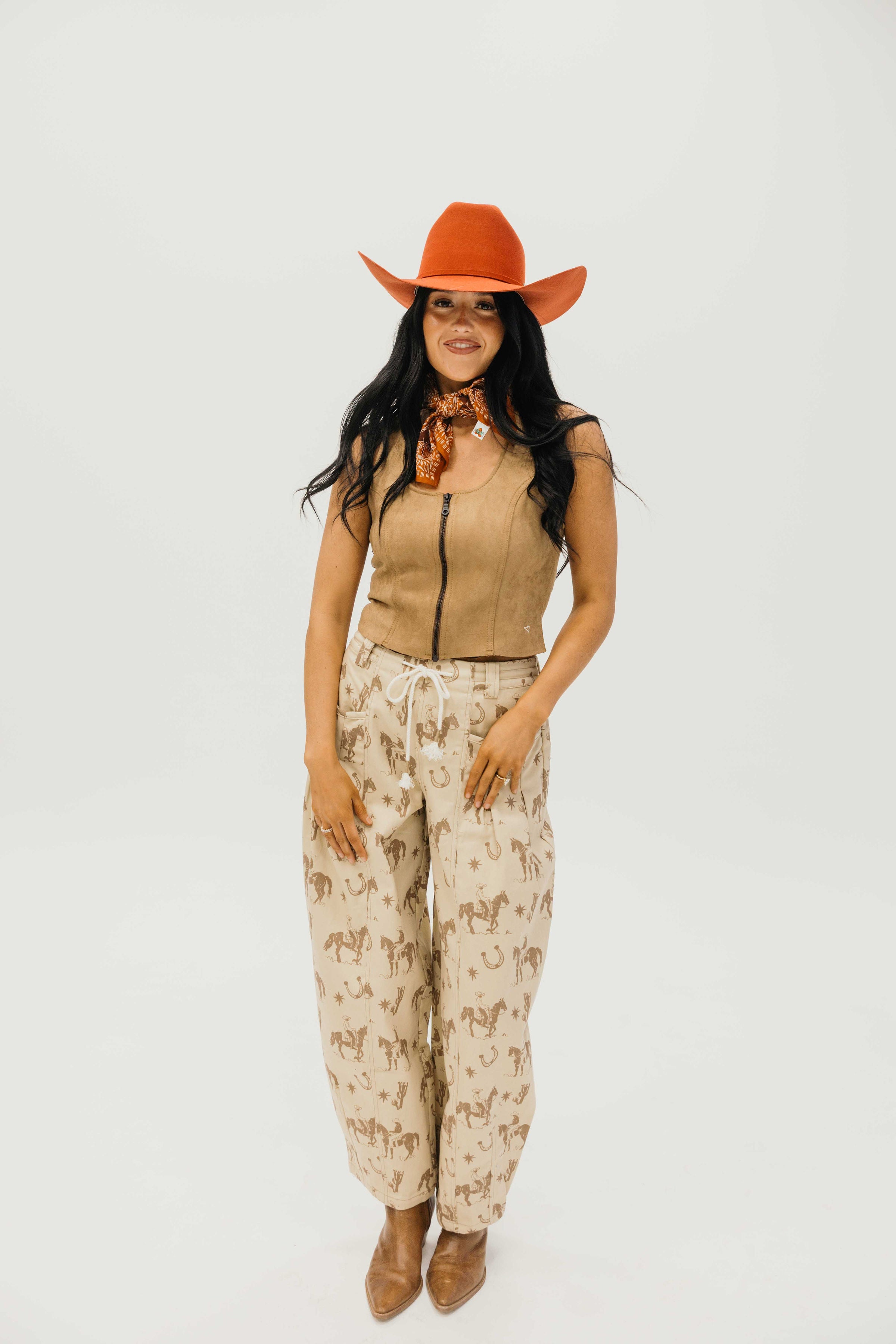 Elevate your western wardrobe with The Dell Vest, a stunning cropped silhouette in buttery caramel suede. This sleeveless essential features a convenient front zipper for effortless styling, making it the perfect layering piece for any season. The soft suede construction and flattering cropped length create a modern take on classic western wear, ideal for pairing with your favorite denim or dresses.