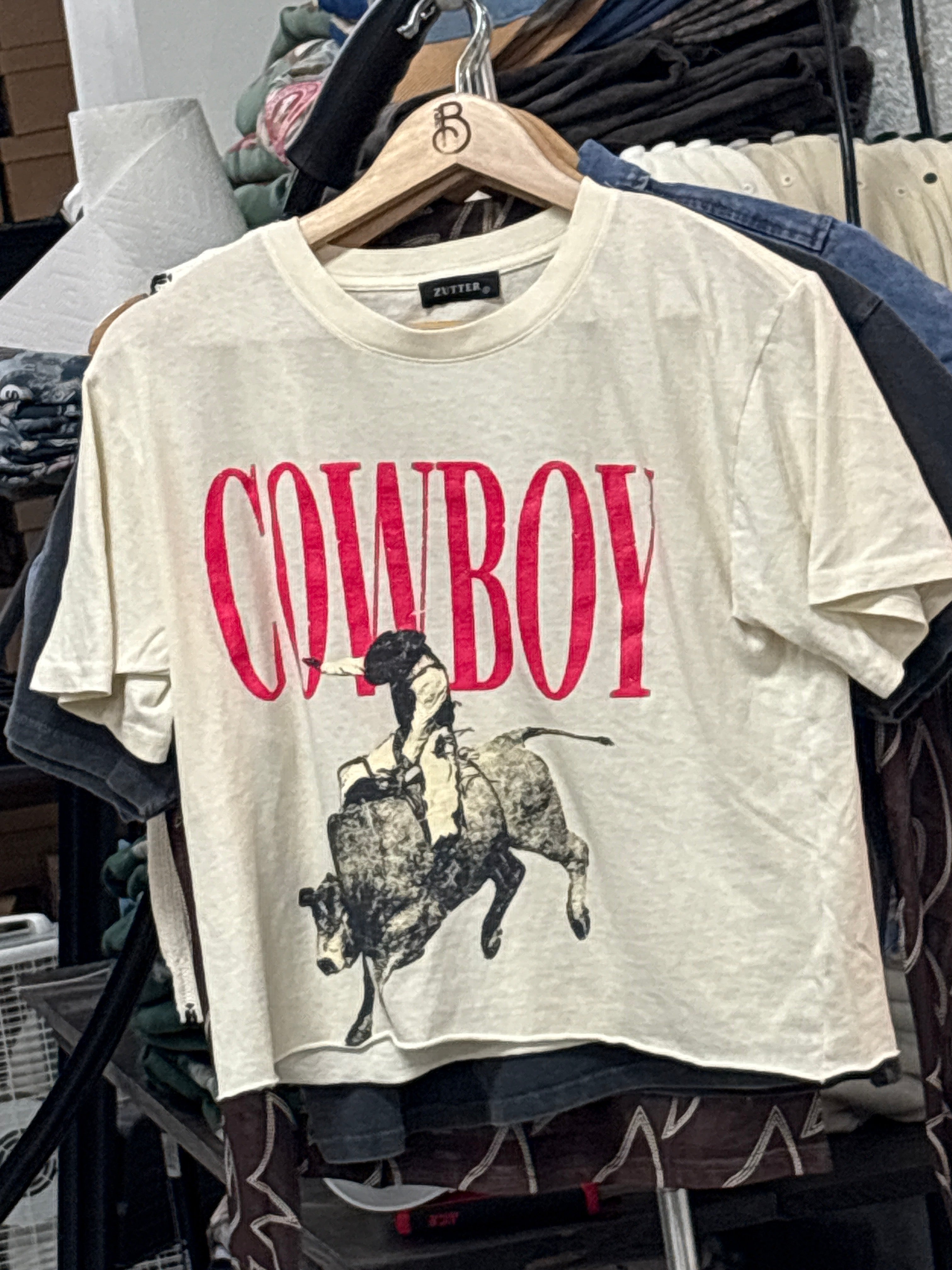 The Shira Tee brings a playful western vibe with its off-white fabric and bold pink "COWBOY" graphic, featuring a bucking bull and cowboy. Its cropped length and raw hem add a trendy twist, while short sleeves keep it light and easy. Perfect for standing out with a fun, rugged edge.