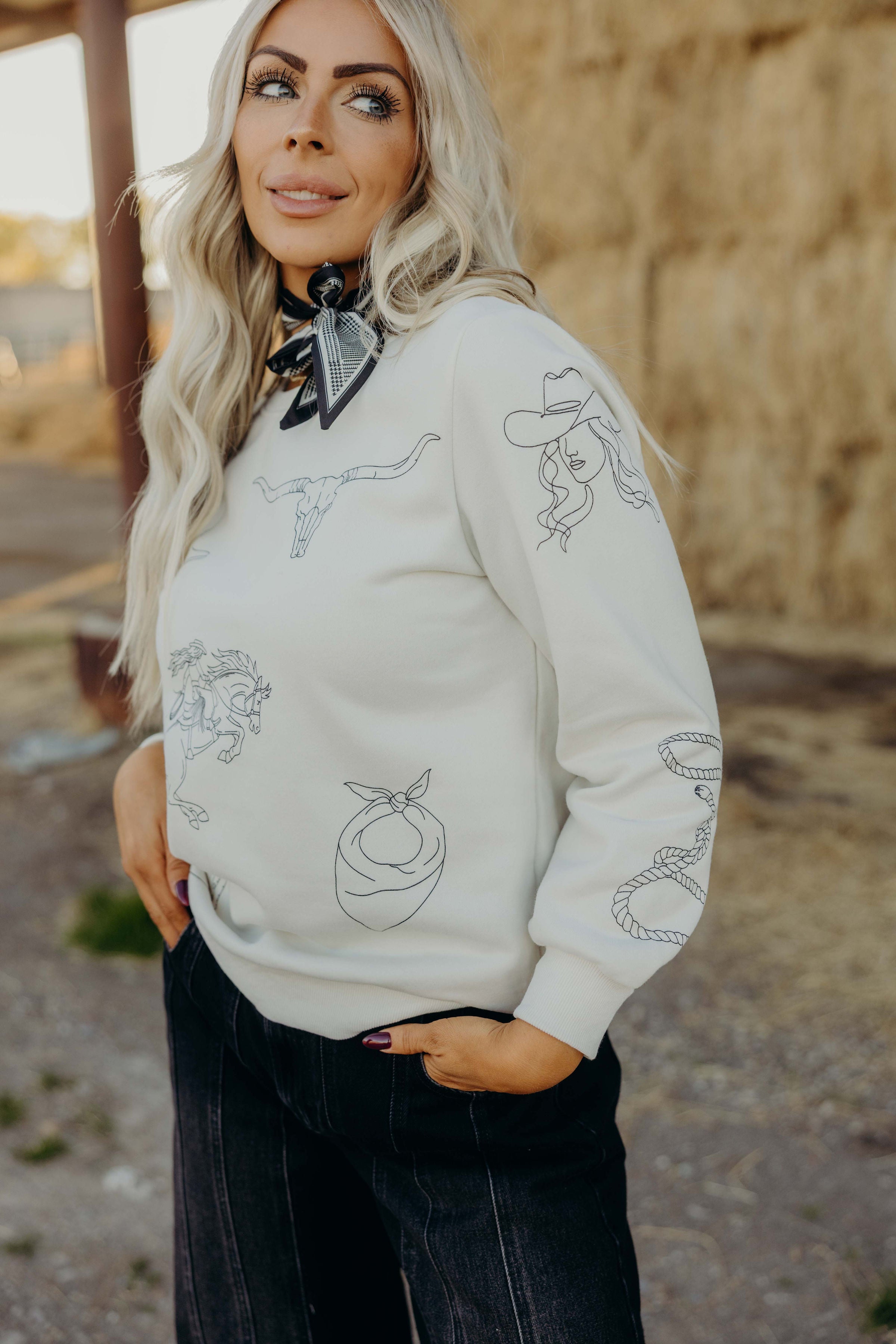 The Eve Sweatshirt brings effortless Western charm to your everyday wardrobe. Crafted from ultra-soft fabric, this ivory pullover features a striking Western motif graphic that captures authentic frontier spirit. The relaxed fit drapes beautifully, offering comfort without compromise—perfect for layering on cool days or wearing solo. Whether you're channeling ranch-inspired style or simply craving cozy sophistication, this sweatshirt delivers both warmth and character. A versatile piece that celebrates your bold, independent spirit.