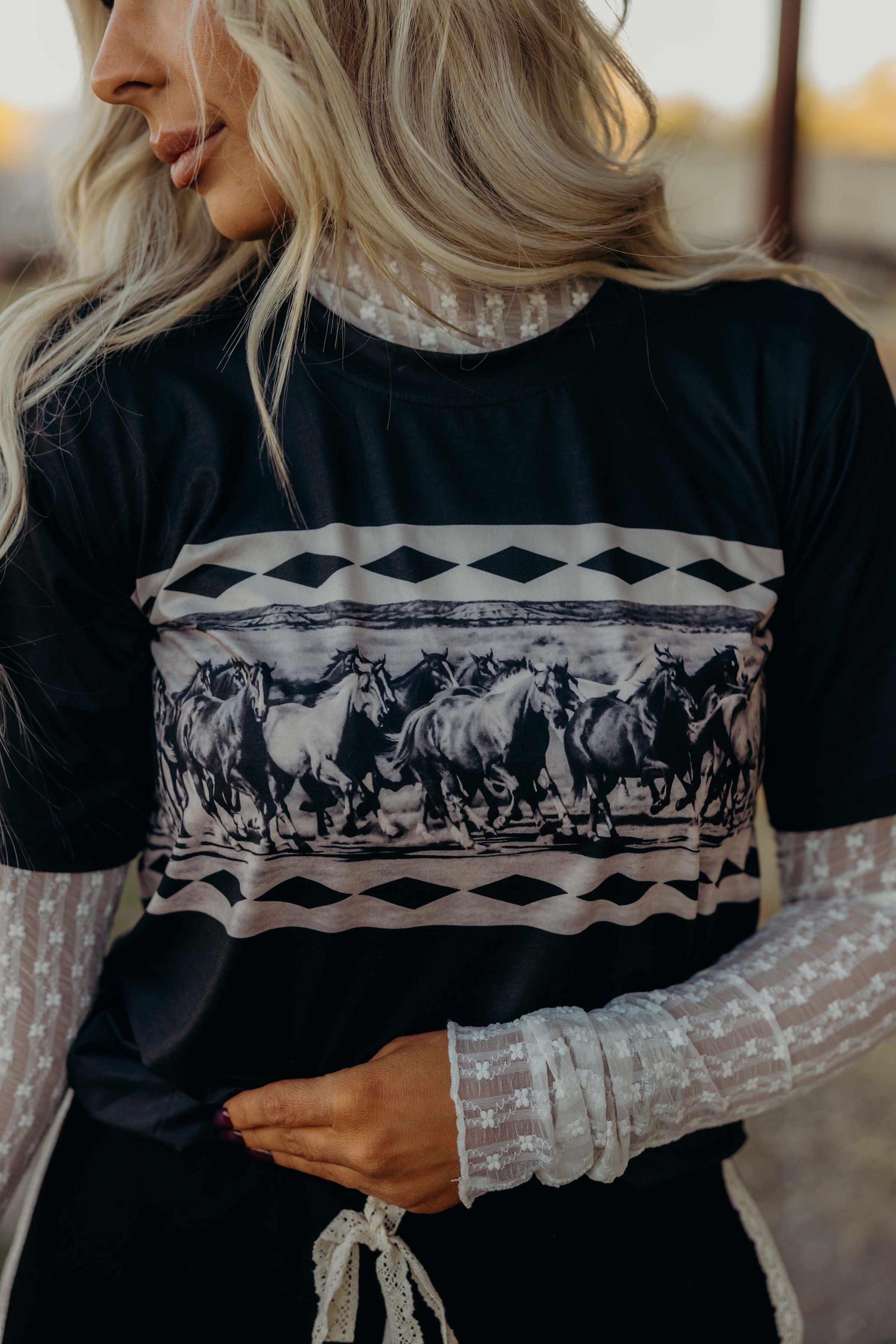 The Novalie Tee brings Western spirit to your everyday wardrobe with its striking running horses graphic rendered in classic buck stitch print. This black short sleeve tee captures the energy and freedom of the open range, making it perfect for anyone who loves bold, authentic style. Whether you're heading out for a casual day or want to showcase your Western heritage, this versatile piece delivers comfort and character in one timeless design.