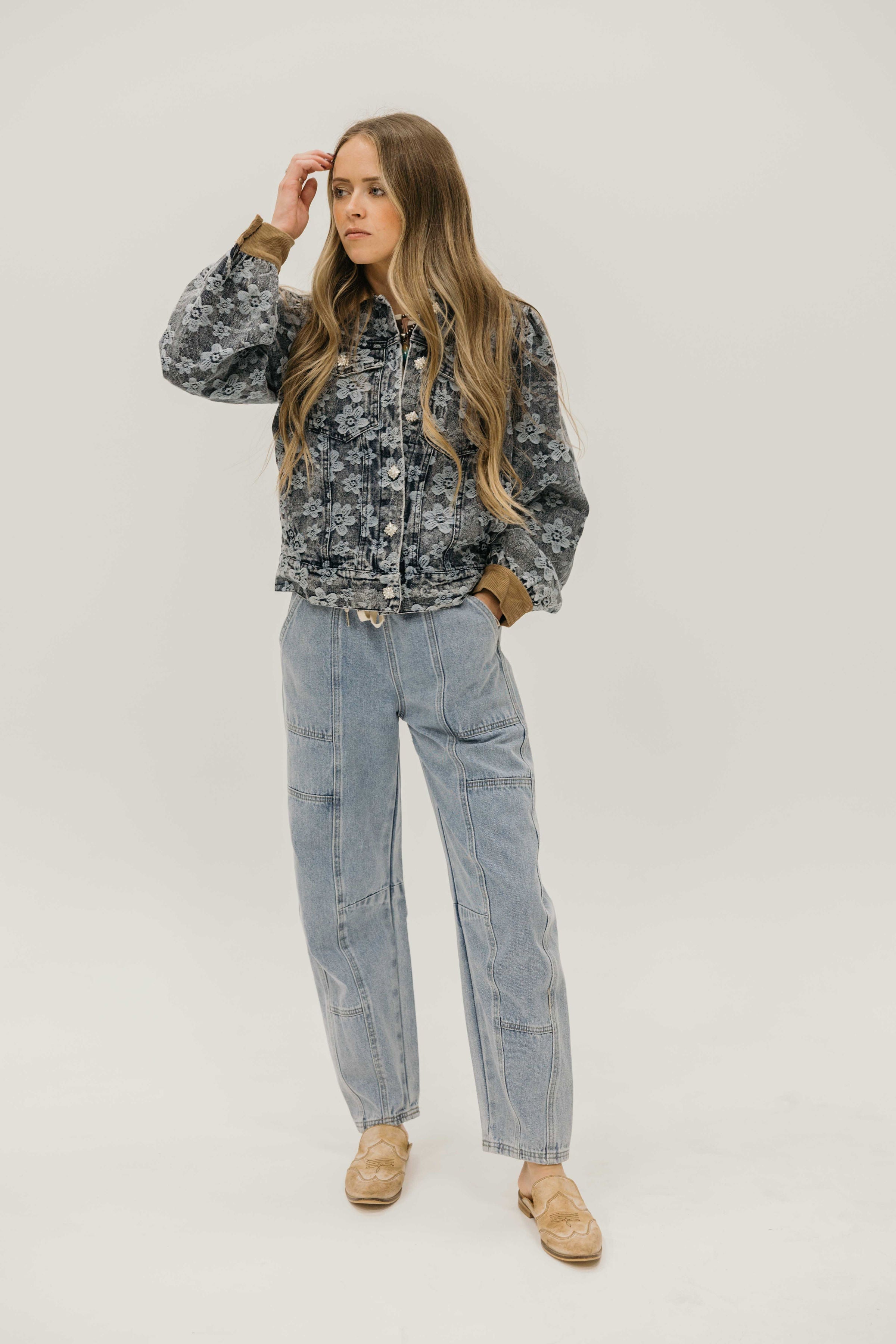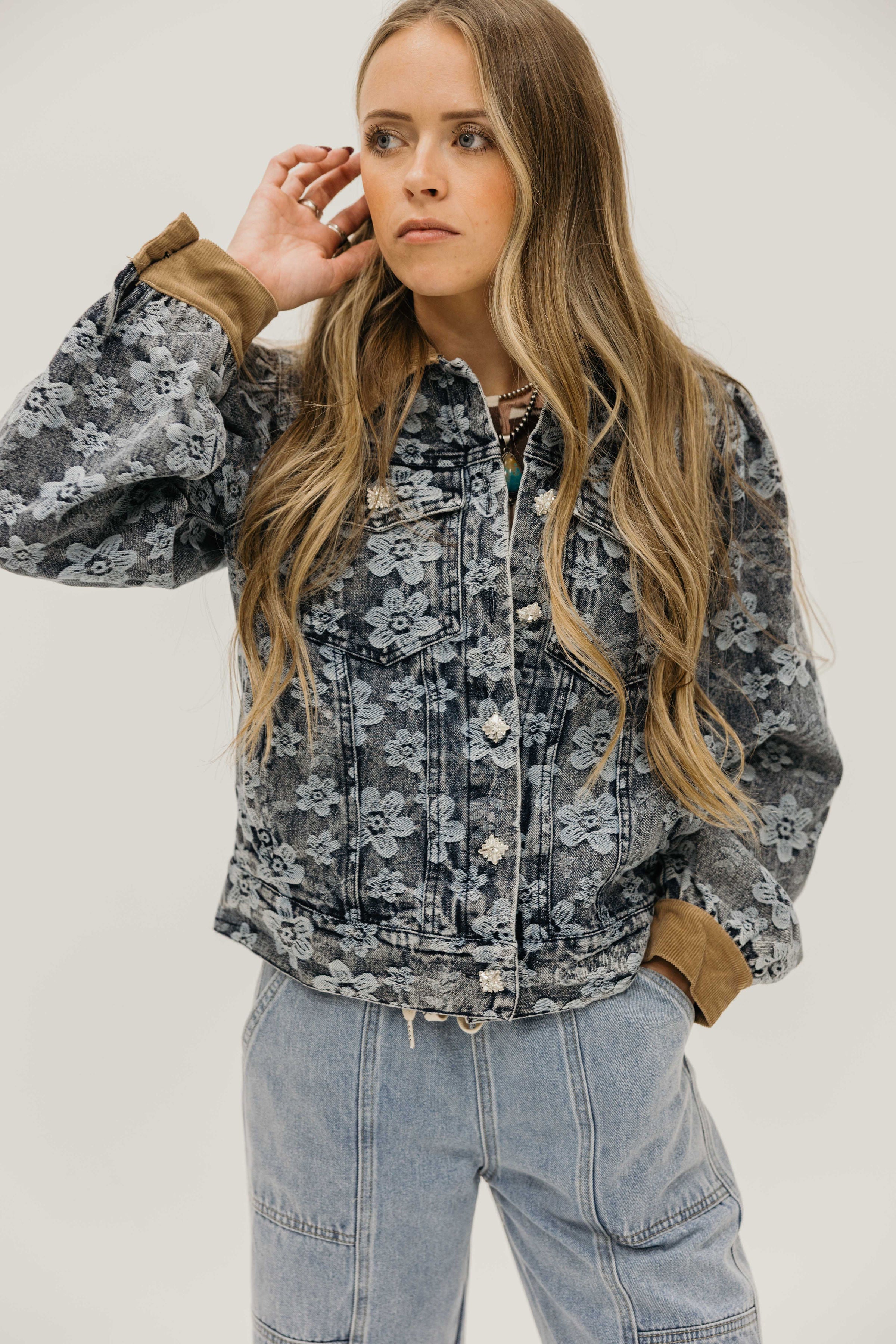 The Dawnstar Jacket brings Western charm to your everyday wardrobe with its striking floral denim print and eye catching details. This long sleeve button down features a show stopping oversized rhinestone button that catches the light beautifully, while the corduroy contrast collar and cuffs add texture and dimension. Practical chest pockets keep your essentials within reach. Perfect for layering or wearing solo, this jacket celebrates bold style with a supportive, confident edge.