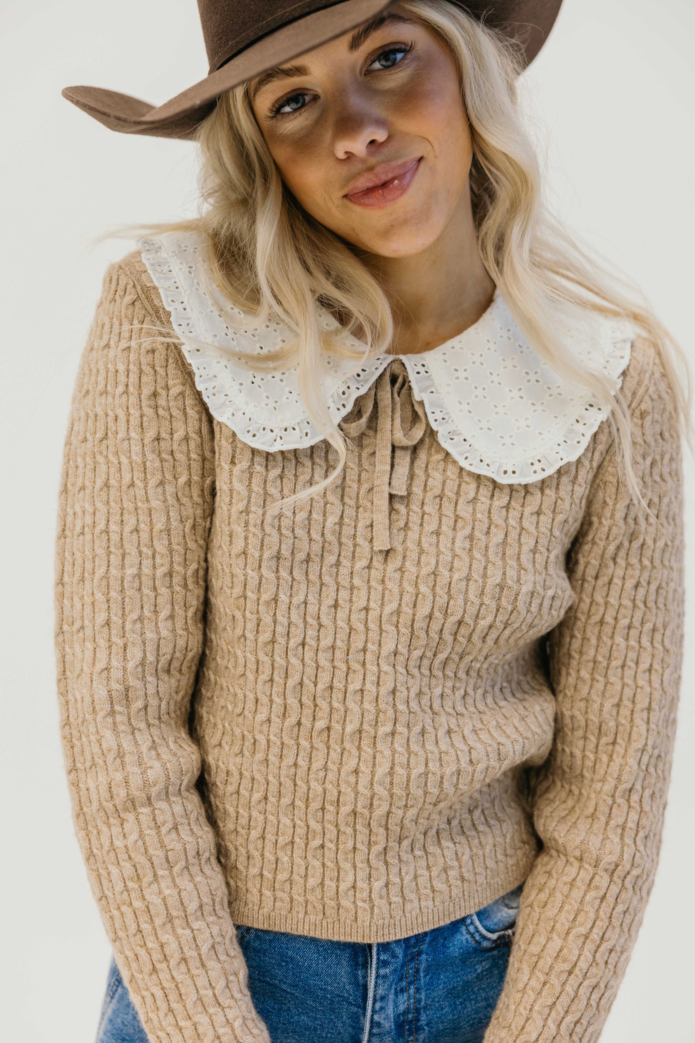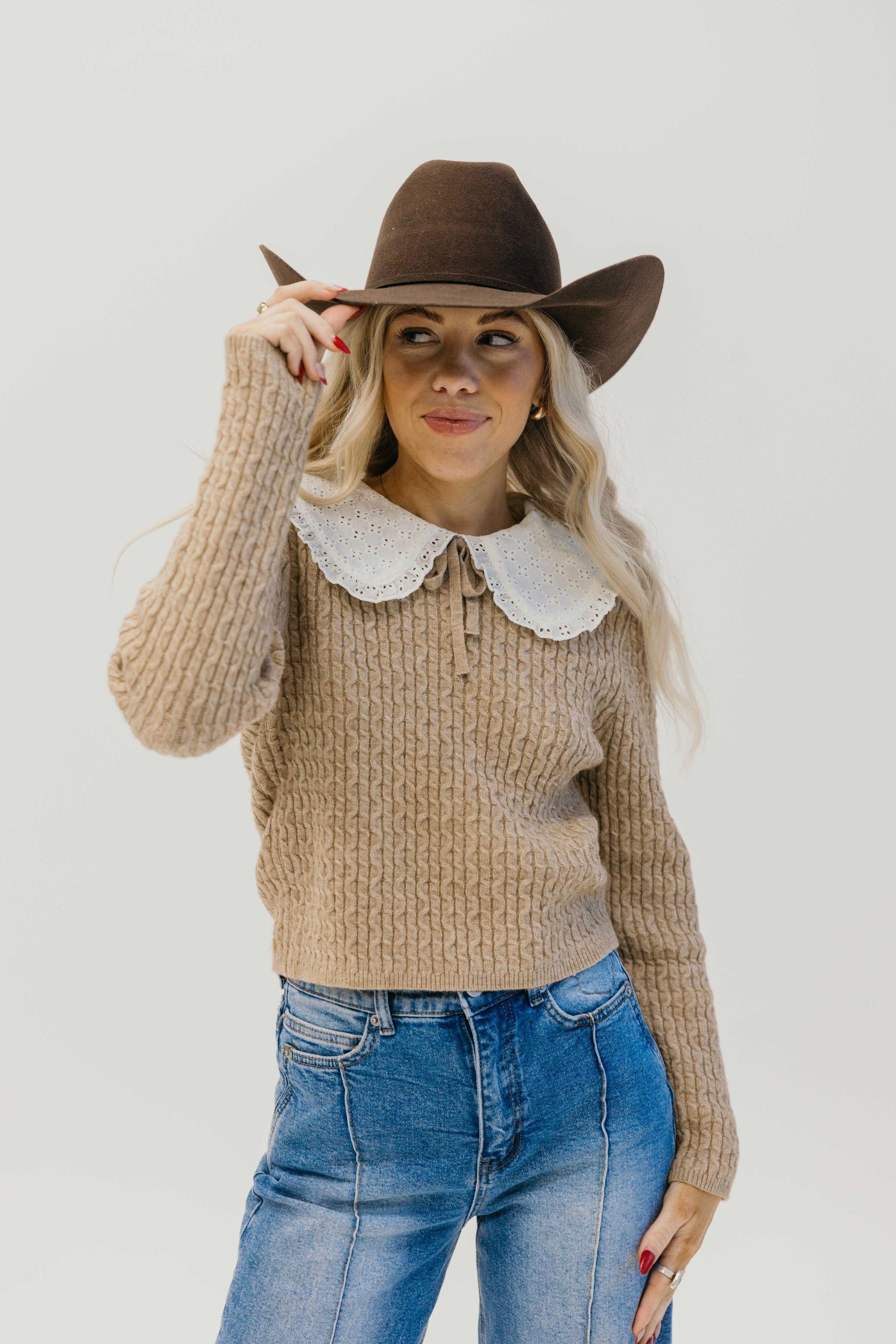 The Flinter Sweater brings vintage charm to your everyday wardrobe. This mocha western sweater features a distinctive crochet knit peter pan collar and rich cable knit texture that adds dimension and visual interest. The long sleeves provide warmth while the slightly cropped silhouette creates a flattering, modern fit that pairs effortlessly with high waisted jeans or skirts. Perfect for layering or wearing solo, this piece combines classic western style with contemporary details for a look that's undeniably you.