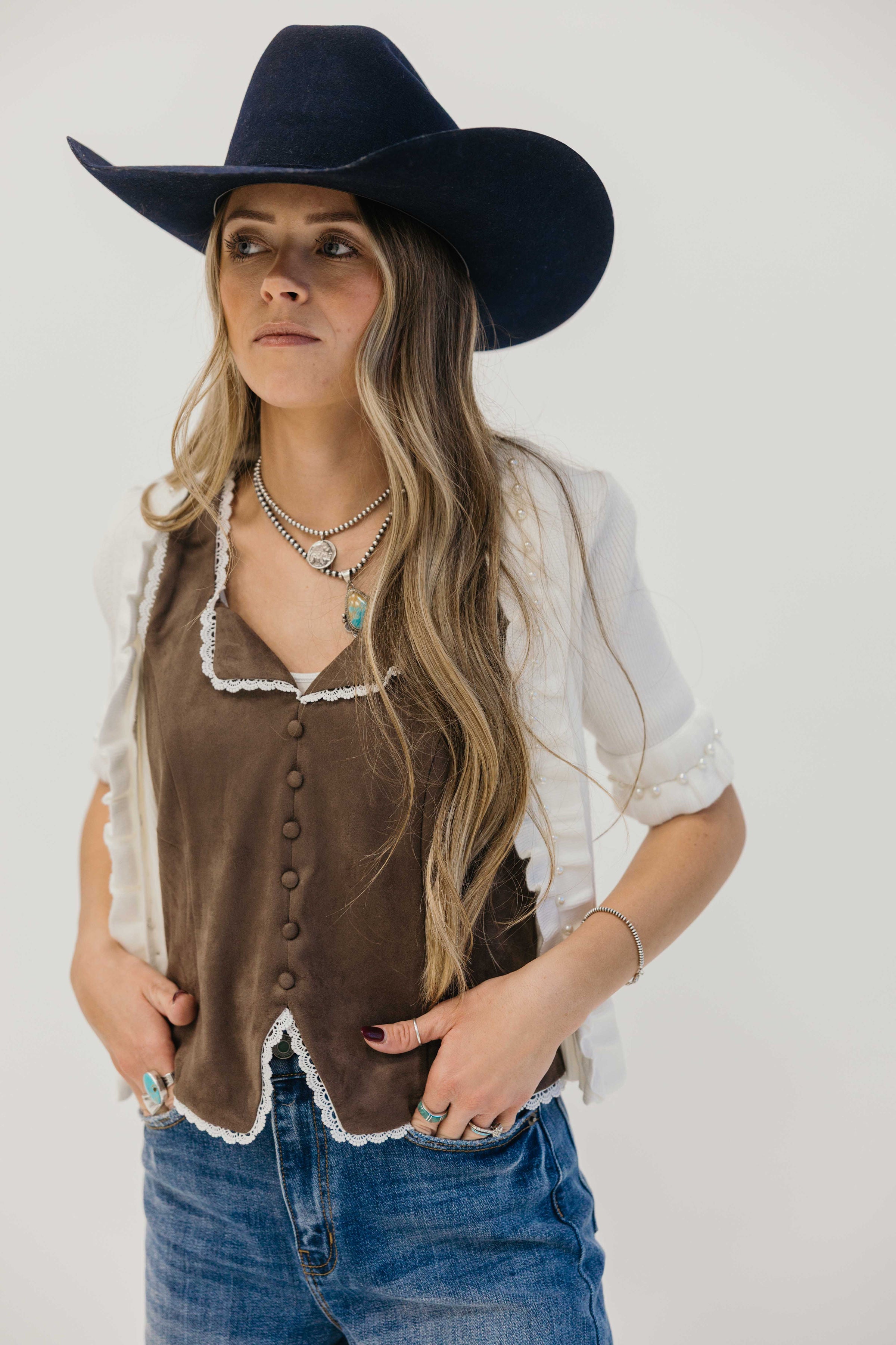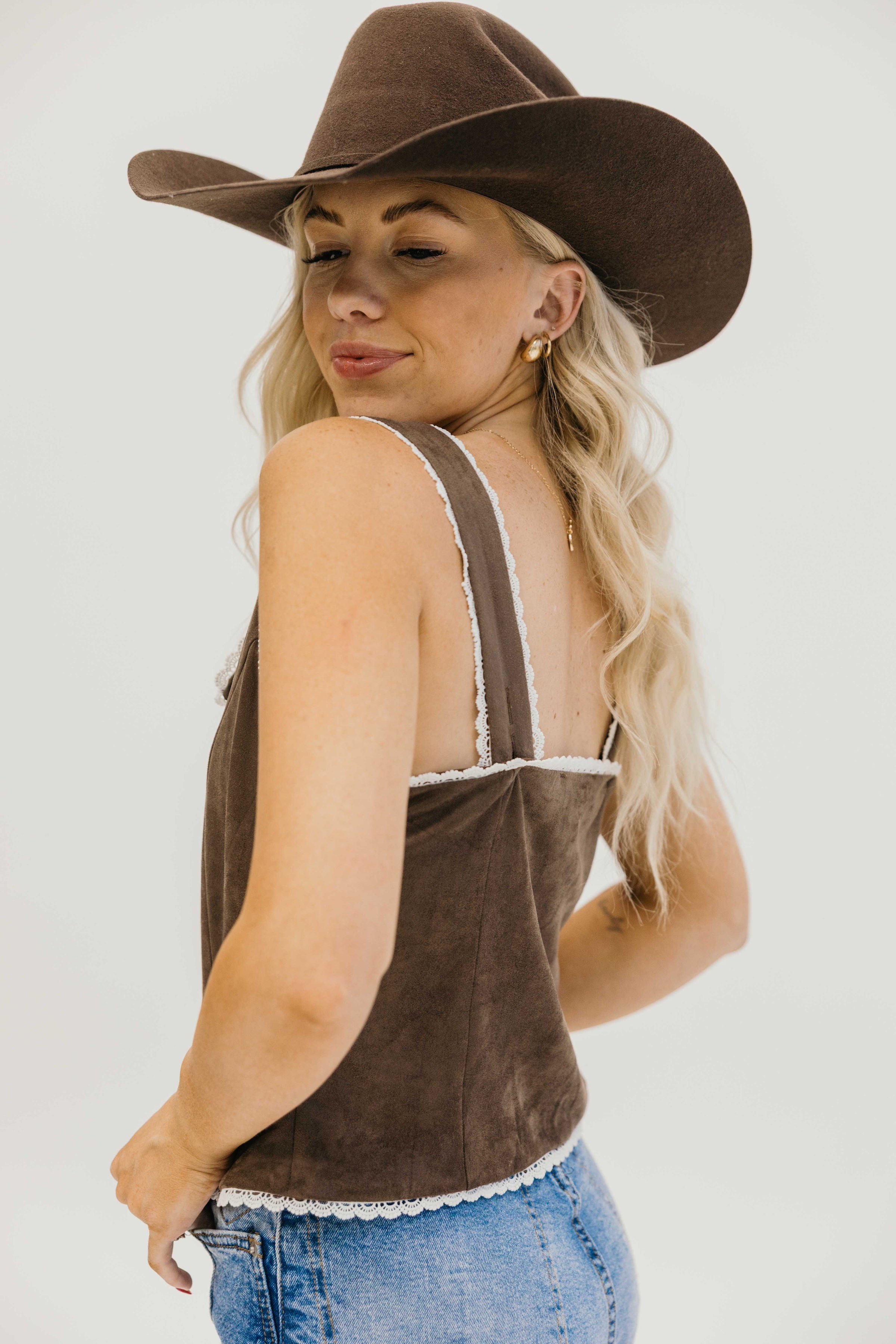 Unleash your inner wild side with The Harker Tank, a dark brown western blazer tank that will make you stand out in any crowd. Its fake button down front and white lace trim add a touch of class, while its sleeveless and cropped length features give you the freedom to show off your adventurous spirit. Made from soft suede material, this tank is not only stylish but also comfortable to wear, making it perfect for any daring social event.