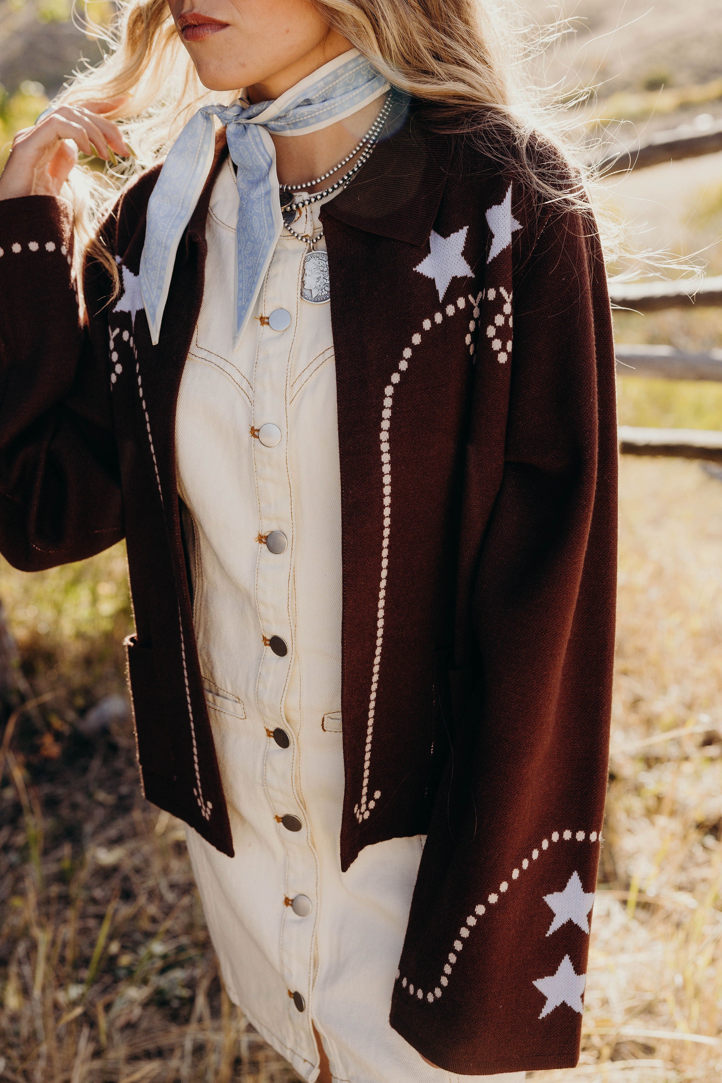 Embrace winter in style with the Starlit Rodeo Cardigan. This brown knitted western-inspired piece features distinctive star and rope stitch details, capturing the spirit of National Finals Rodeo. Perfect for chilly Vegas nights, it offers cozy warmth while keeping you effortlessly chic and connected to rodeo culture.