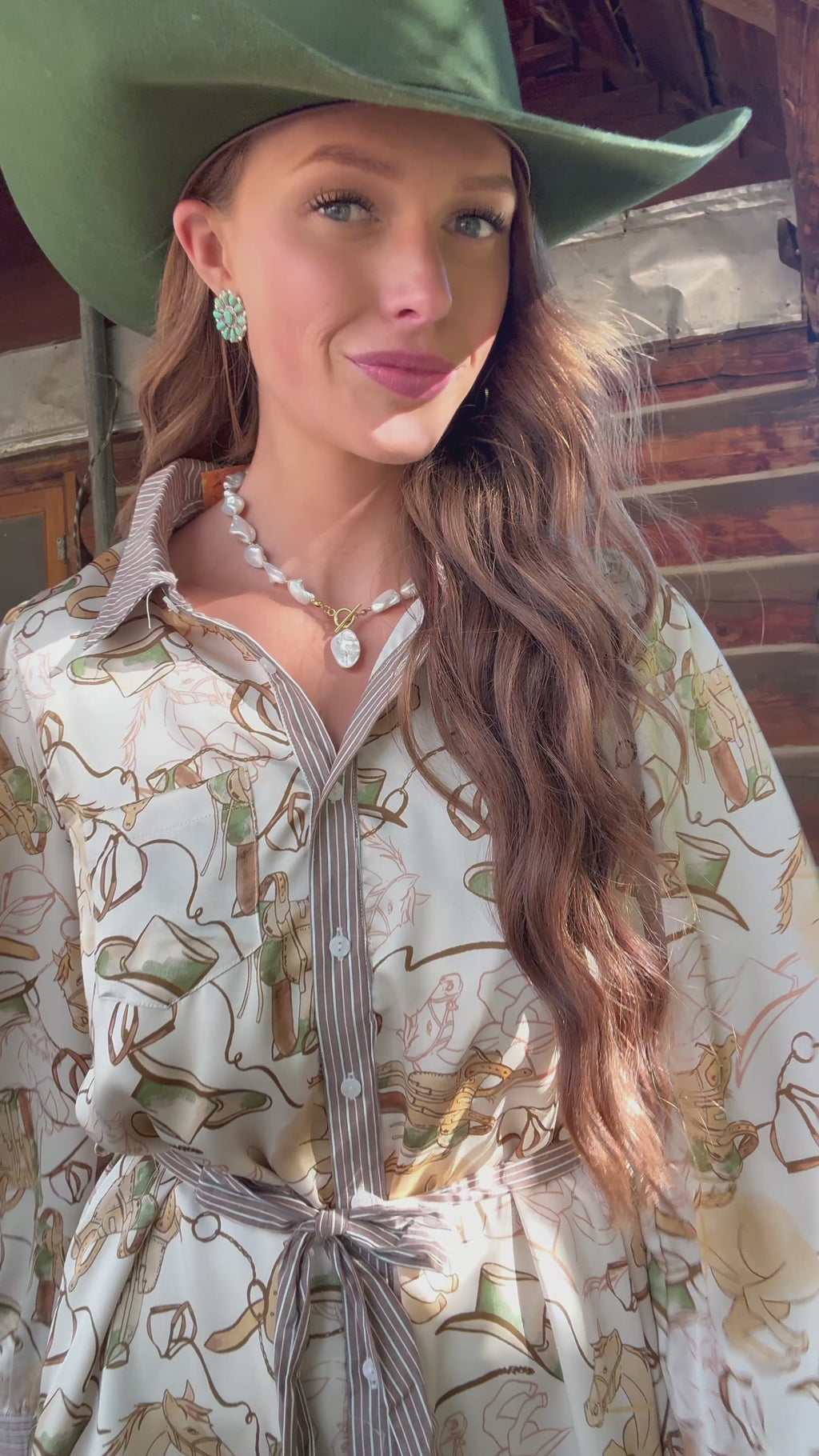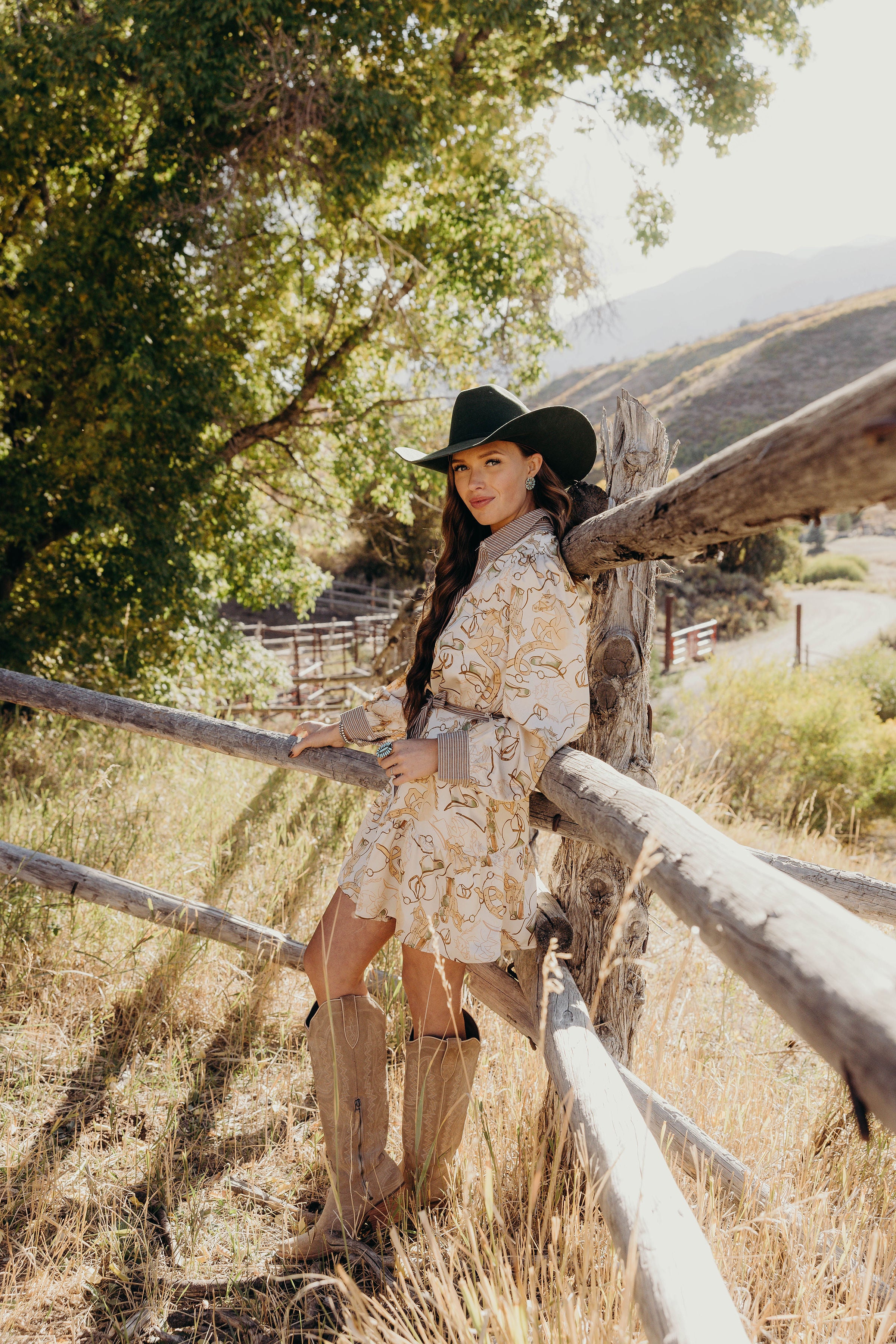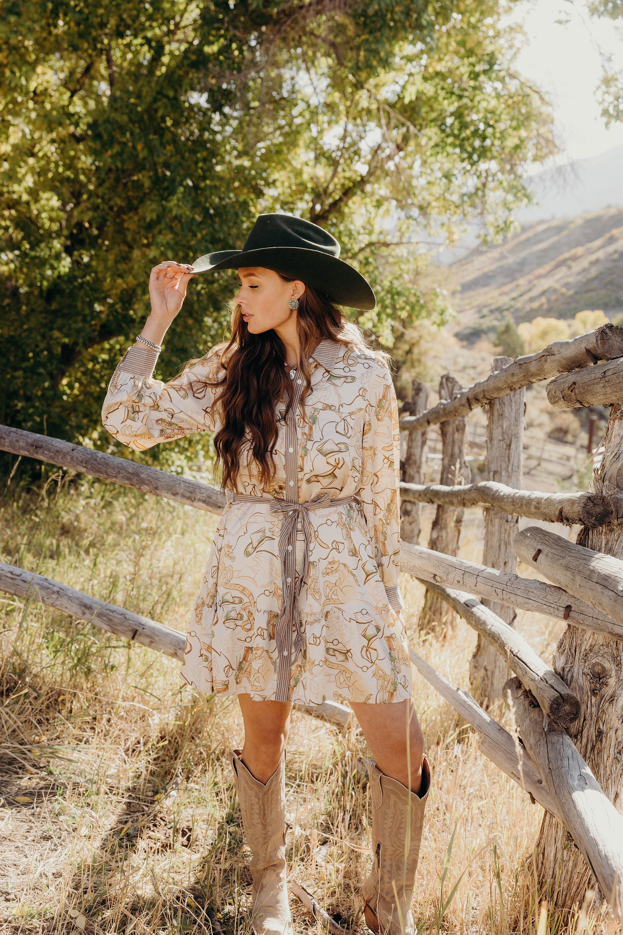 Embrace playful charm with The Alder Dress, featuring a soft eggshell base splashed with lively western prints. Its contrast striped collar and button-down placket add whimsical flair, while long puff sleeves and a ruffled hem bring flirty movement. Mini in length, this fall-ready dress pairs fun with a fresh twist on western style.