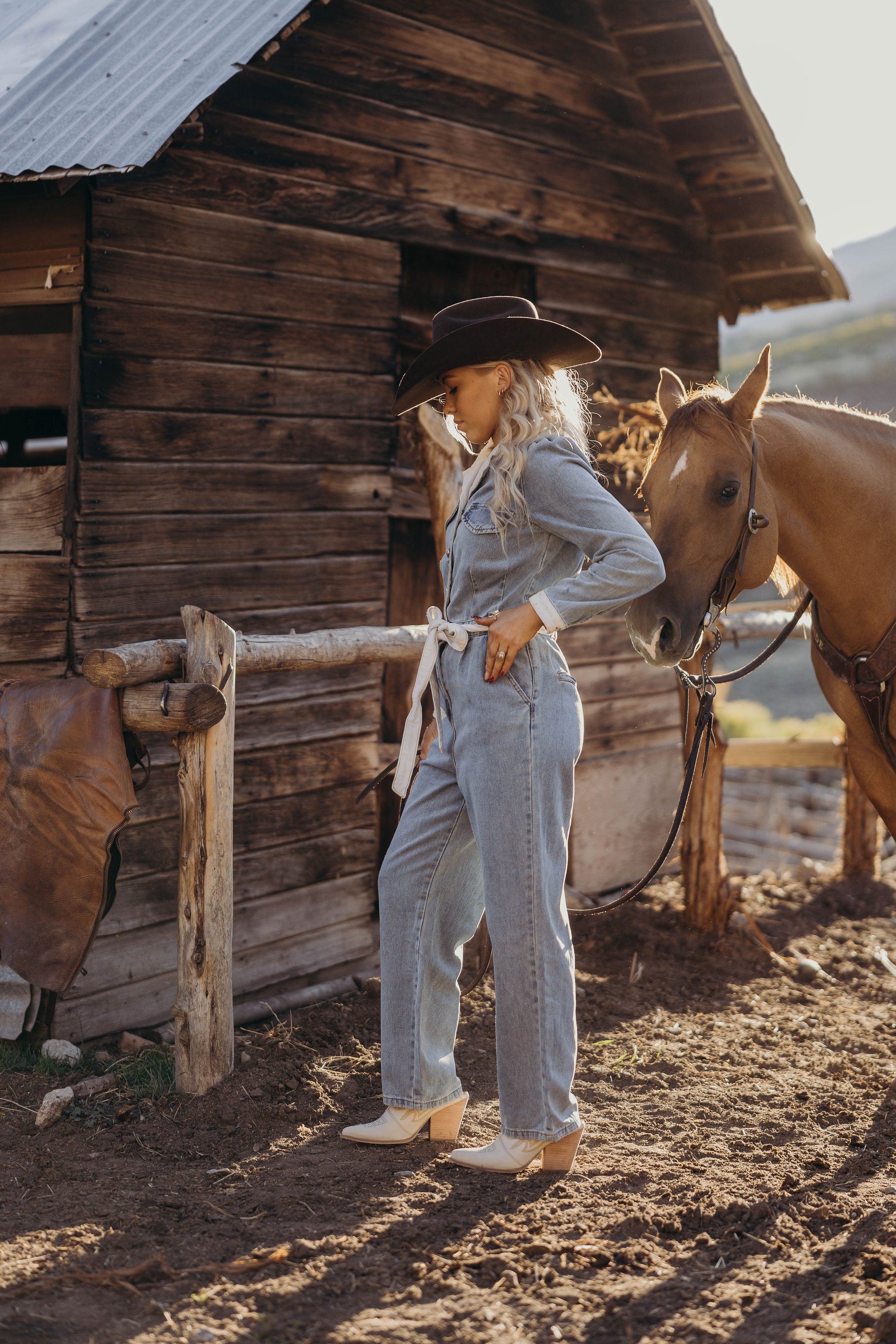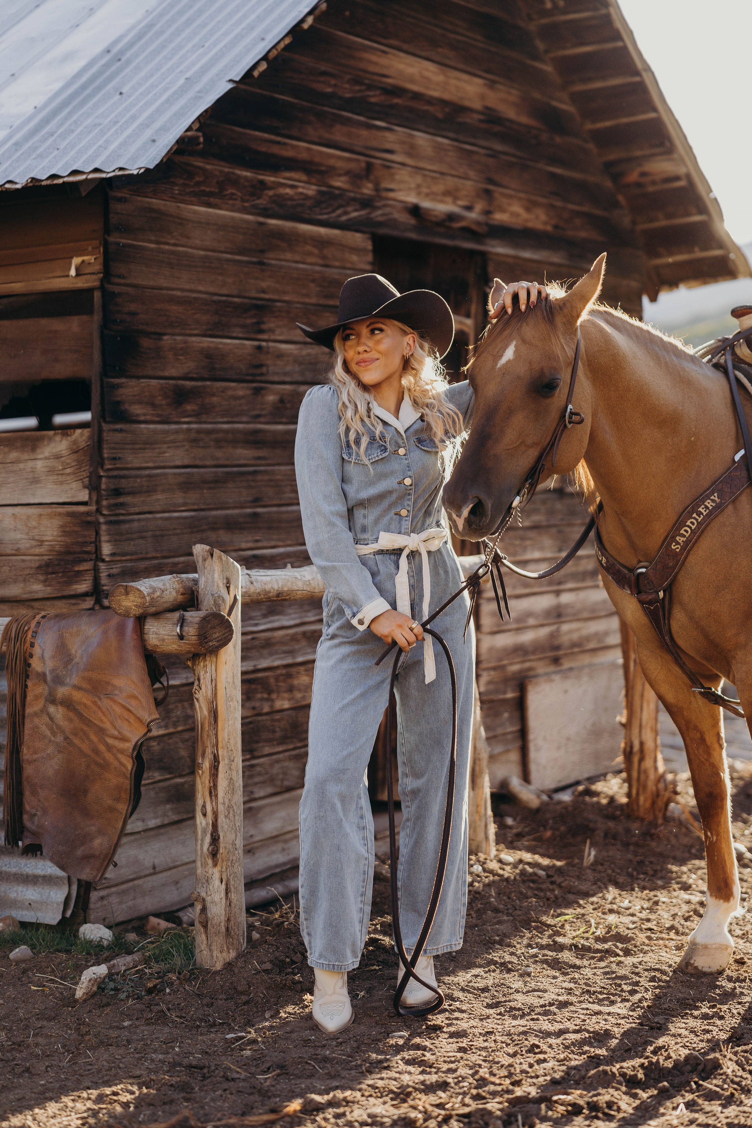 Wrap yourself up in the flirty fun of The Elvira! This romper is made from denim, featuring a button-up front, belt detail, and long sleeves. Perfect for making a chic statement this fall