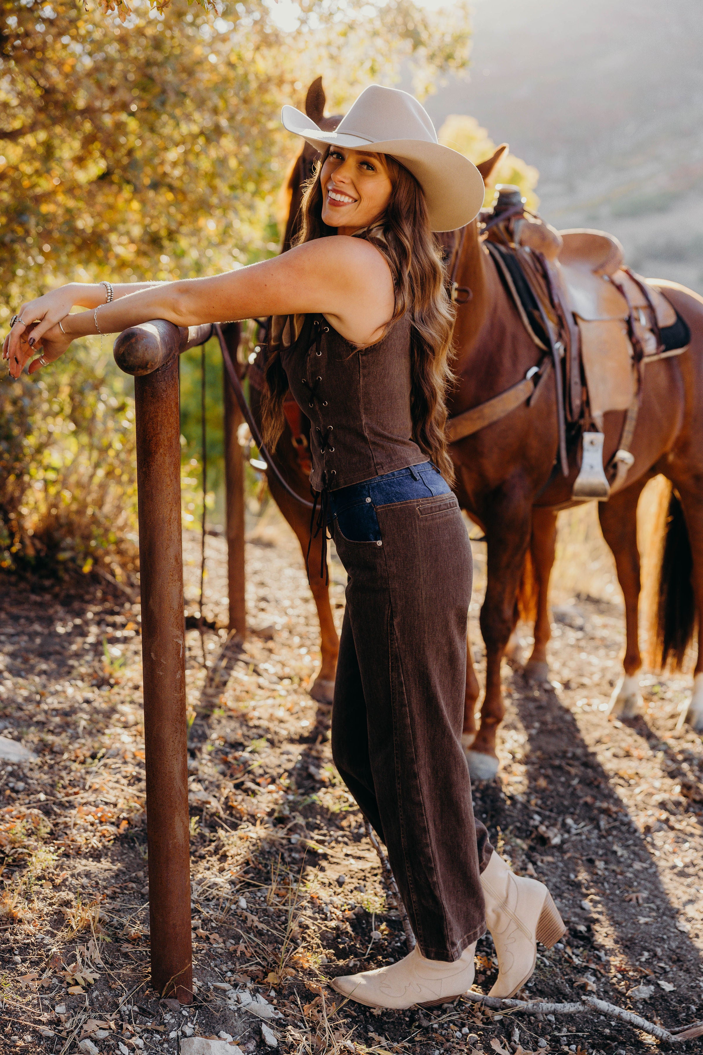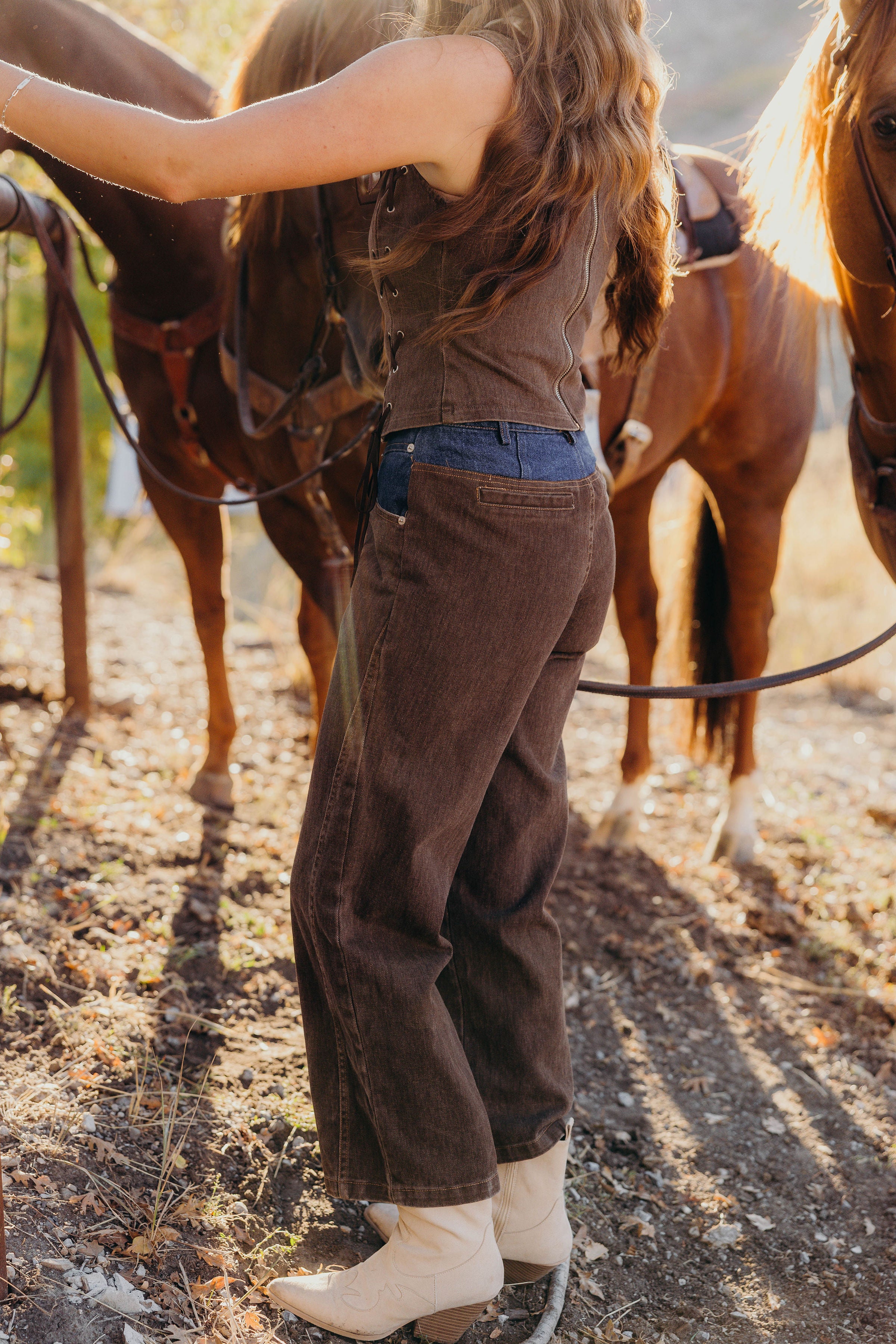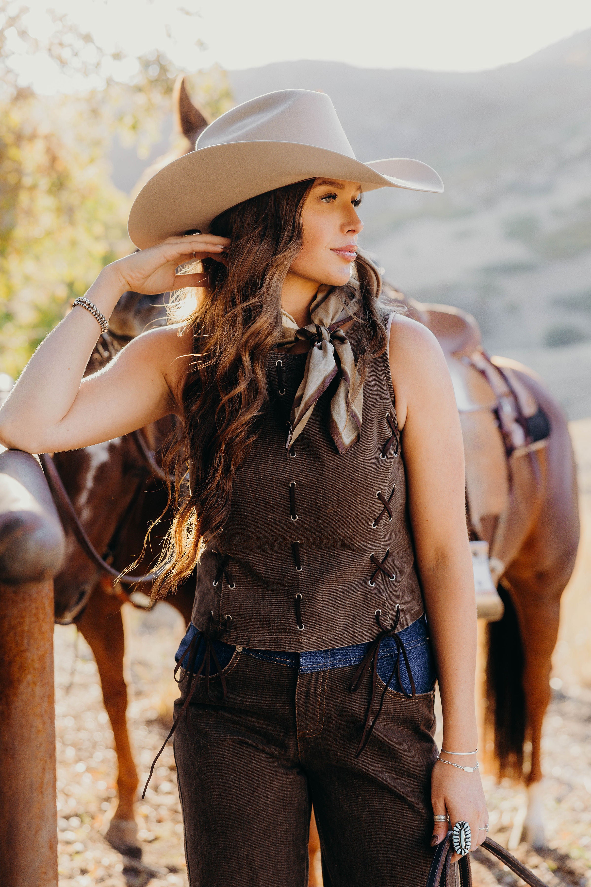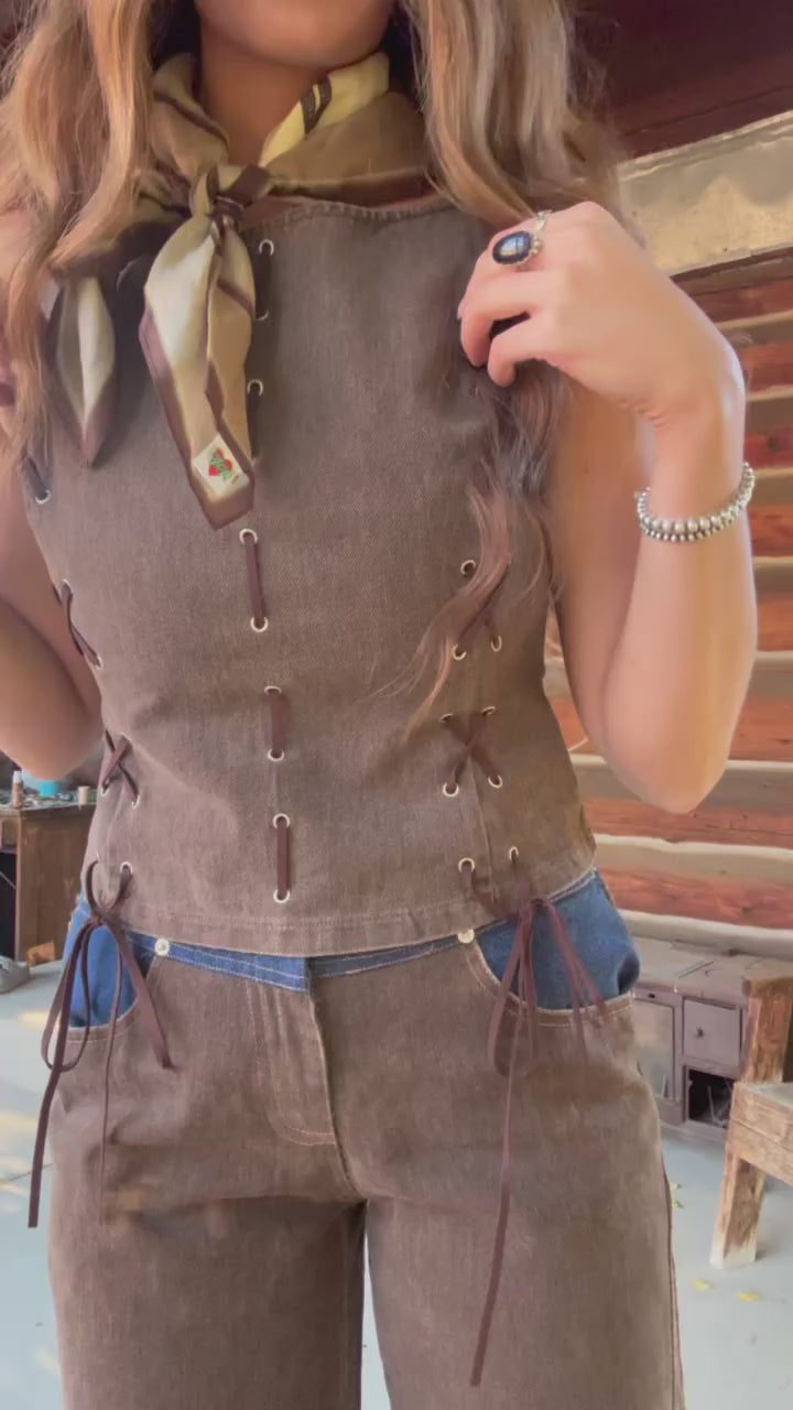 Get ready to turn heads in the Wanted Woman Set, perfect for winter nights at NFR in Vegas. This playful western inspired ensemble features high waisted brown denim pants with striking contrast details for a bold look. The sleeveless vest flaunts delicate eyelet accents and a chic boat neck, blending rugged charm with feminine flair. Stay warm and stylish while embracing your wild side in this standout set made for confident trailblazers.