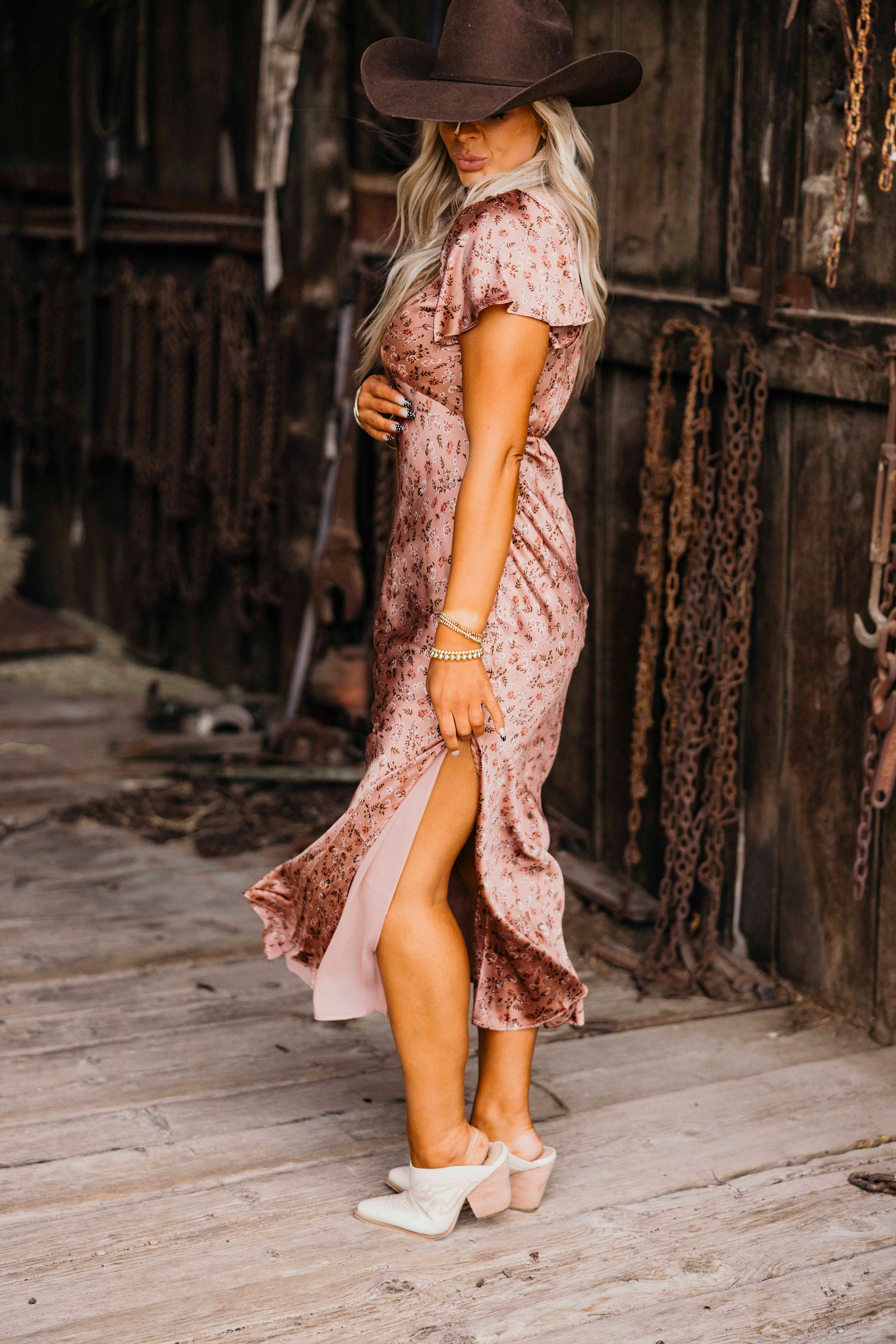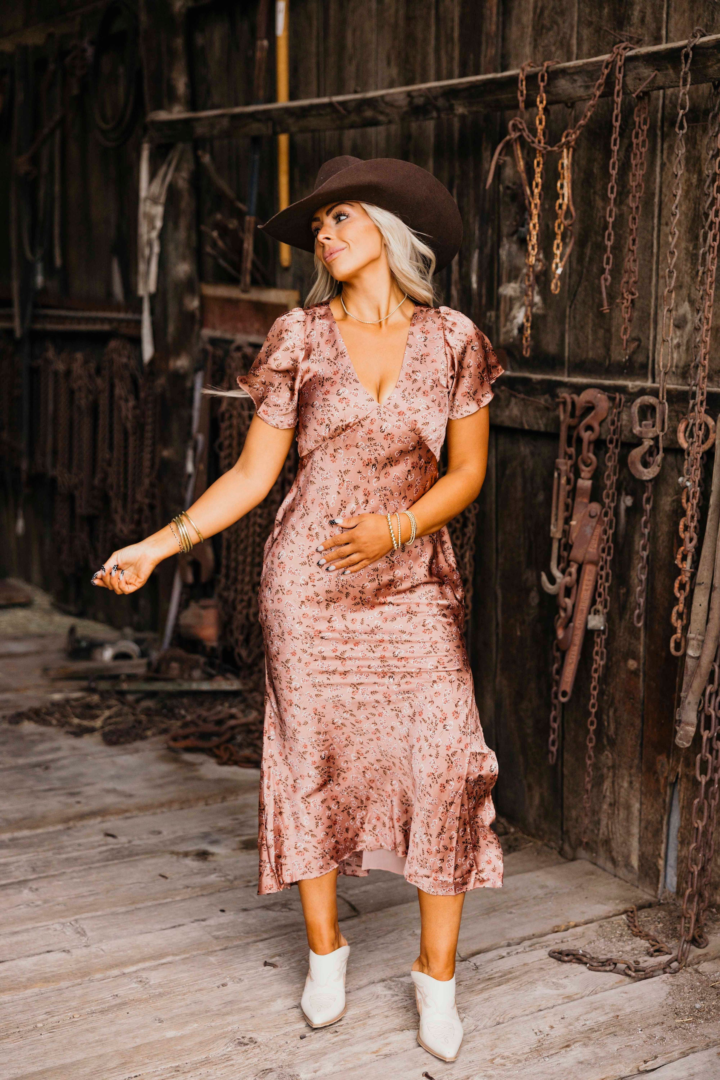 The Primrose Dress: a playful floral maxi that dances with every step. Its plunging neckline and chevron detailing under the bust add a flirty twist, while short flutter sleeves bring a breezy charm. Perfect for making a statement wherever you go.