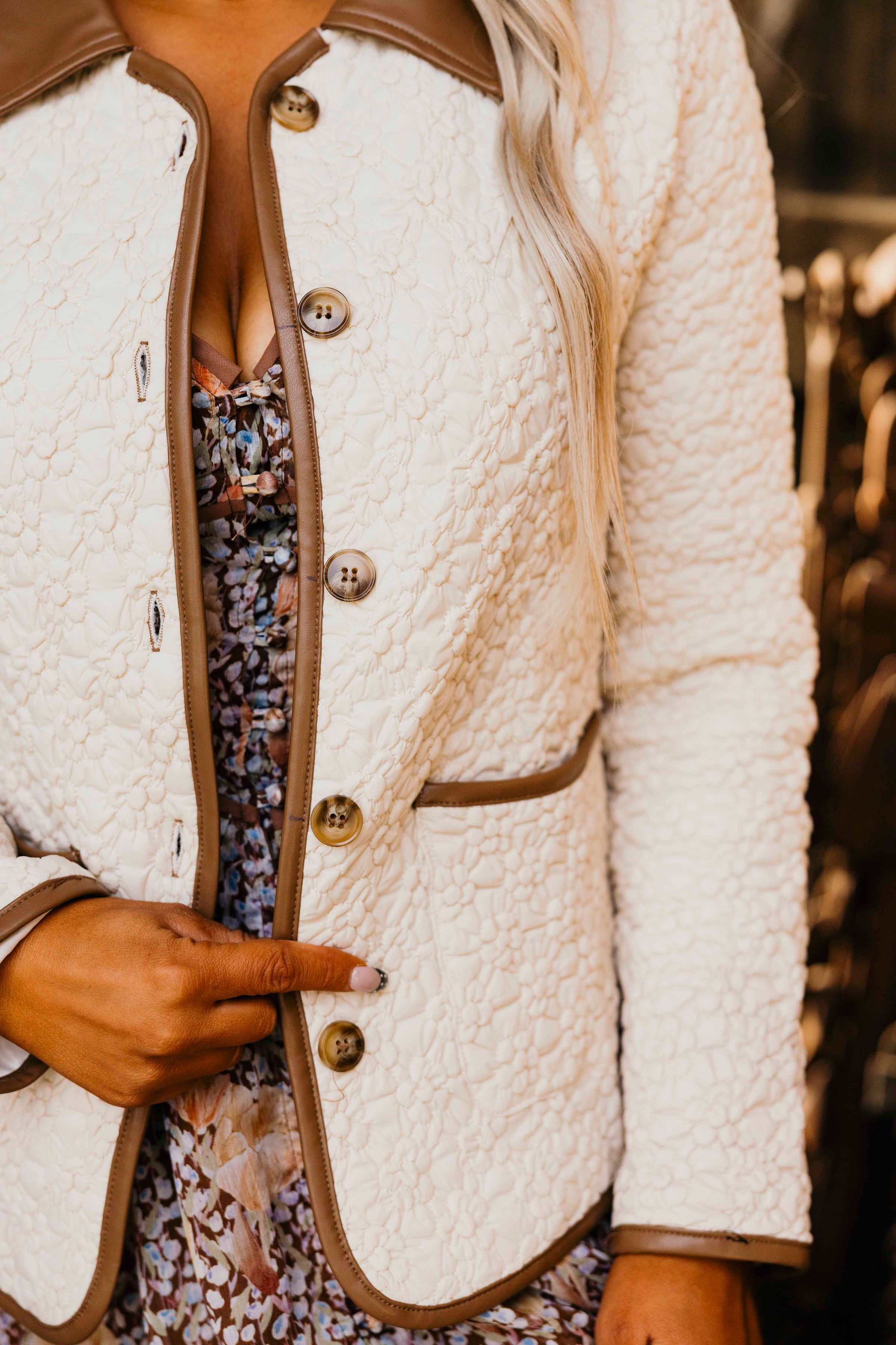 Elevate your fall wardrobe with The Elara Jacket, blending classic Western style with modern comfort. Its cream and coffee hues highlight a delicate floral quilt pattern, while the vegan leather brown collar and contrast brown trim add refined detail. Designed with a button-down front, this jacket offers both style and ease, making it your go-to layer for crisp autumn days. Embrace sustainable fashion without compromising on sophistication.