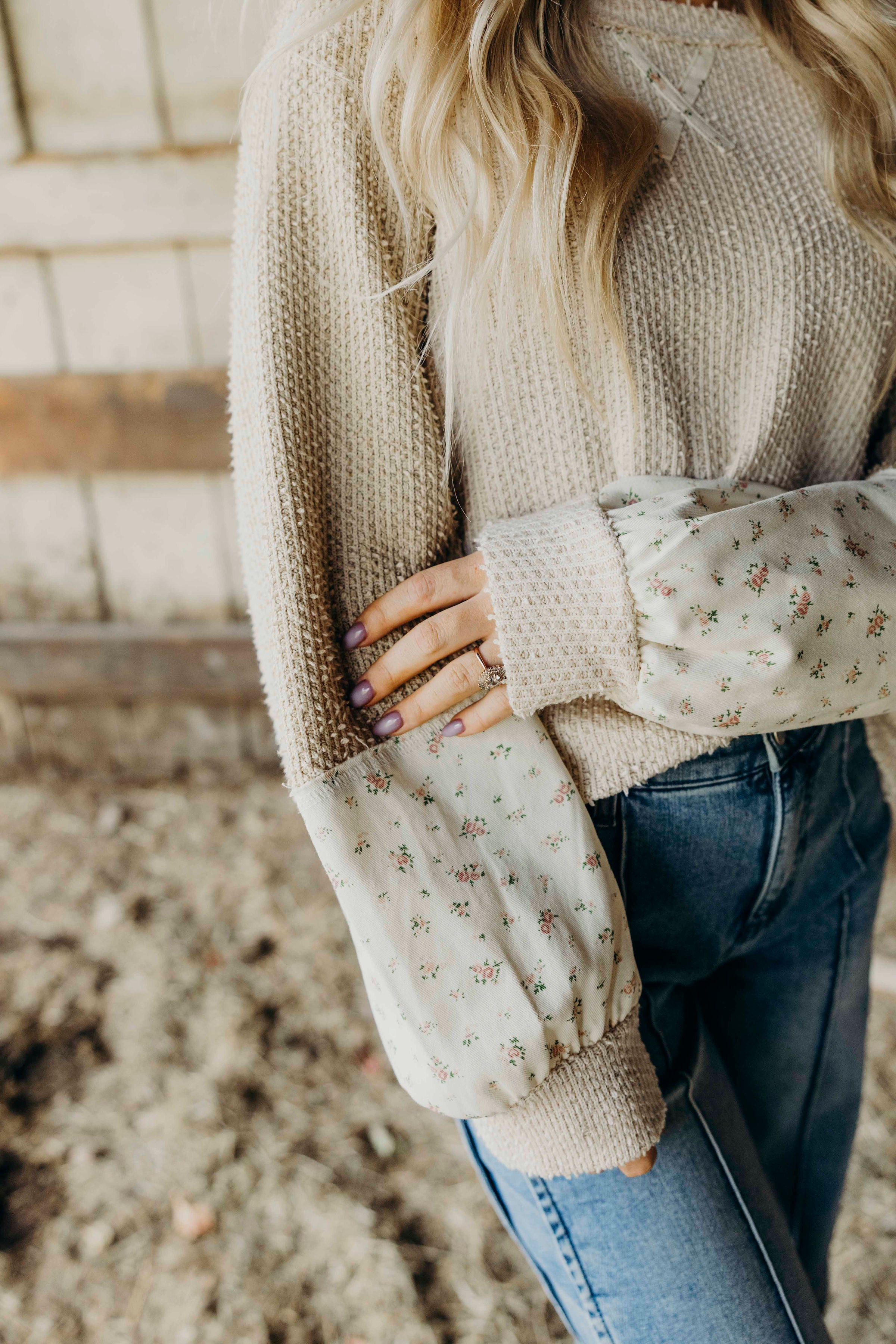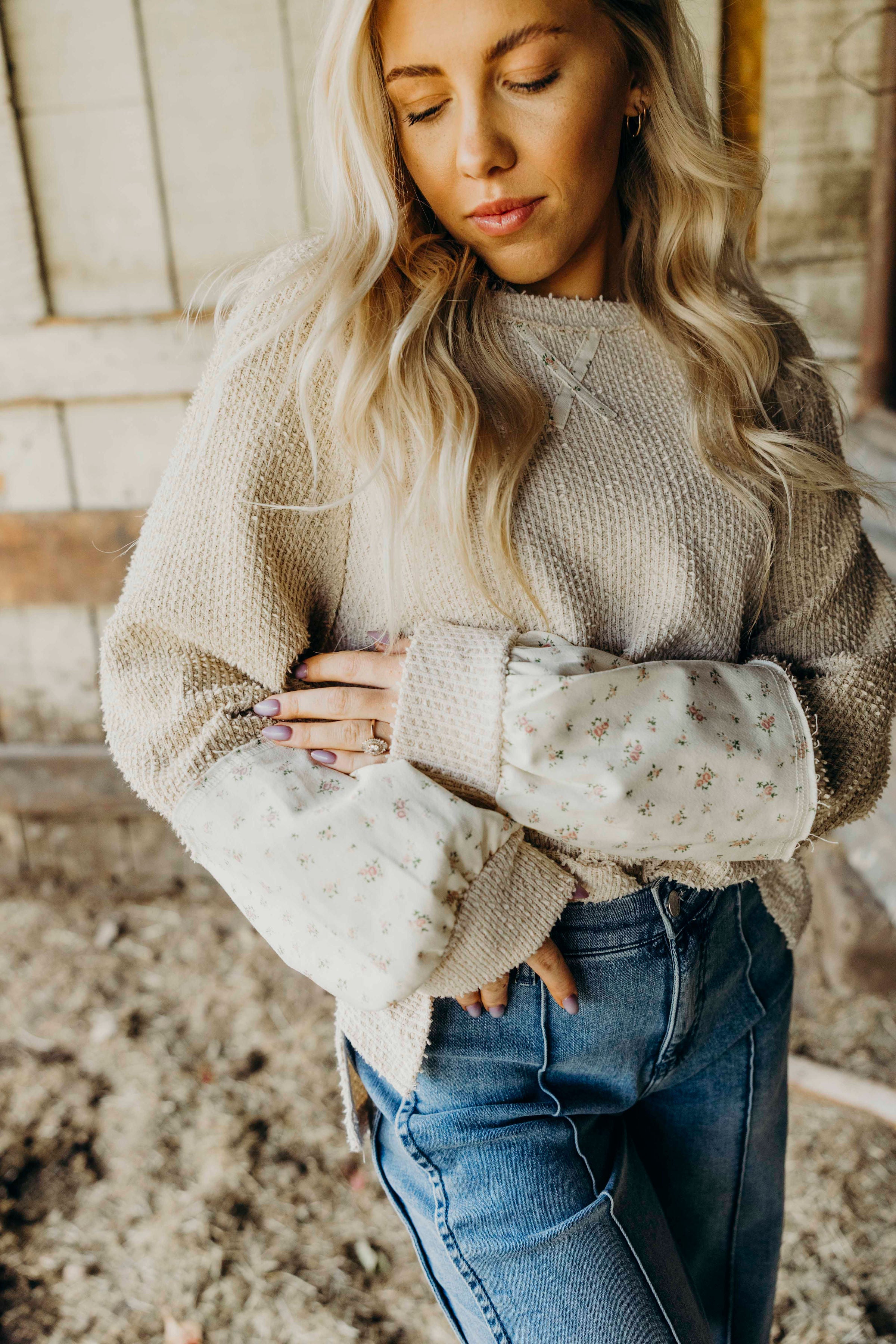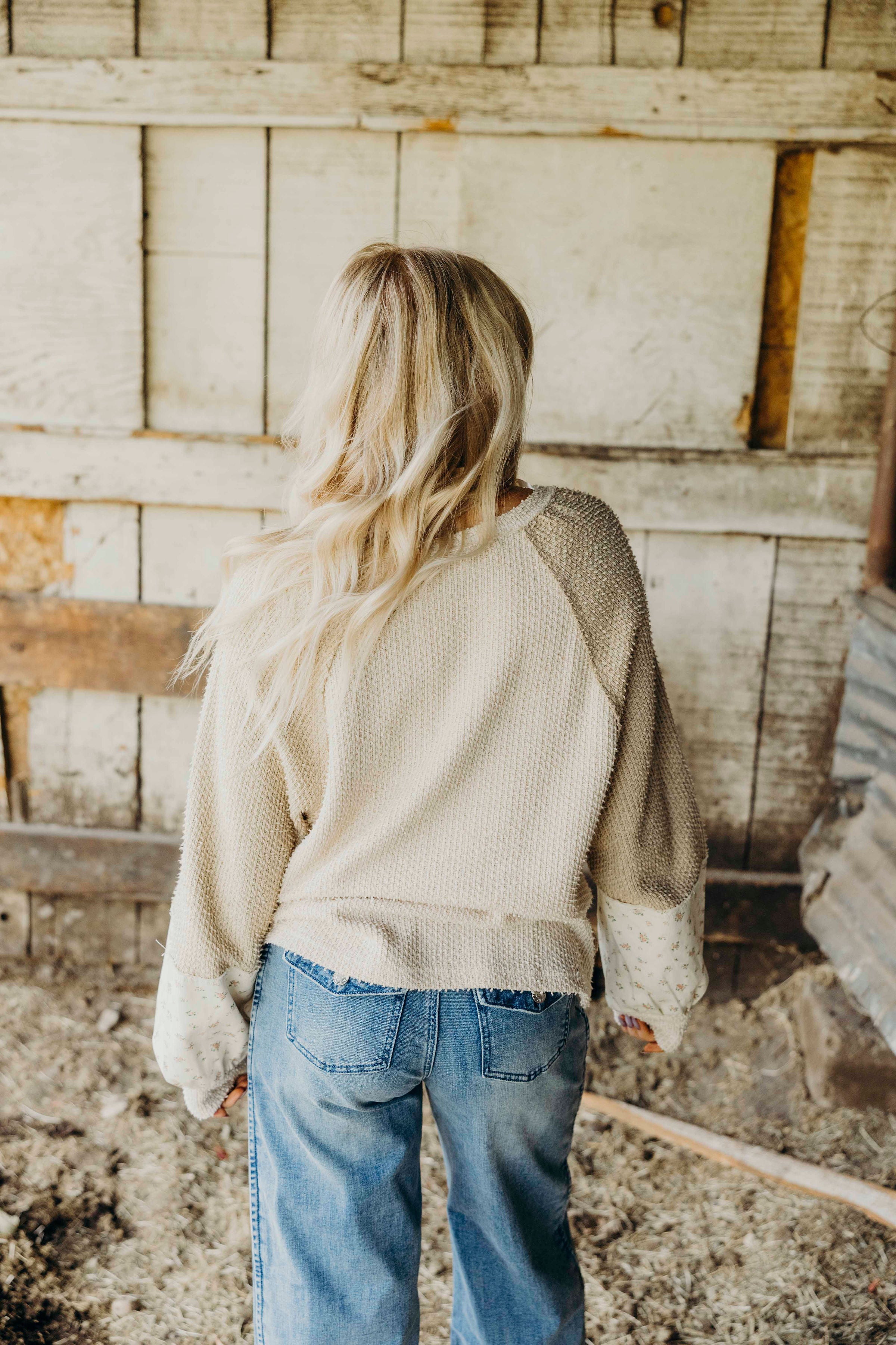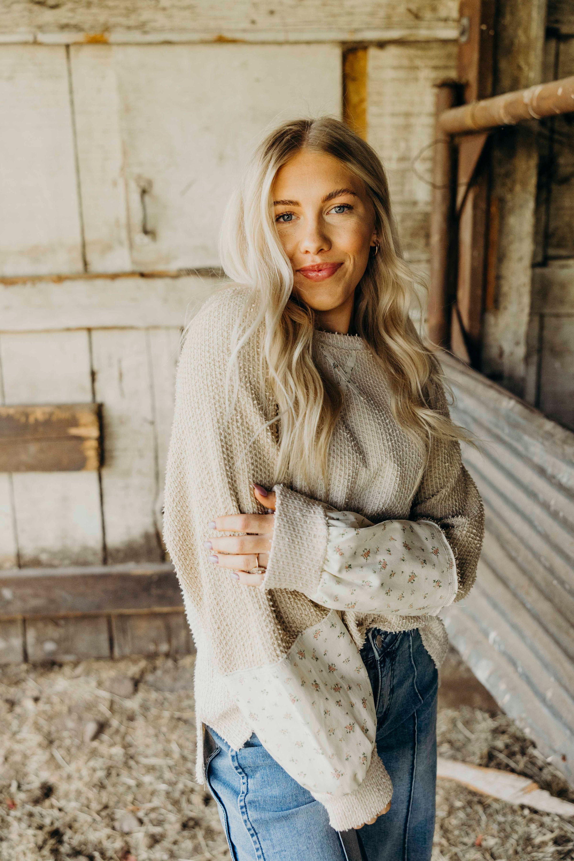 Stay cozy and stylish this fall with The Brandy Sweater. Its playful cream color pairs perfectly with eye catching color block floral sleeves, while the raw edge detail and side slit add a fun, relaxed vibe. Featuring comfortable raglan sleeves, this western inspired sweater is perfect for layering on crisp autumn days.