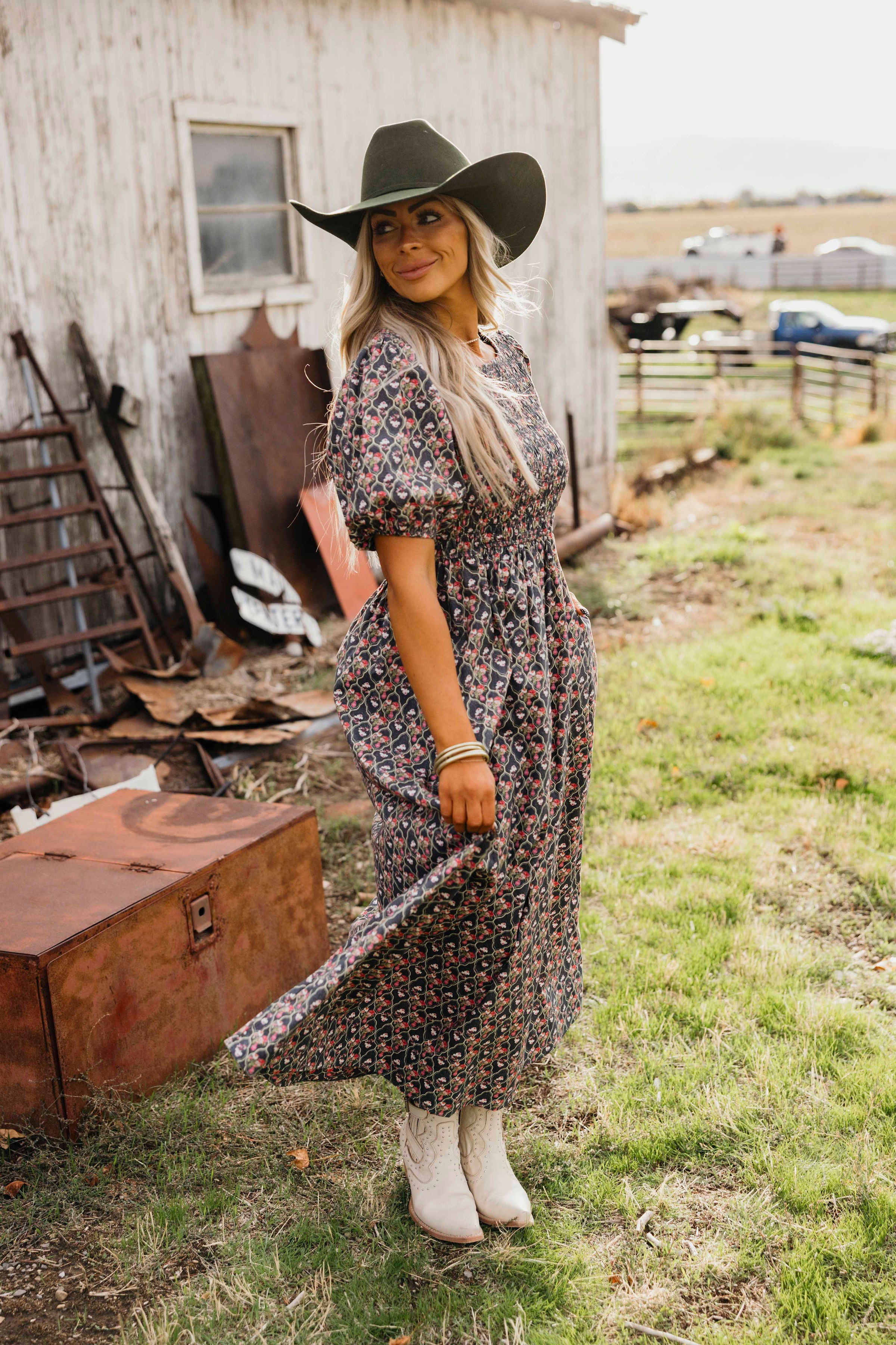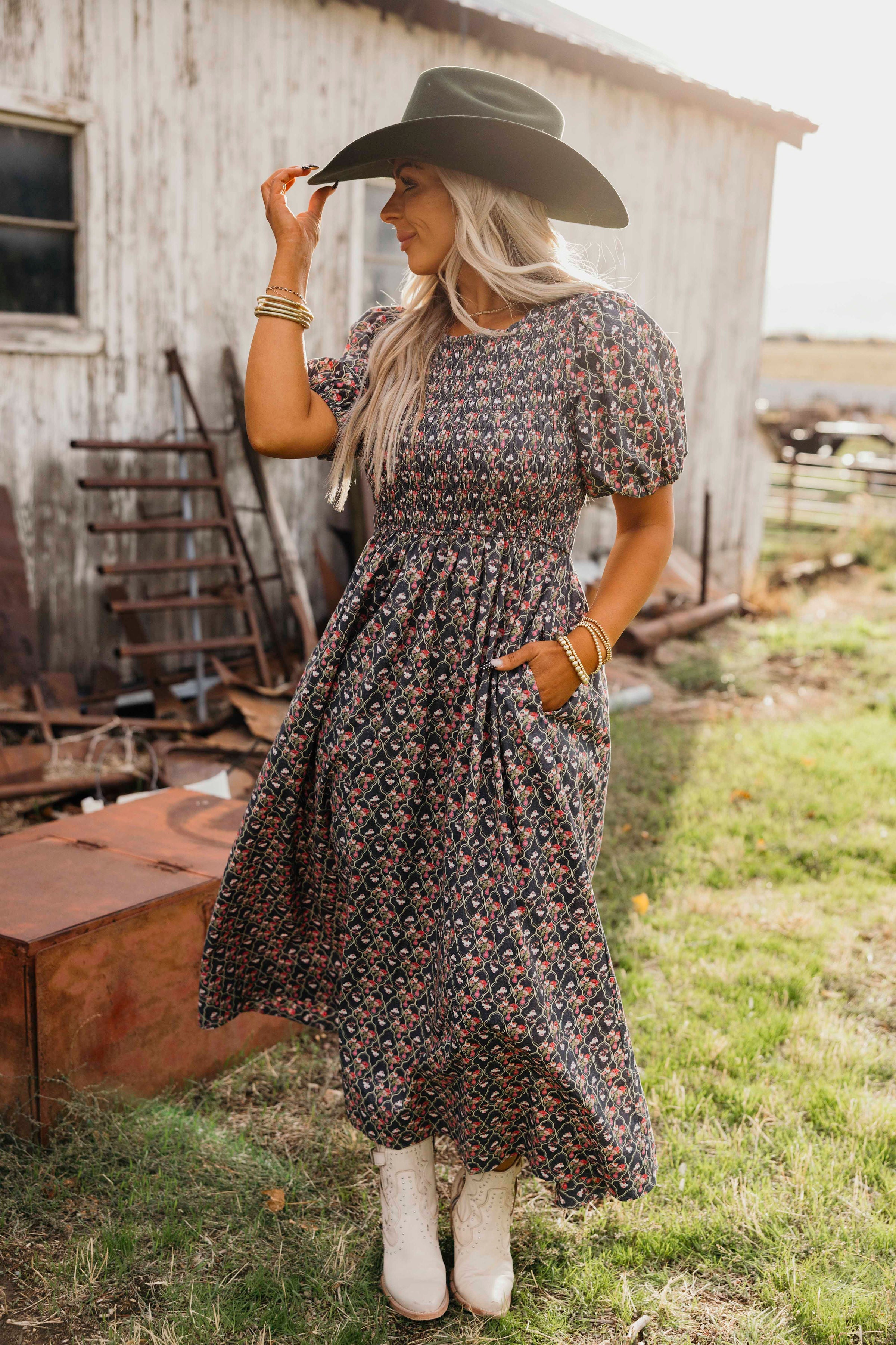 The Fenna Dress brings playful charm with its floral print and smocked bodice, perfectly blending western vibes and feminine style. Its short puff sleeves add a flirty touch, while the mid-length cut keeps it effortlessly chic. Practical side pockets and a lined interior ensure comfort and convenience throughout fall adventures. Embrace cozy days with a dress that’s as fun as it is flattering.