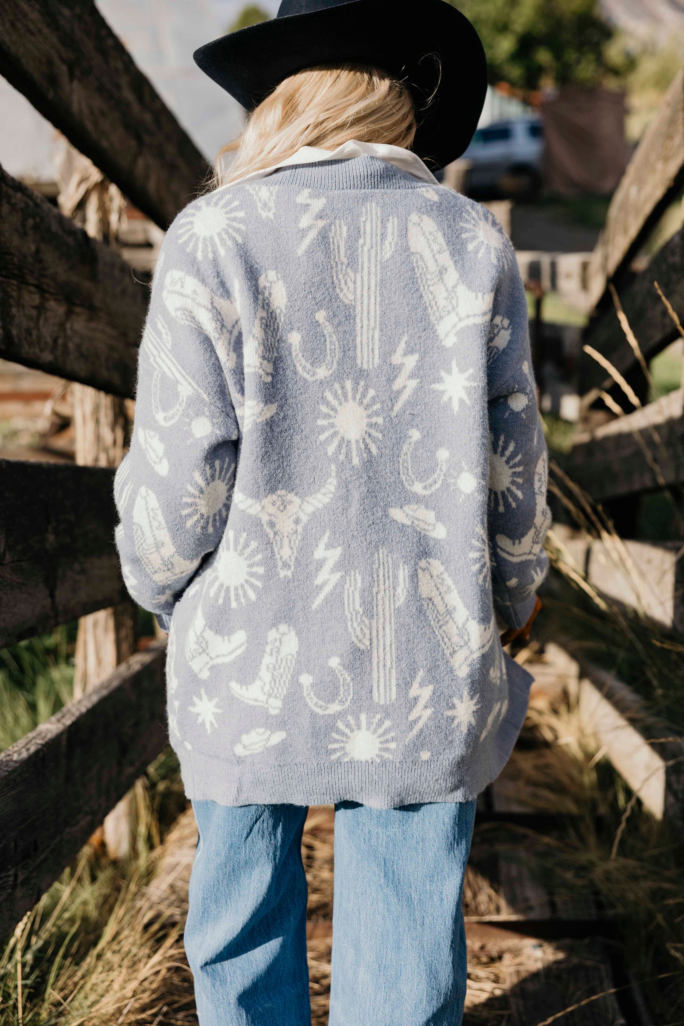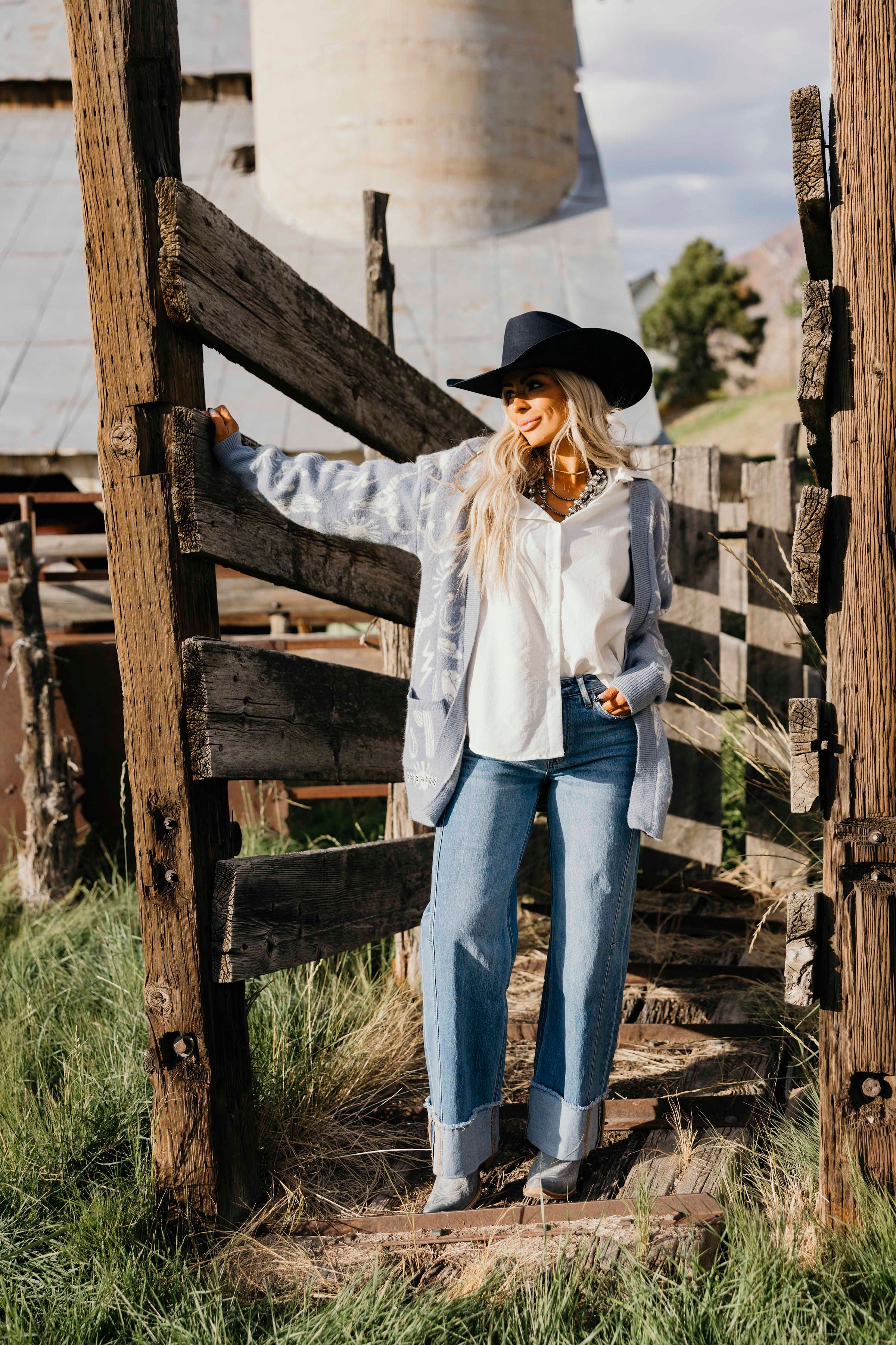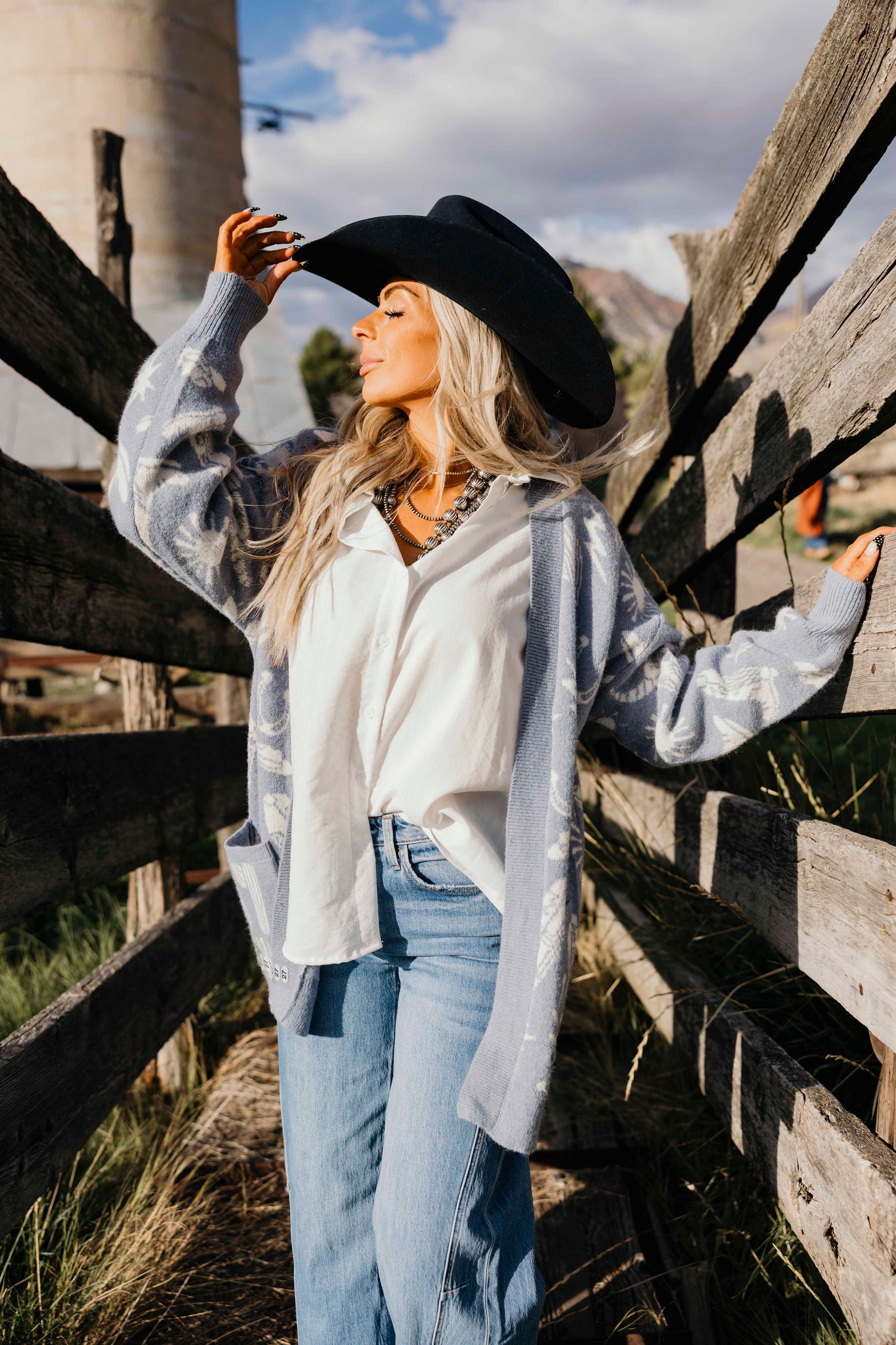 Cozy up this fall with The Pippin Cardigan, your new oversized favorite. This blue western cardigan features a relaxed drop shoulder and eye catching western print that brings playful charm to any outfit. With long sleeves, an open front, and handy front pockets, it’s perfect for layering on crisp days while keeping you effortlessly cool and comfy.