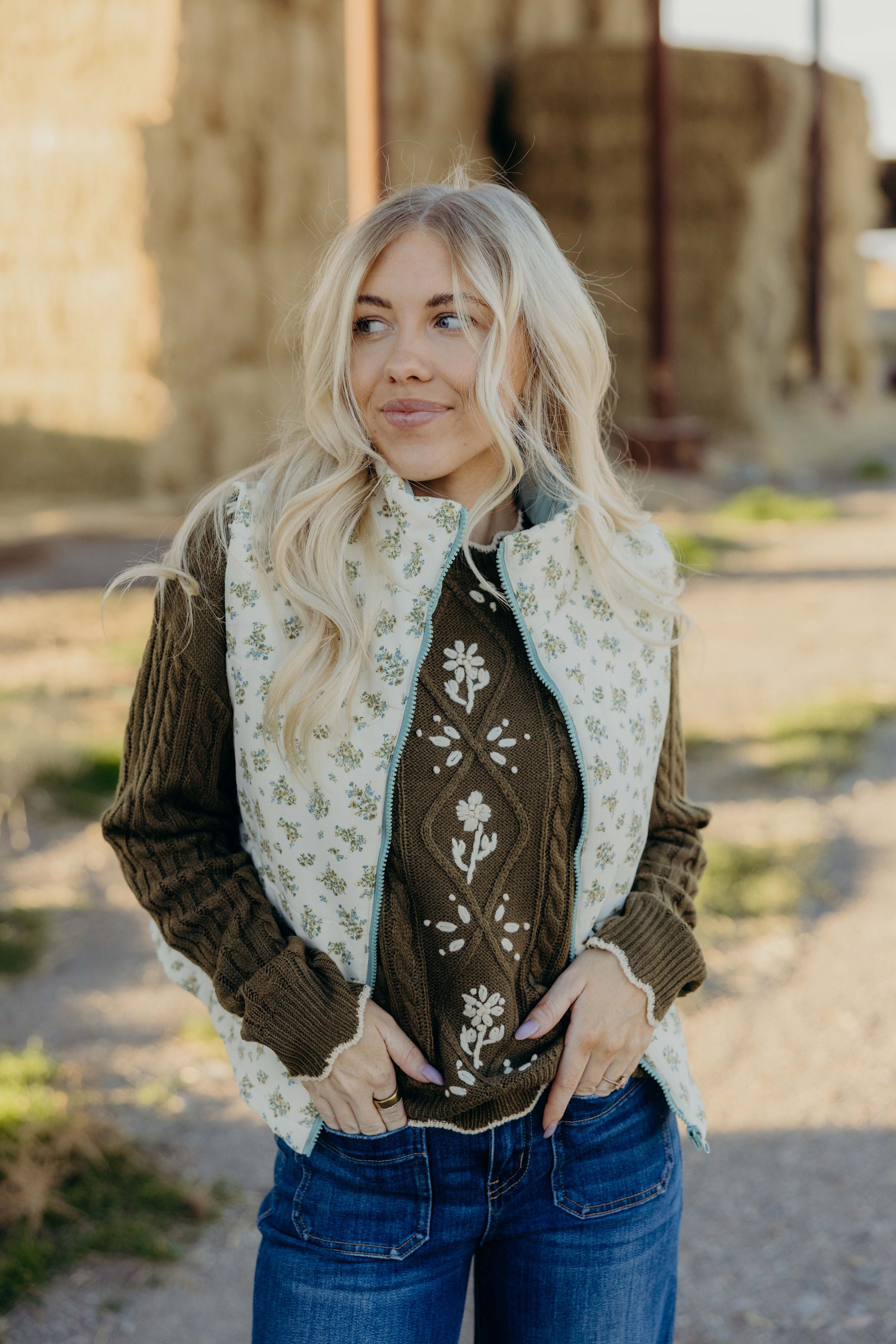 The Roswell vest combines a refined floral design with practical features for everyday elegance. Crafted from light corduroy, this puffer vest offers gentle warmth without bulk. A convenient zip up front and discreet pockets enhance its functional appeal, making it an ideal layering piece for sophisticated, effortless style.