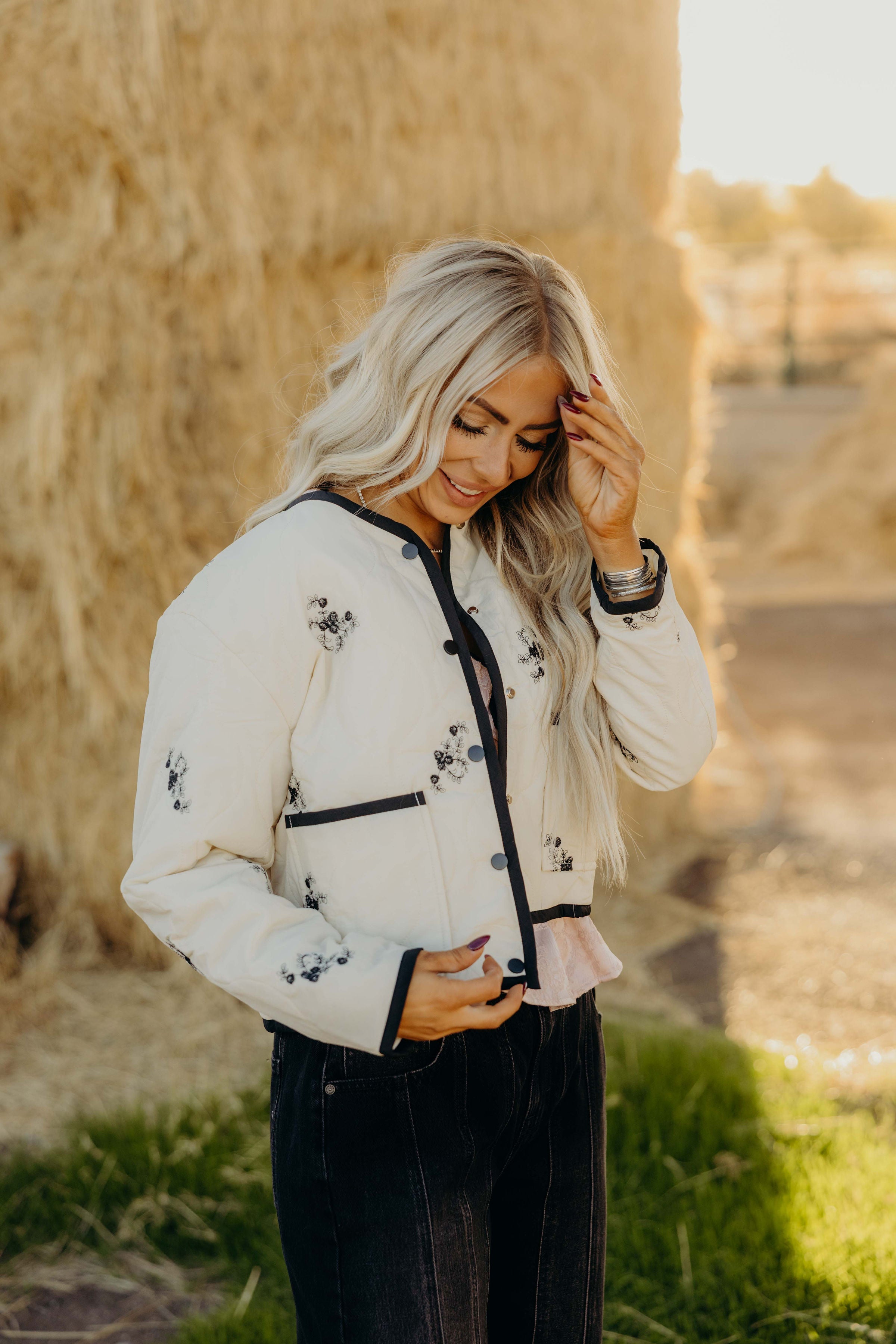 The Eveline is your new go-to layer for effortless style. This cream and black quilted jacket features intricate embroidery that adds personality to any outfit whether you're running errands or meeting friends for coffee. The quilted construction keeps you cozy without the bulk, while the classic color combo pairs with everything in your closet. Throw it on and instantly elevate your everyday look.