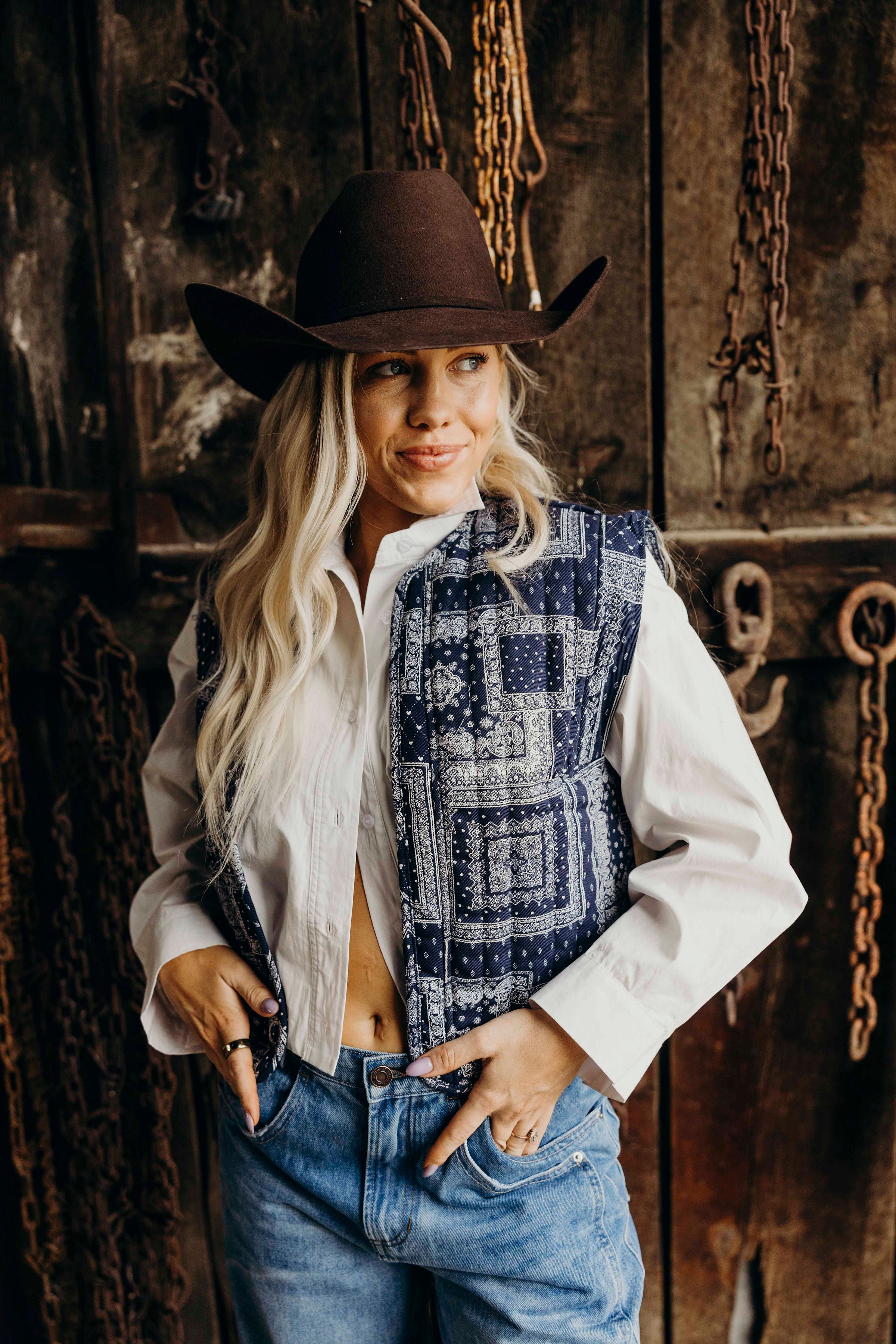 Elevate your fall wardrobe with The Finch Vest, a navy western-style piece featuring a bold bandana print. This sleeveless, open-front vest is fully lined for comfort and layering ease. Perfect for adding a touch of rugged charm while staying stylishly warm on cooler days.