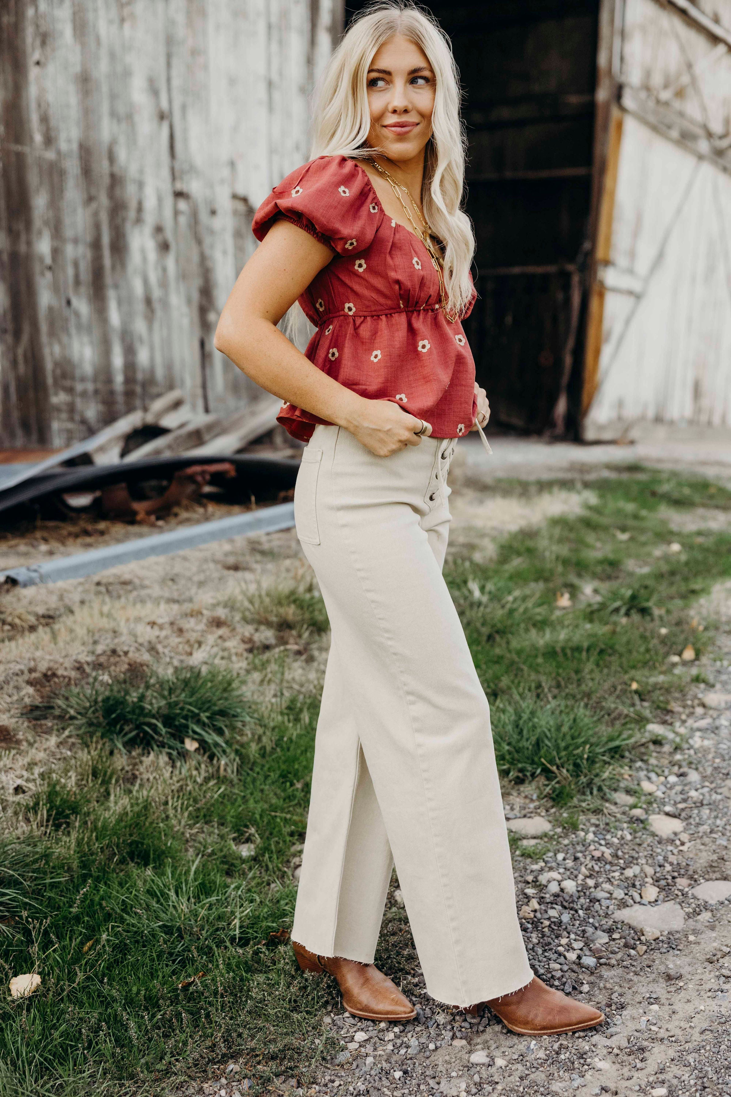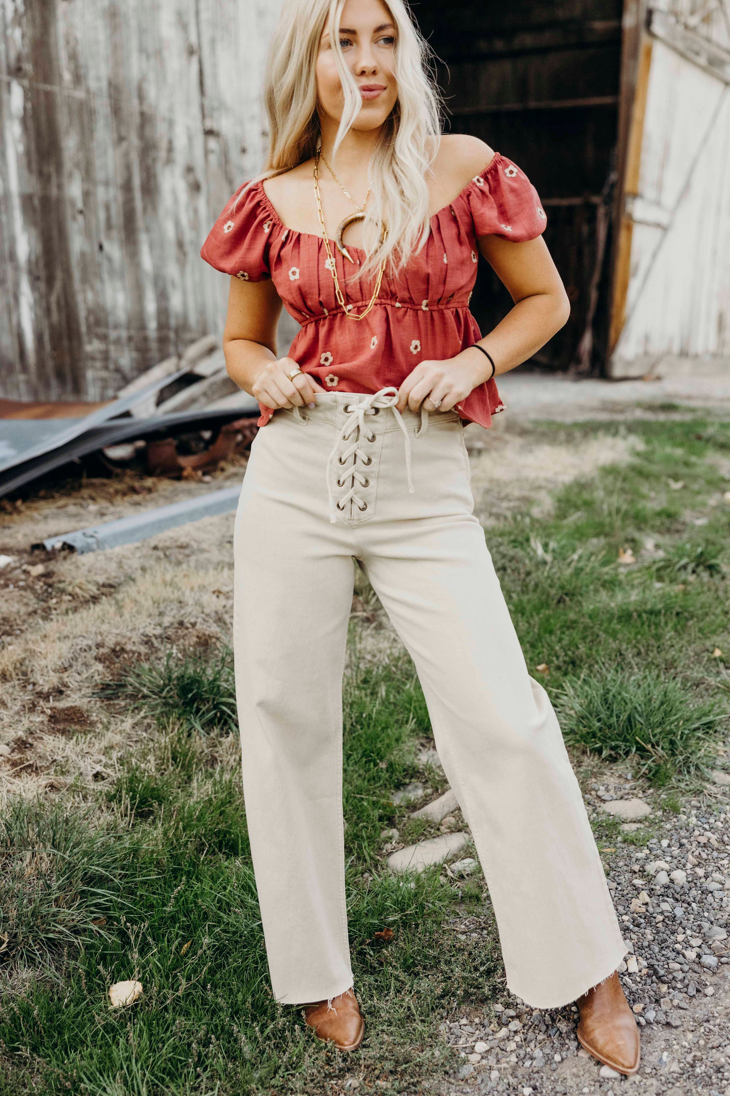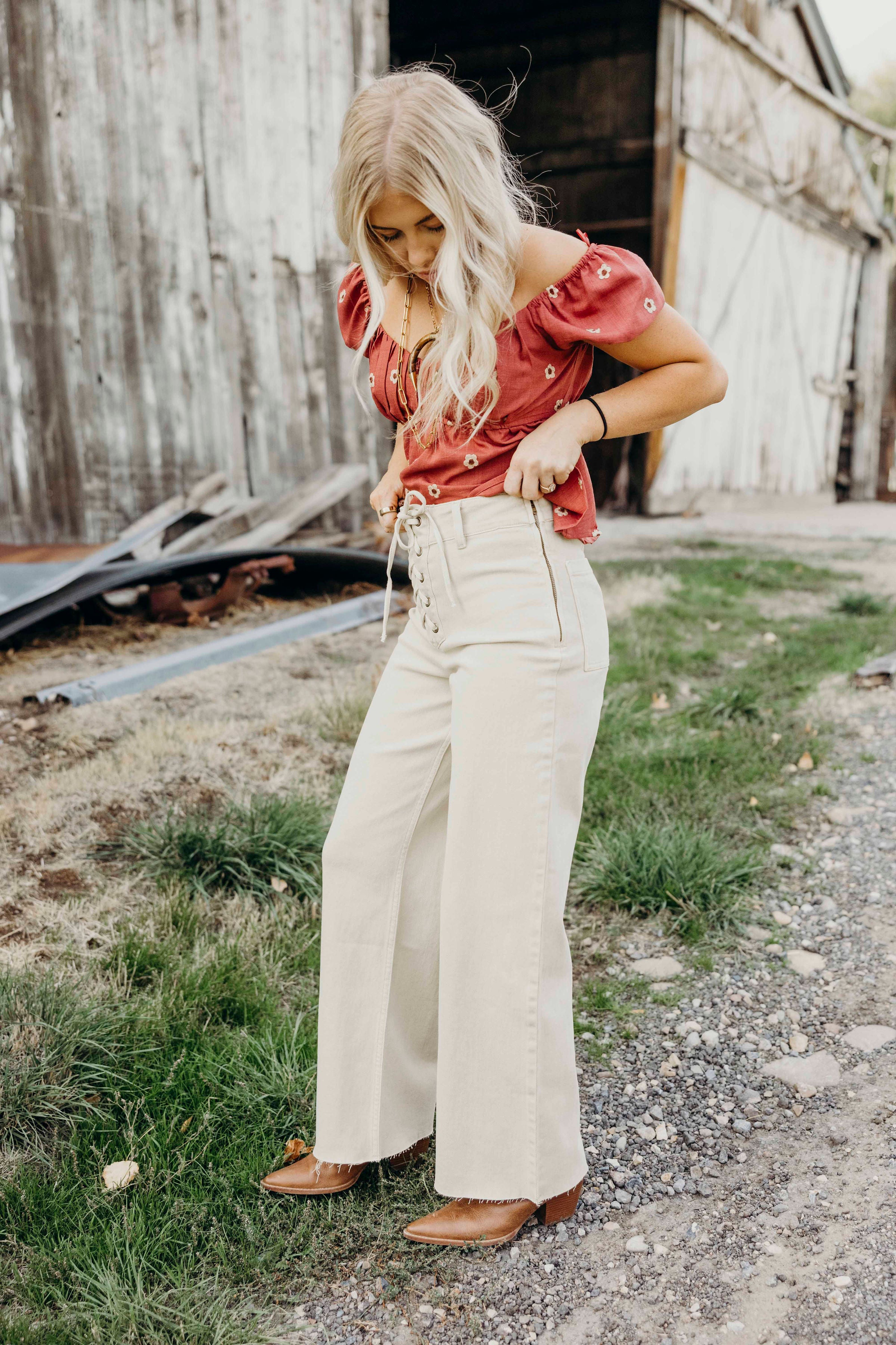 Expertly crafted from a soft, washed beige fabric, The Jae Pants offer both comfort and style. The lace up front and raw hem add unique details to these mid-rise western pants, while the stretch and straight leg design provide a flattering fit. Perfect for spring, these pants are a must-have for any wardrobe. (ONLINE ONLY)