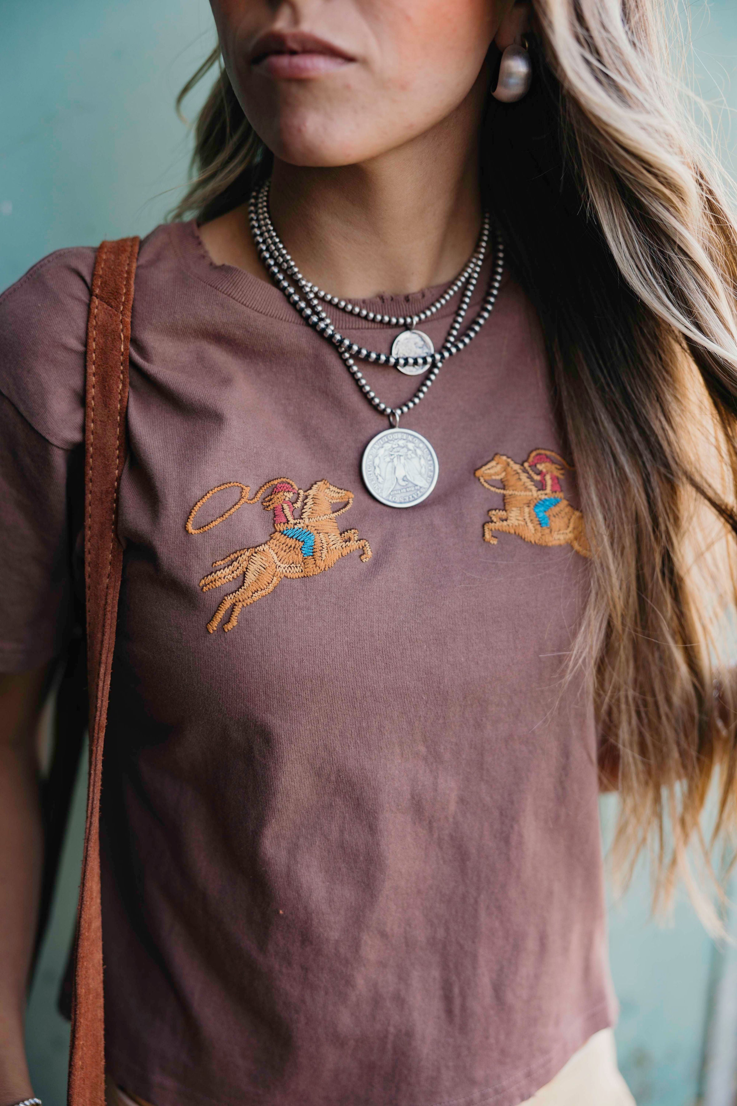 Embrace fall vibes with The Silas Tee, a brown western graphic tee featuring a playful puff stitch cowboy roping design. Its cropped length and seamless construction with distressed edges add a fun, rugged twist to your casual wardrobe. Perfect for layering or solo wear, it’s your go-to tee for autumn adventures with a spirited western flair.