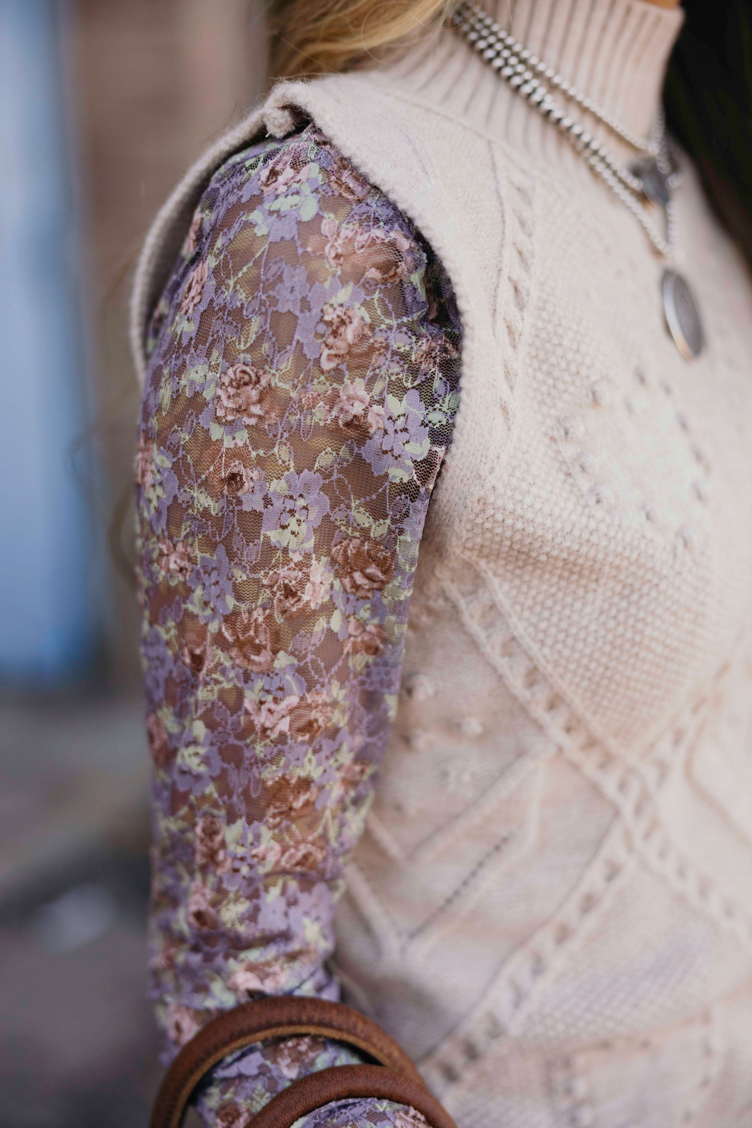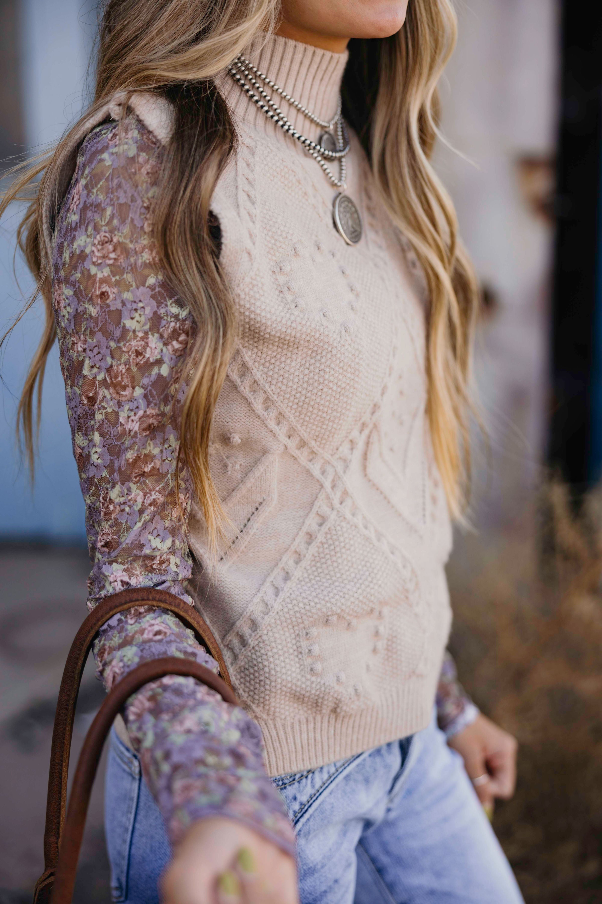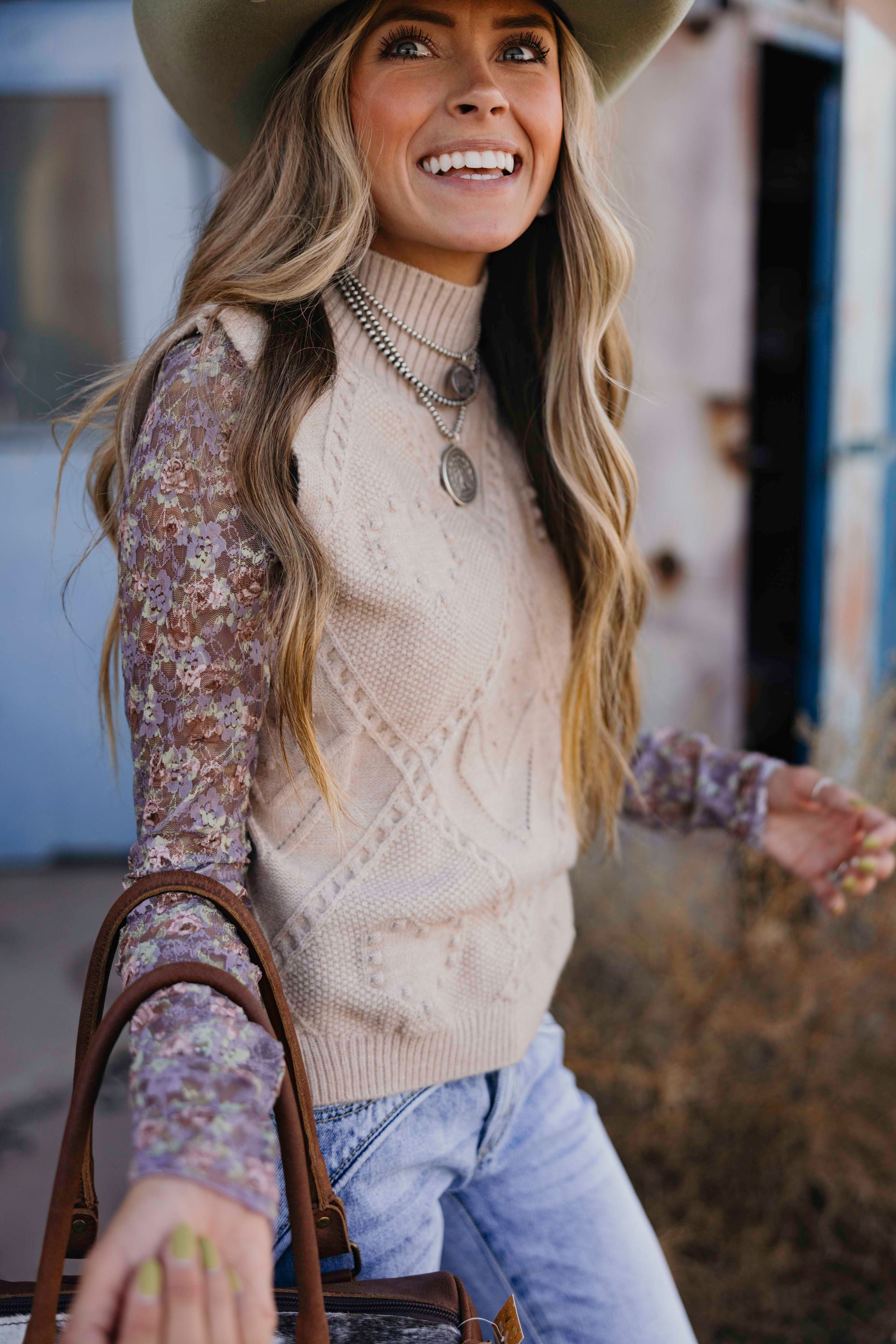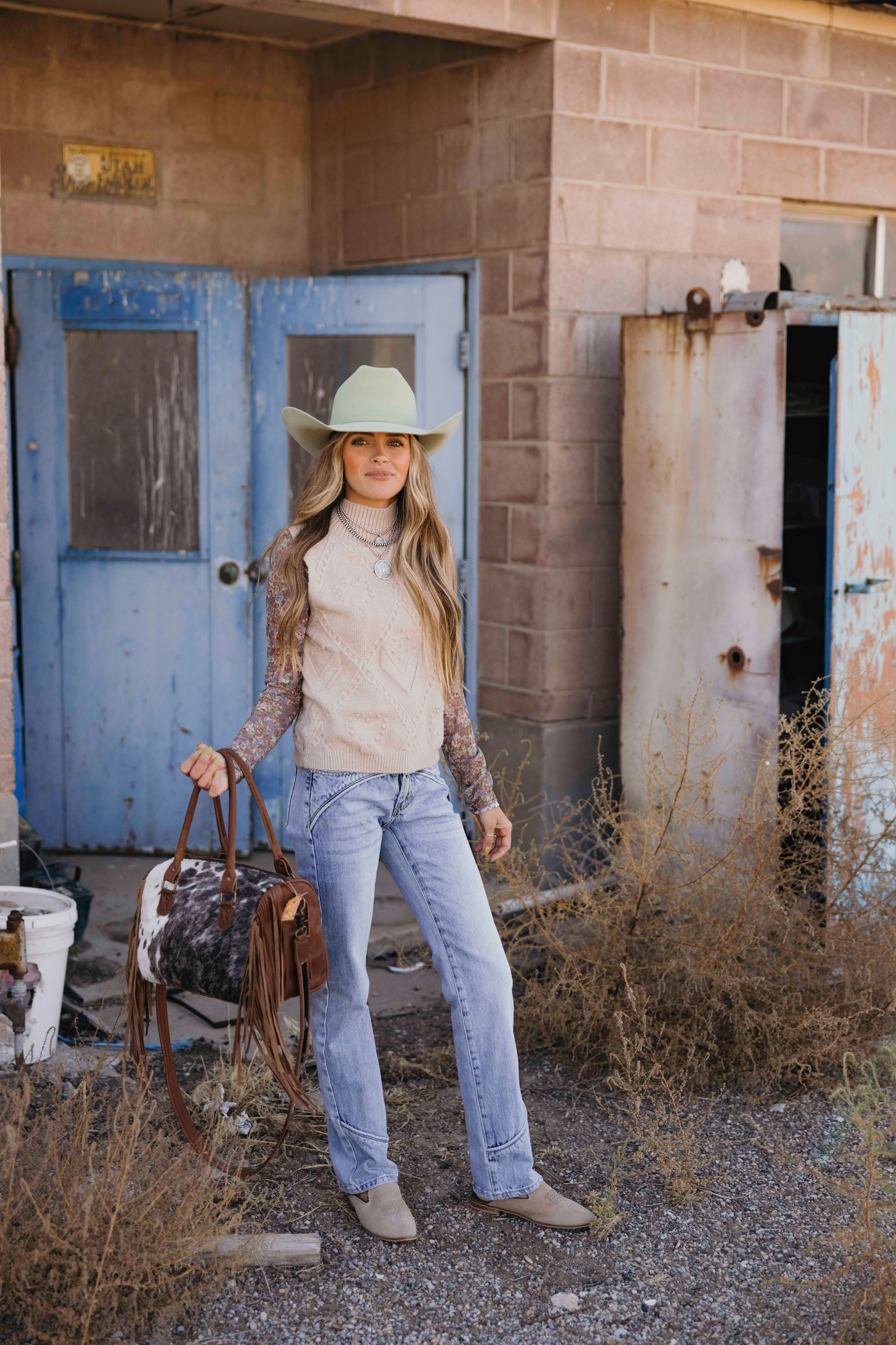 Embrace cozy fall style with the Tessa Sweater Tank. This taupe, cable-knit tank features a high neck and sleeveless design, balancing warmth and breathability. Its slightly cropped length pairs perfectly with high-waisted jeans or skirts, making it an easy choice for layering in cooler weather. Add a touch of western-inspired charm to your seasonal wardrobe with this versatile knit piece.