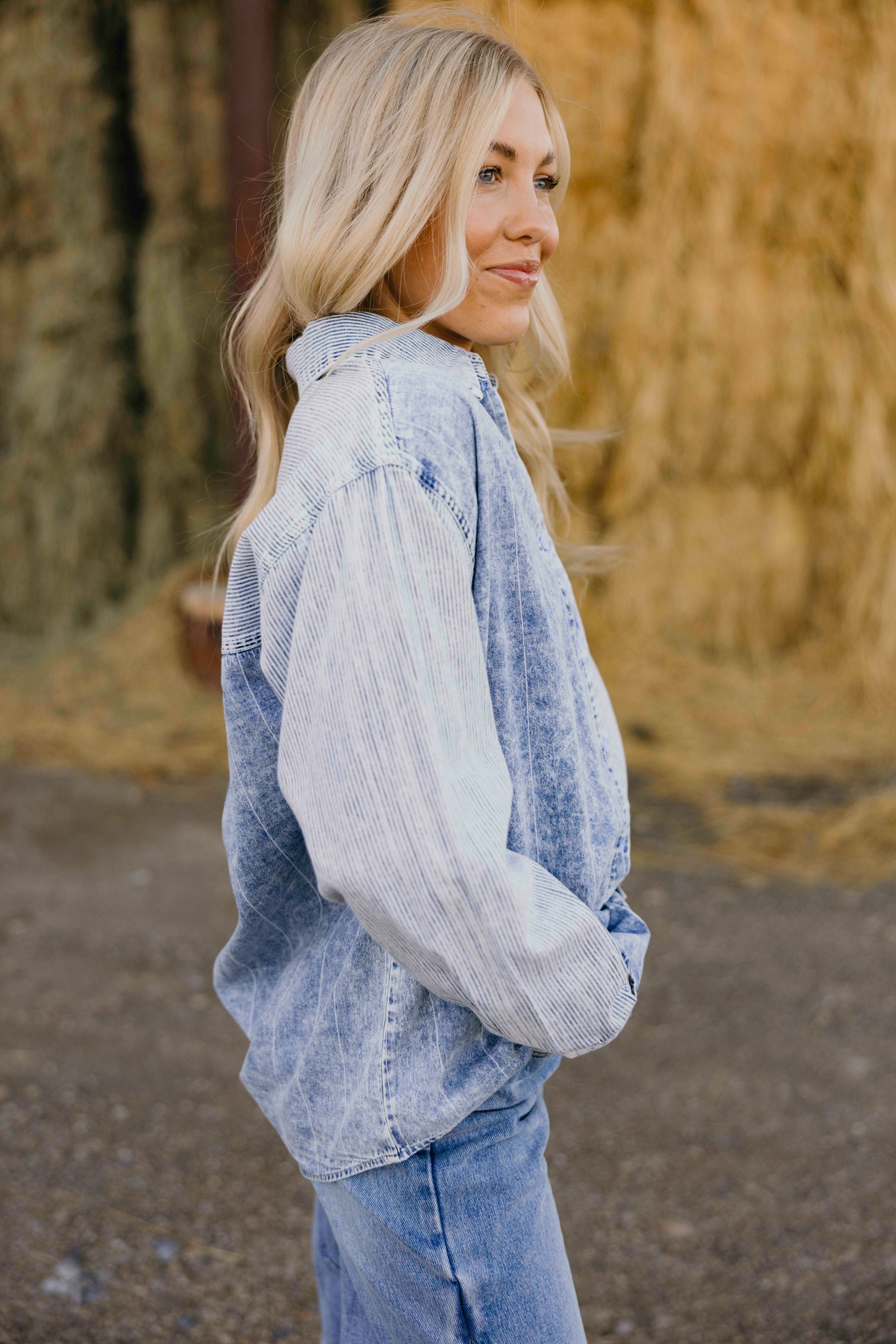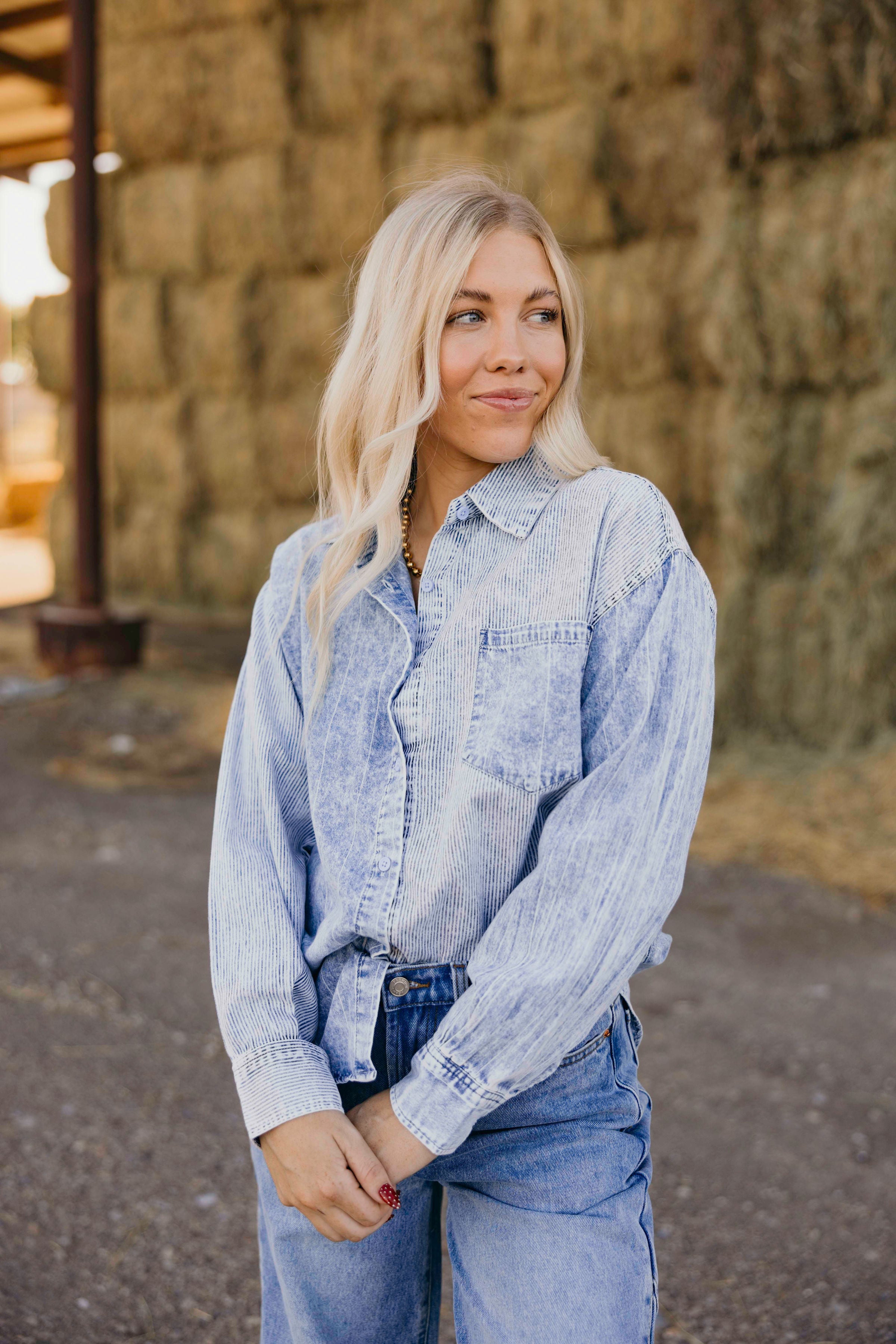 Embrace effortless style with The Scarecrow Shirt, a light indigo denim western shirt designed for fall. Its oversized fit and drop shoulder offer relaxed comfort, while the button-down front and long sleeves bring classic appeal. Featuring a convenient front patch pocket, this shirt blends rugged charm with everyday practicality, making it an essential layering piece for a confident, casual look.