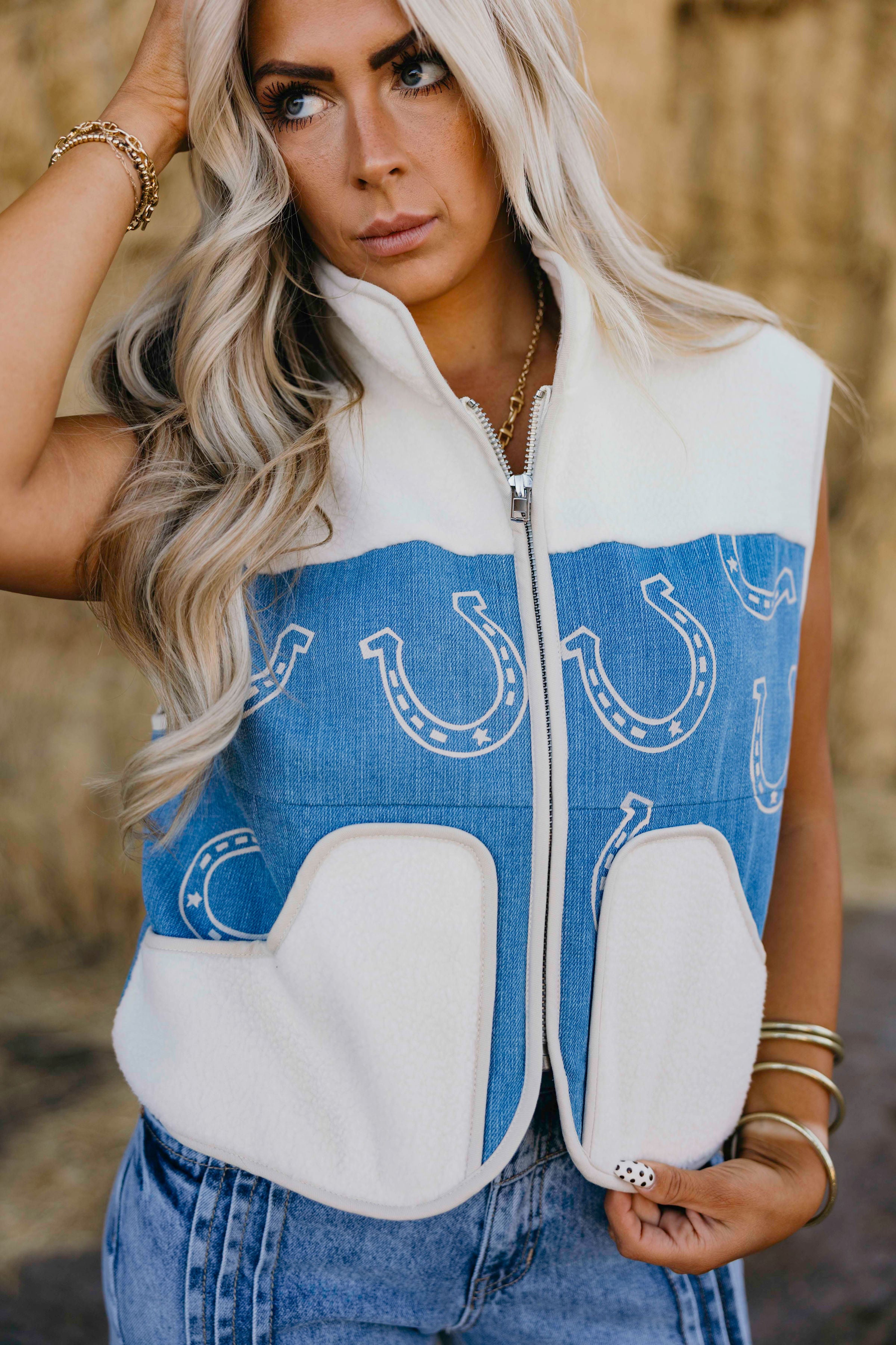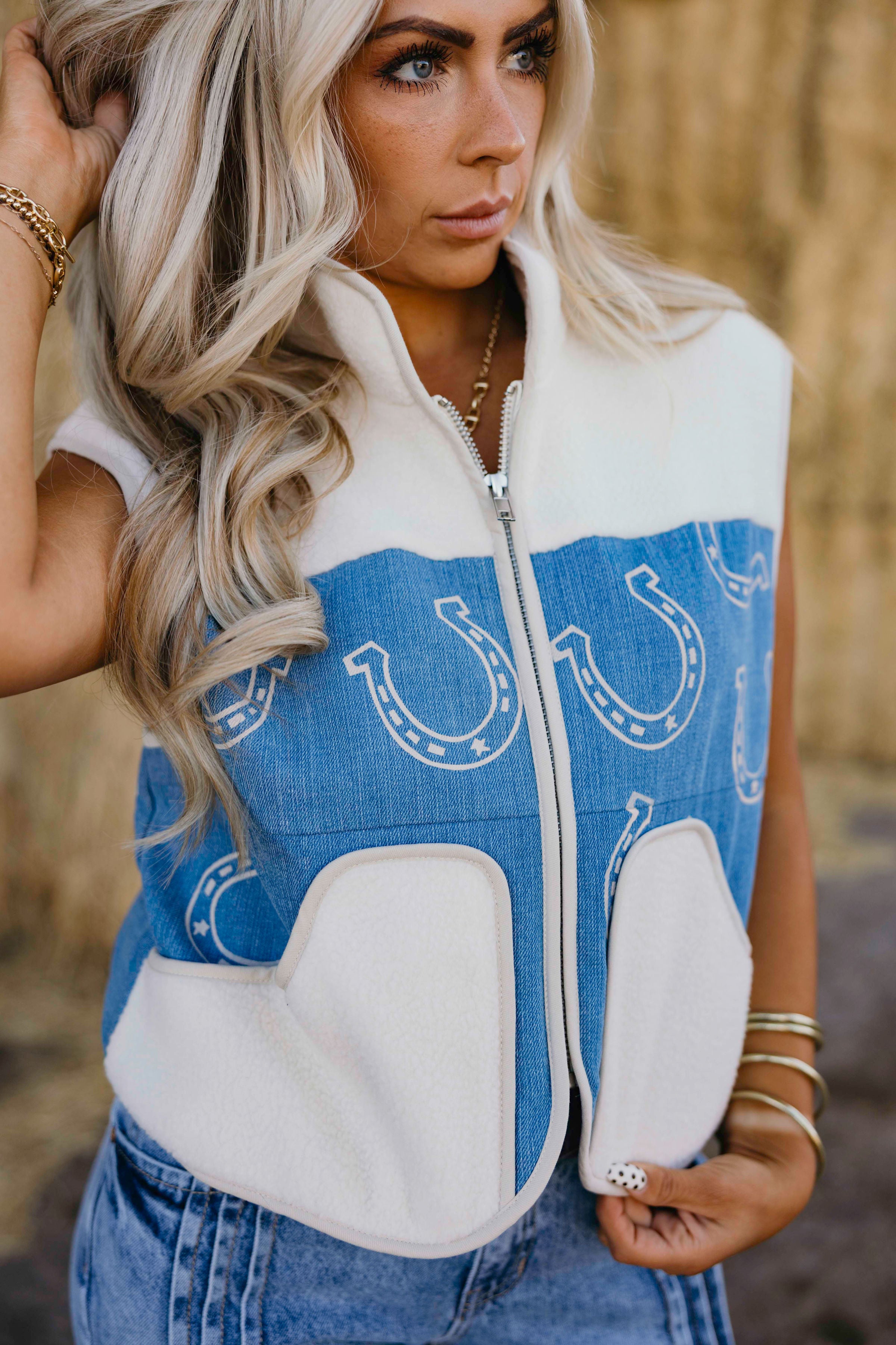 Mix cozy sherpa with cool denim in The Shiloh Vest, your go-to for fall layering. Featuring a playful horseshoe print and an easy zip front, this oversized western vest brings a fun twist to classic style. Perfect for adding warmth and attitude to any outfit!