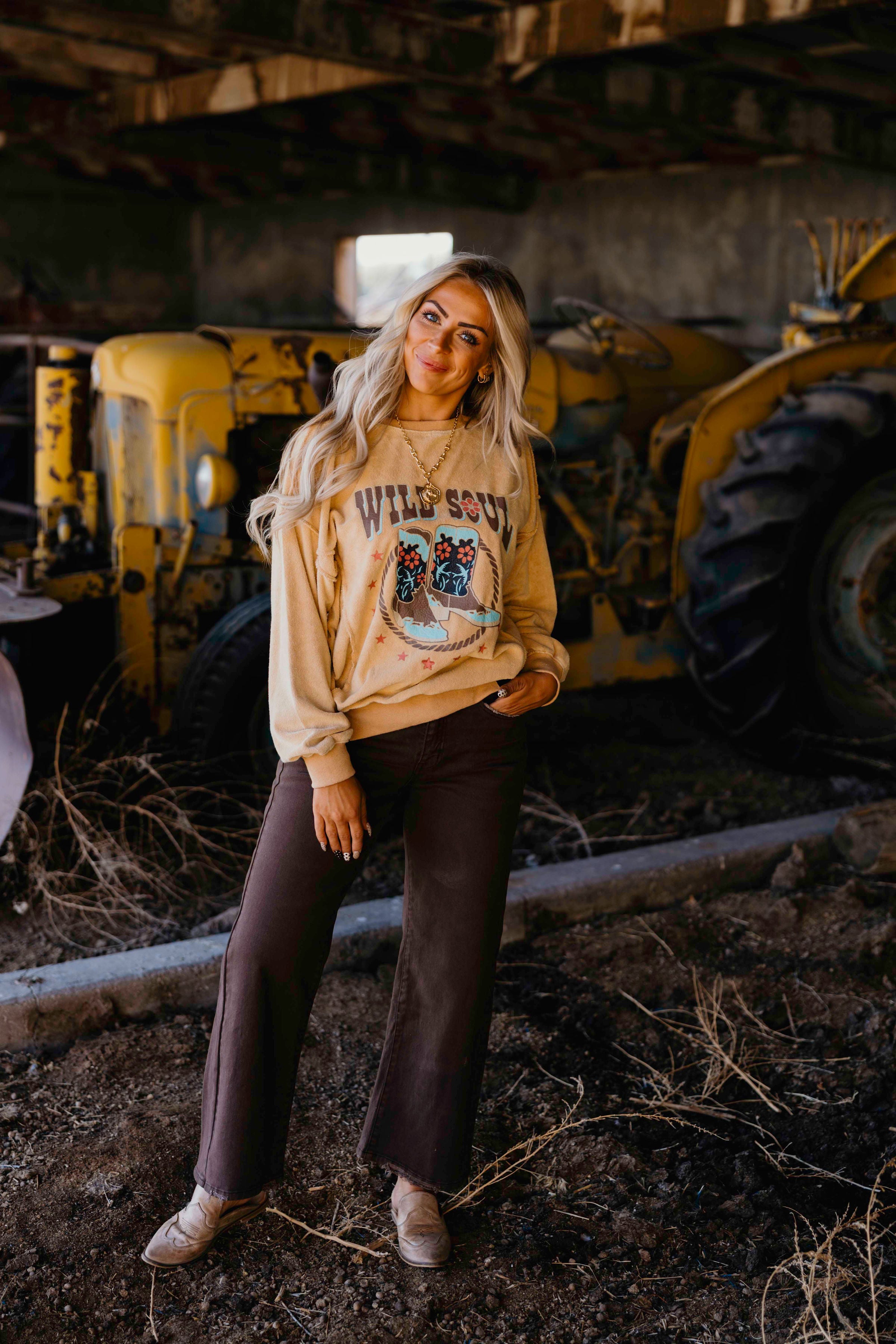 Embrace your adventurous spirit with the Wild Soul sweatshirt. This mustard-colored, graphic-printed piece crafted from soft terry cloth keeps you cozy while showing off your cowboy boots and free spirit. Perfect for those who love a playful touch in their casual style.
