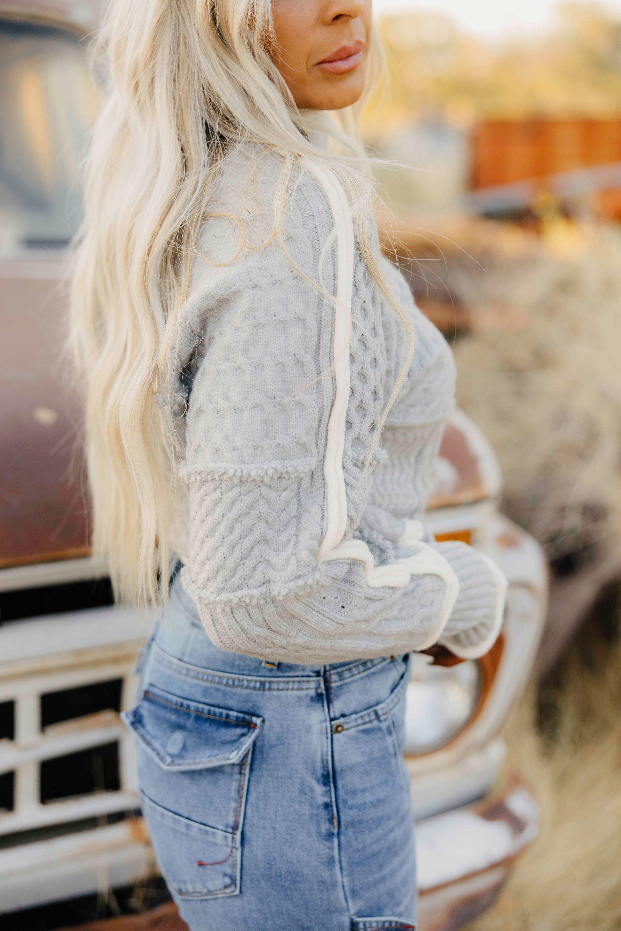 Elevate your fall wardrobe with The Aster Sweater, a cozy grey turtleneck designed for warmth and style. Featuring long sleeves and a classic cable knit, it’s enhanced by a crisp white contrast line detail that adds a subtle, western-inspired edge. Perfect for layering or wearing solo, this sweater brings comfort and character to your seasonal look.