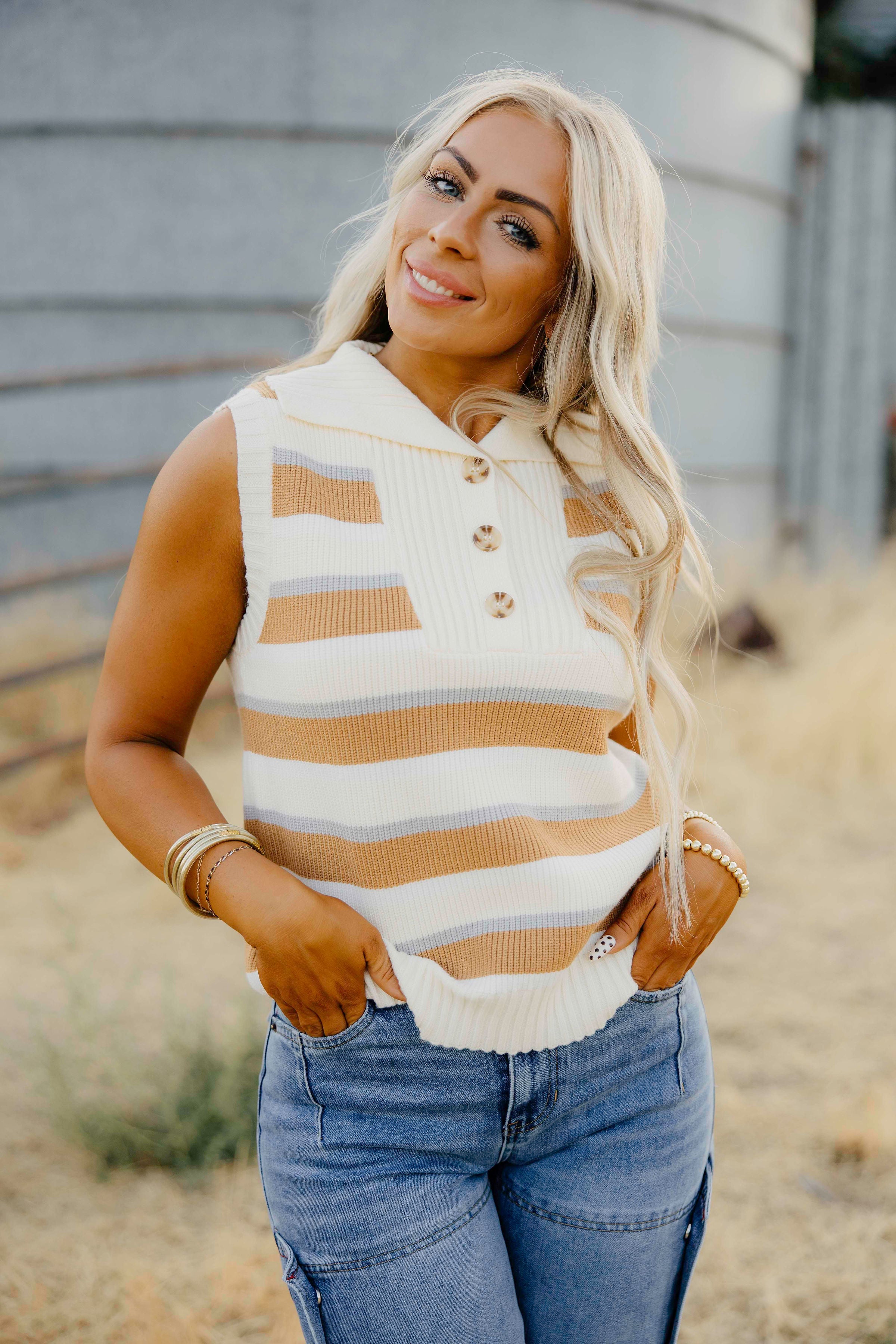 The Lionel Vest blends timeless Western style with cozy fall comfort. Crafted in a warm cream and camel palette, its striped print and classic collar give it a distinctive, stylish edge. The half button-down design adds easy layering versatility, perfect for crisp autumn days. Elevate your seasonal wardrobe with this statement vest that pairs effortlessly with your favorite shirts and jeans.